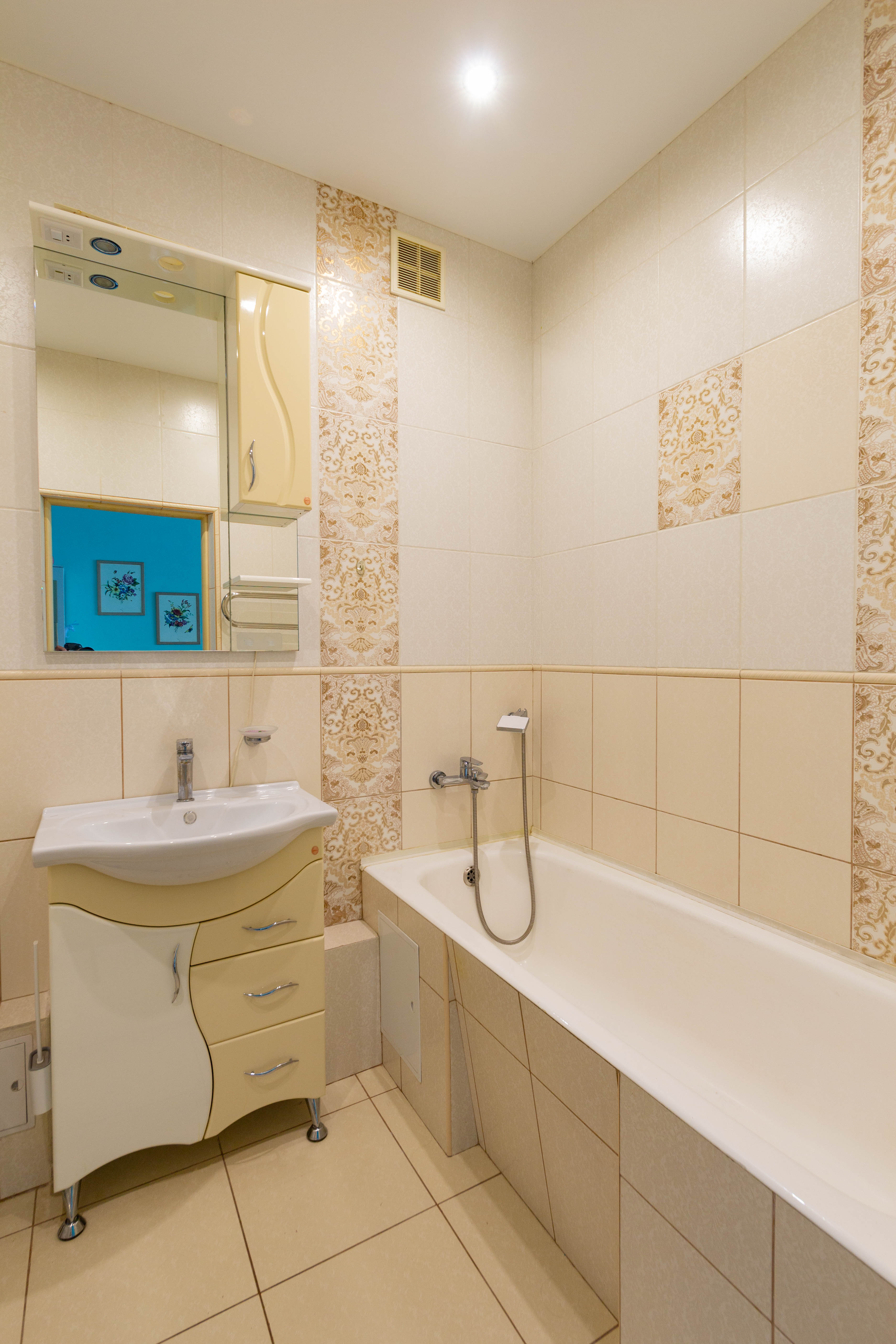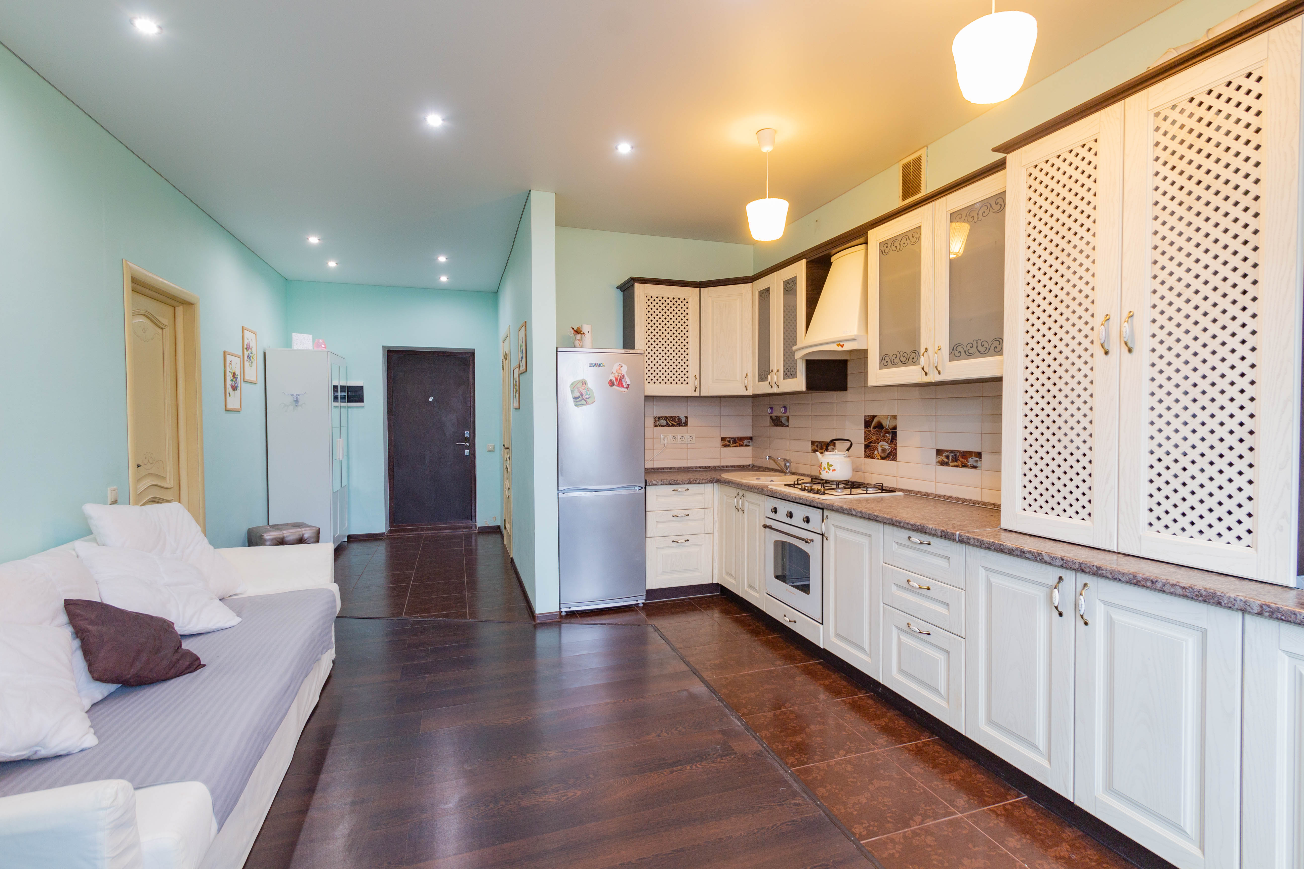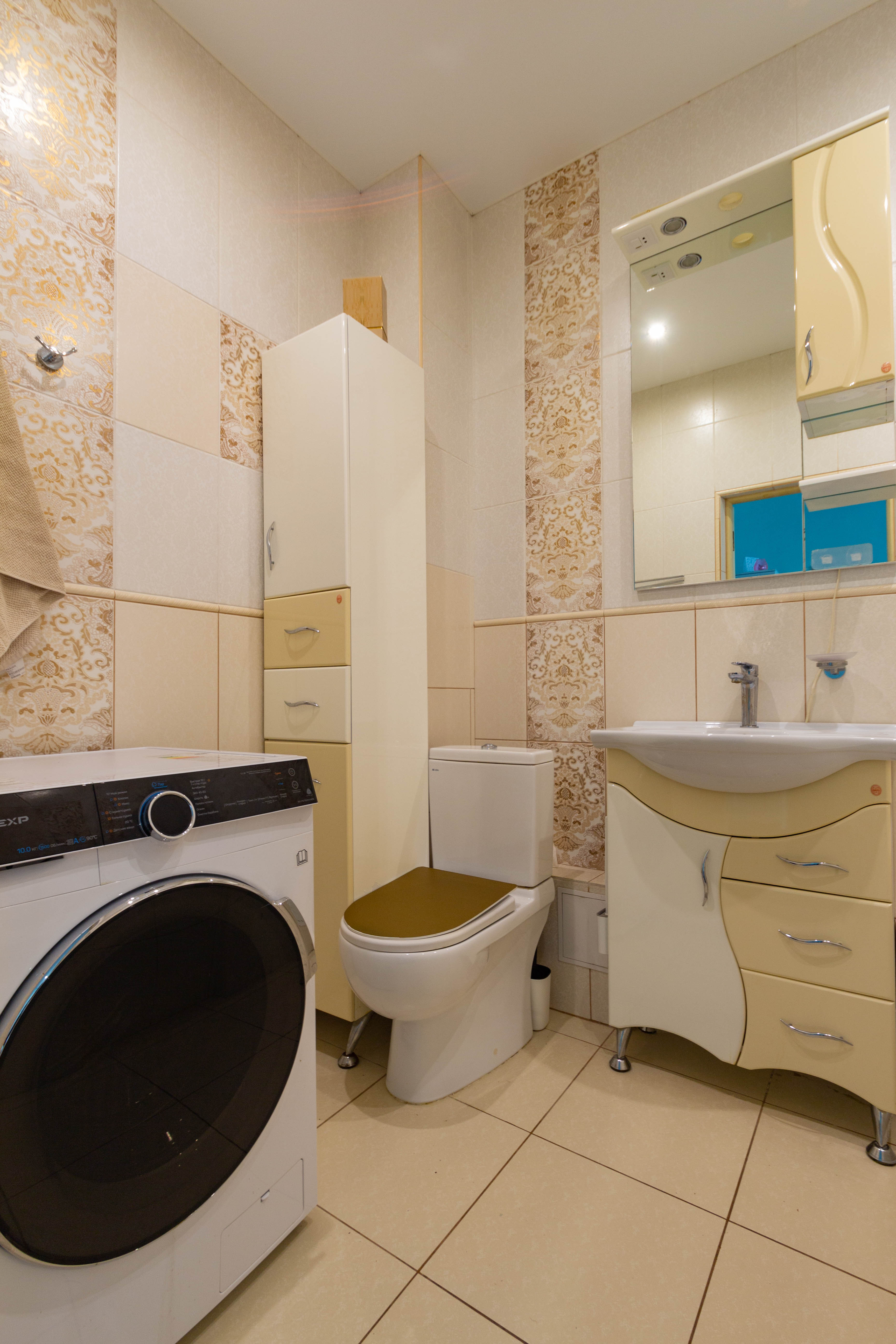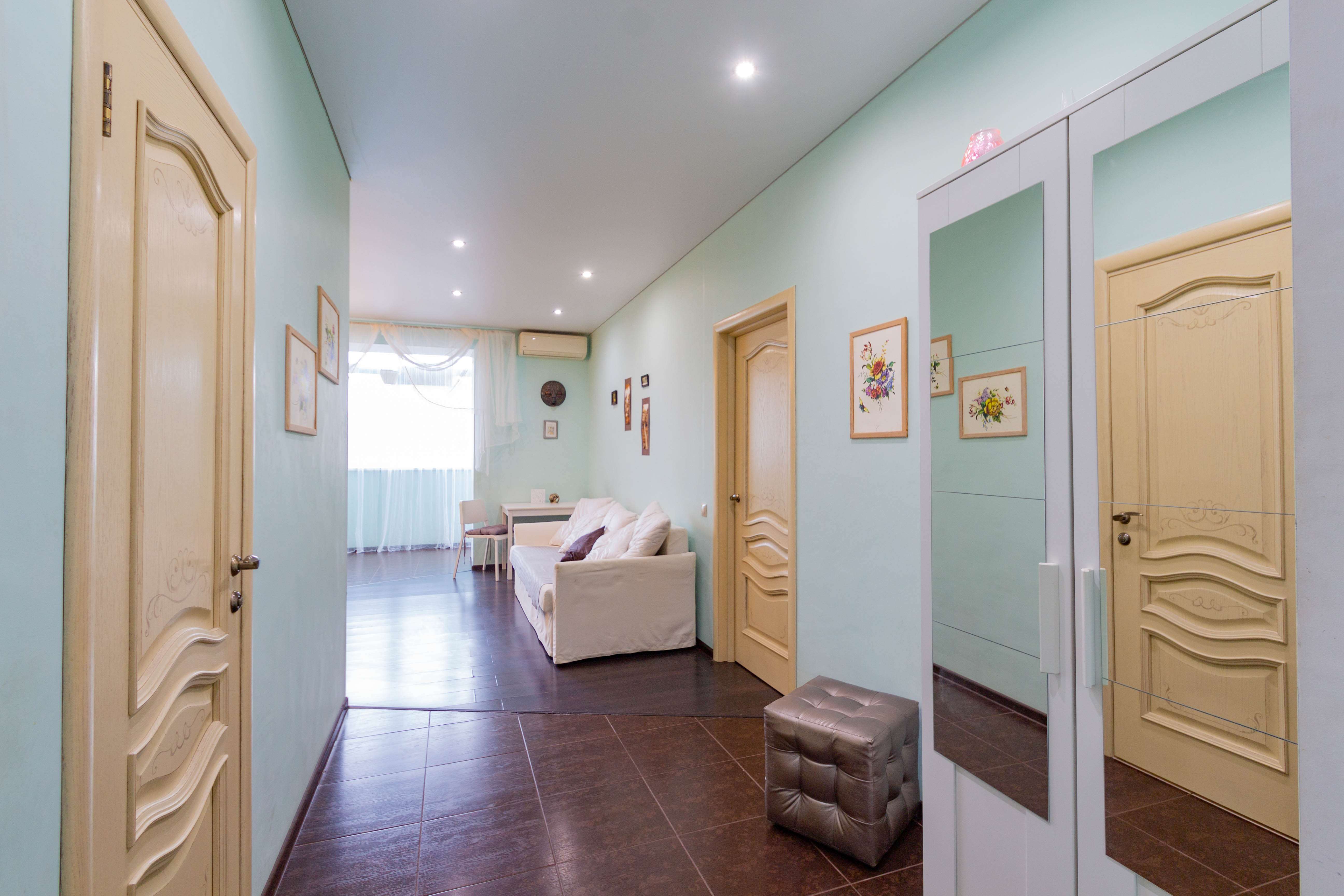 Площадь жилья составляет 58 м2. Эргономичная планировка вмещает в себя парадный холл, ванную комнату, кухонную зону, гостиную с выходом на застекленную и утепленную лоджию (жилая площадь), спальную комнату, гардеробная. В квартире выполнен ремонт, с использованием высококачественных материалов. Кухня и межкомнатные двери выполнены из массива дерева. Кухня укомплектована встроенной итальянской бытовой техникой. Ванная комната оснащена европейской сантехникой, стиральная машина. В квартире установлено индивидуальное отопление (нагревательный котел Buderus), теплый пол. Двуспальная кровать c ортопедическим матрасом. В гостиной расположен раскладной диван на два спальных места. Установлен кондиционер. Заведен высокоскоростной интернет (оптоволокно) кабельное телевидение (включены в стоимость). Под первым этажом, цоколь, первый этаж высокий с балконом.