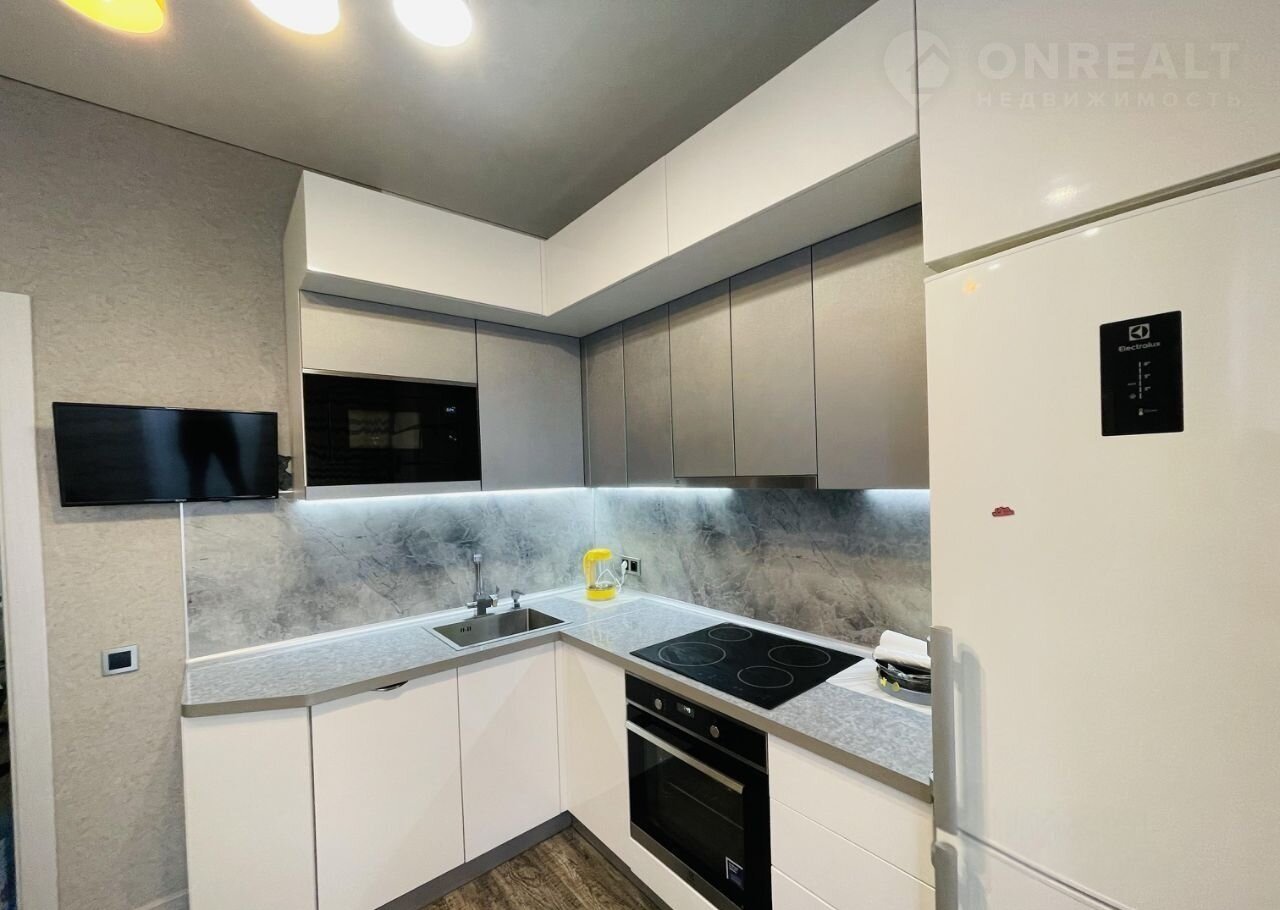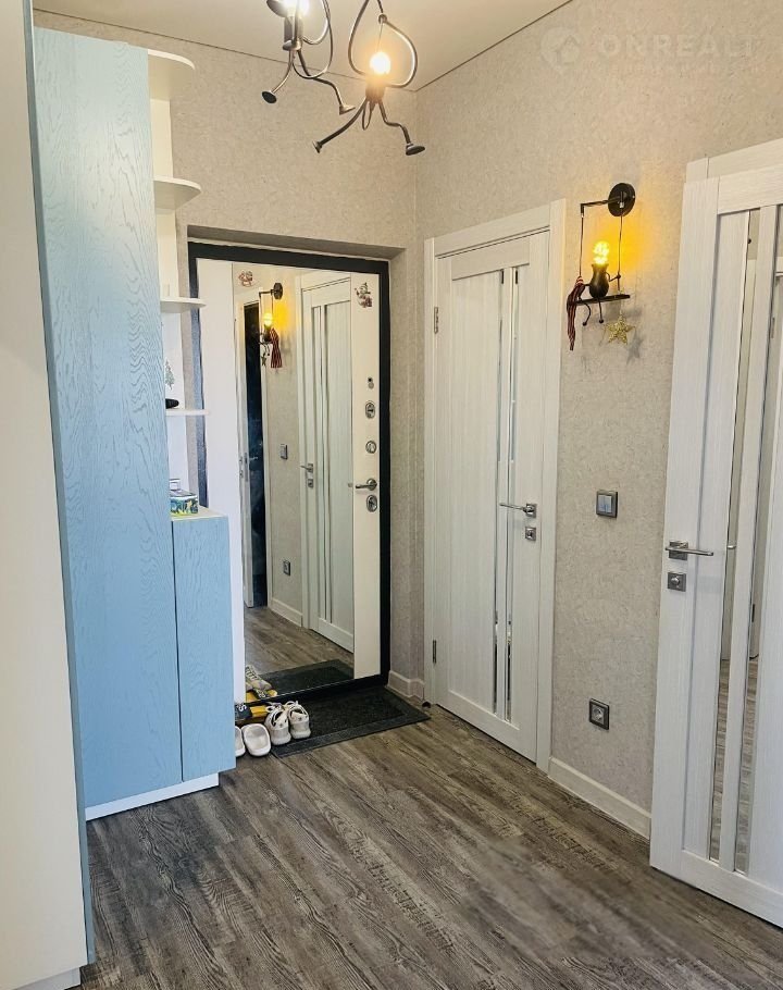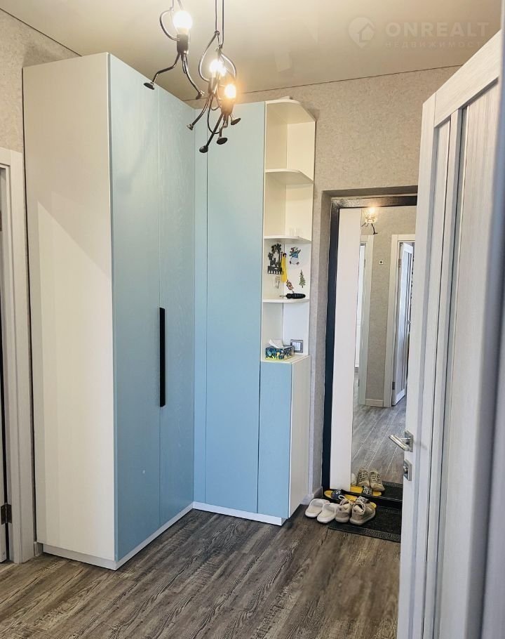 В прихожей гостей встречает стильный угловой шкаф для одежды голубого цвета, который добавляет изысканности интерьеру. Пройдя дальше, вы попадаете в кухню, где расположен угловой кухонный гарнитур белого цвета, оснащённый всей необходимой техникой для приготовления пищи и комфортного приёма гостей. Здесь же находится обеденный стол, за которым можно собраться всей семьёй или устроить дружеские посиделки.