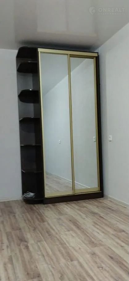 В жилой комнате установлен элегантный двухспальный раскладной диван в глубоких тёмных тонах, который не только служит местом для отдыха, но и легко трансформируется в дополнительное спальное место. Для вашего удобства предусмотрен вместительный зеркальный шкаф-купе, который помогает организовать хранение вещей и визуально расширяет пространство.