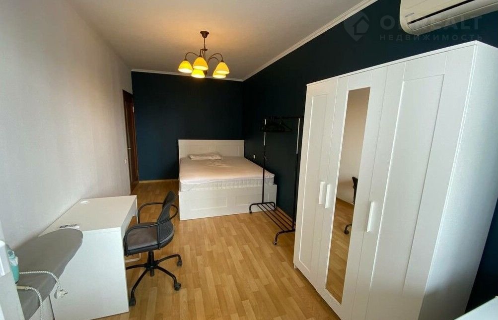 Первая комната оборудована всем необходимым для комфортного проживания: установлена двуспальная кровать с ортопедическим матрасом и встроенным местом для хранения, вместительный шкаф для одежды, письменный стол и современный кондиционер. Элегантную обстановку дополняет напольная вешалка.