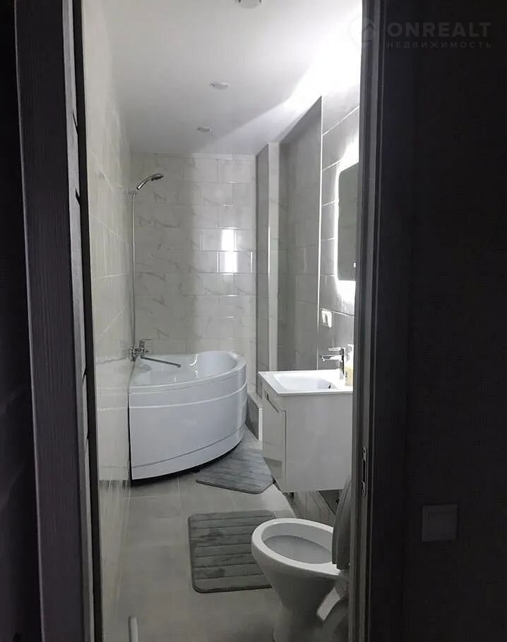 Особое внимание заслуживает современный санузел с джакузи и зеркальной конструкцией с подсветкой. Установлена стиральная машина.