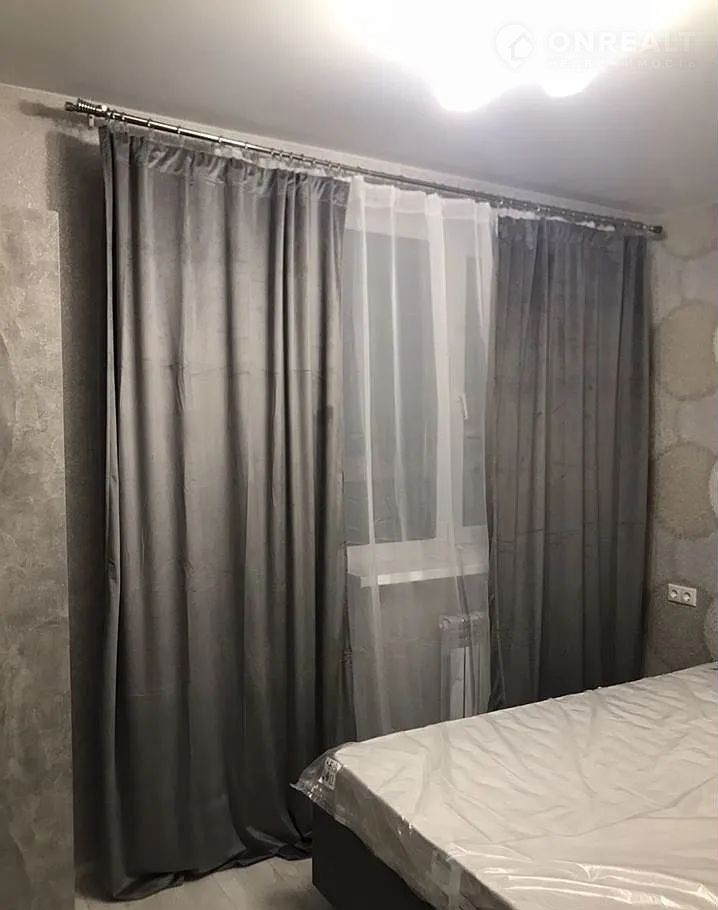 В спальной зоне установлена новая двуспальная кровать серого цвета с ортопедическим матрасом премиум-класса, создающая идеальные условия для здорового сна. Комната оборудована вместительным шкафом для одежды и удобной тумбой под телевизор, окна украшены стильными шторами.
