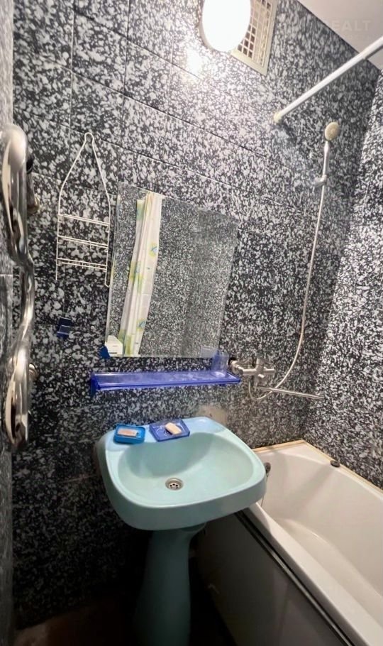 В квартире создана комфортная обстановка для проживания. В первой комнате установлен элегантный кожаный раскладной диван чёрного цвета, который станет главным акцентом интерьера. Для вашего комфорта установлен кондиционер, а также предусмотрены журнальный столик и небольшая стенка для хранения вещей.