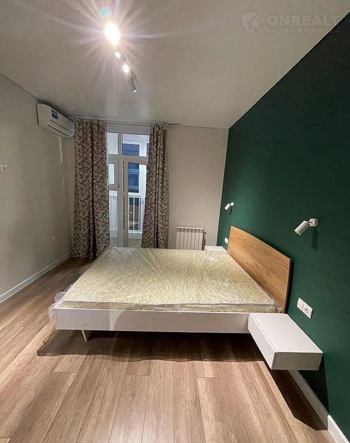 В квартире выполнен качественный современный ремонт, установлена новая мебель, создающая атмосферу комфорта и уюта. В жилой зоне установлена удобная двуспальная кровать с новым ортопедическим матрасом, обеспечивающим здоровый сон. По обеим сторонам кровати расположены стильные прикроватные тумбочки. Для хранения вещей предусмотрен вместительный шкаф и функциональный комод. Работает кондиционер для поддержания комфортного микроклимата.