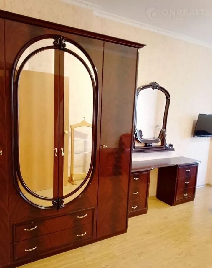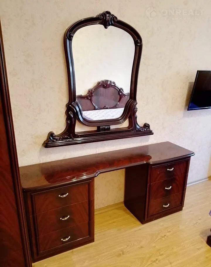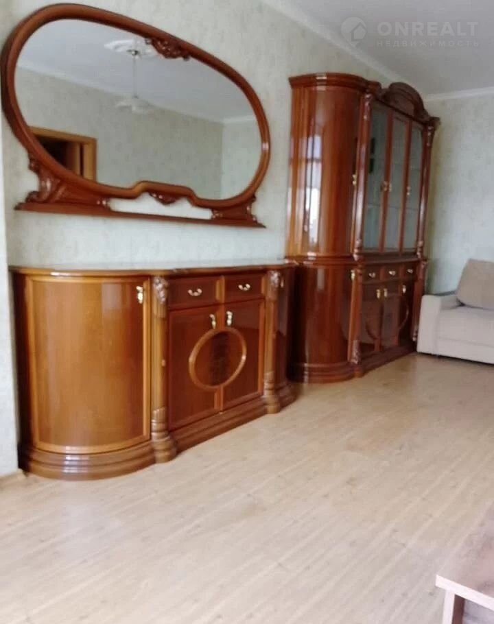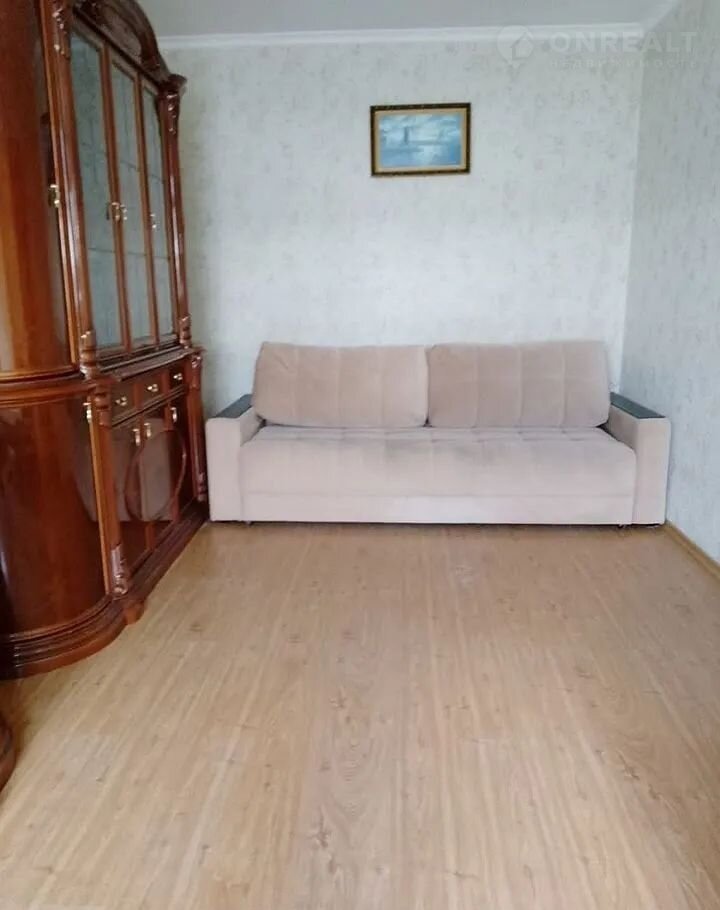 В первой комнате создана комфортная обстановка: установлен элегантный двухспальный раскладной диван бежевого цвета, дополненный стильным комодом и вместительной стенкой. Большое зеркало визуально расширяет пространство.