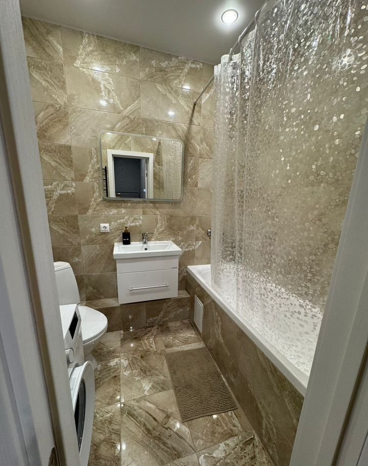 B квартире eсть всe необходимое для комфортного проживания: двуспальная кровать, кондиционер, холодильник, микроволновая печь и стиральная машина. Санузел совмещен. Также есть просторная лоджия, где можно наслаждаться утренним кофе и вечерним отдыхом.