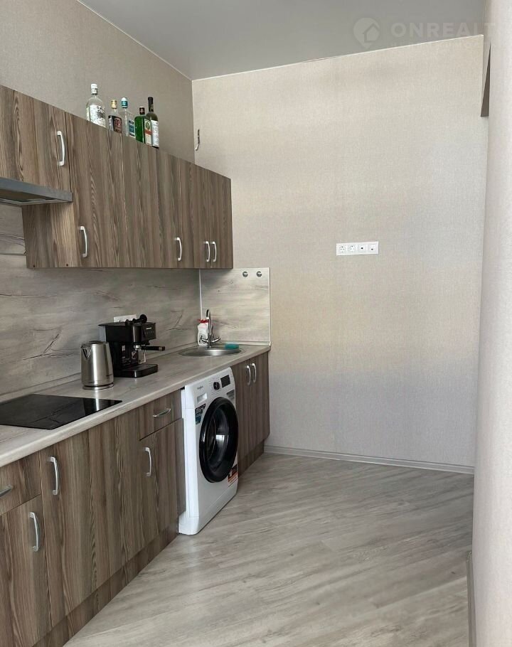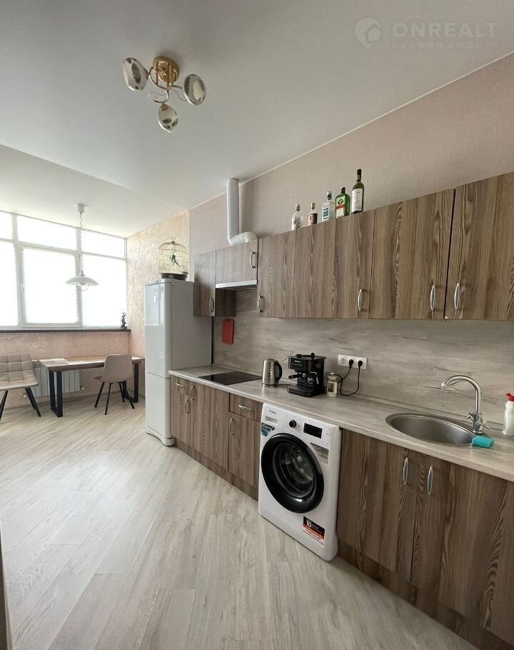 Кухня оборудована стильным гарнитуром, где установлена вся необходимая техника: двухкамерный холодильник. Удобная обеденная зона создаёт идеальные условия для семейных трапез. Для удобства жильцов предусмотрены стиральная машина и современная бытовая техника.