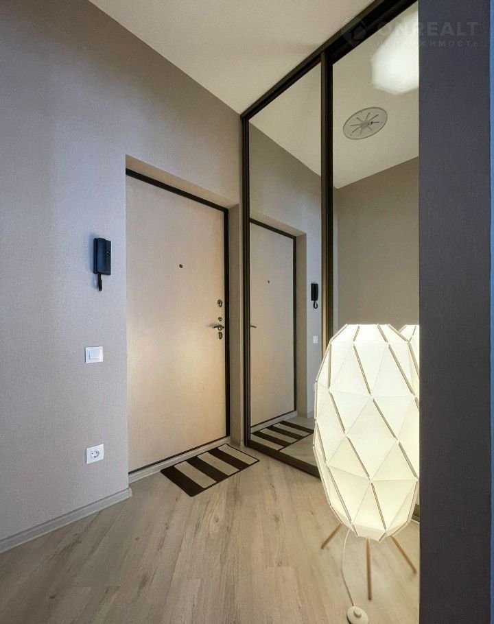В коридоре расположен вместительный зеркальный шкаф-купе, создающий стильный акцент и обеспечивающий удобное хранение вещей.