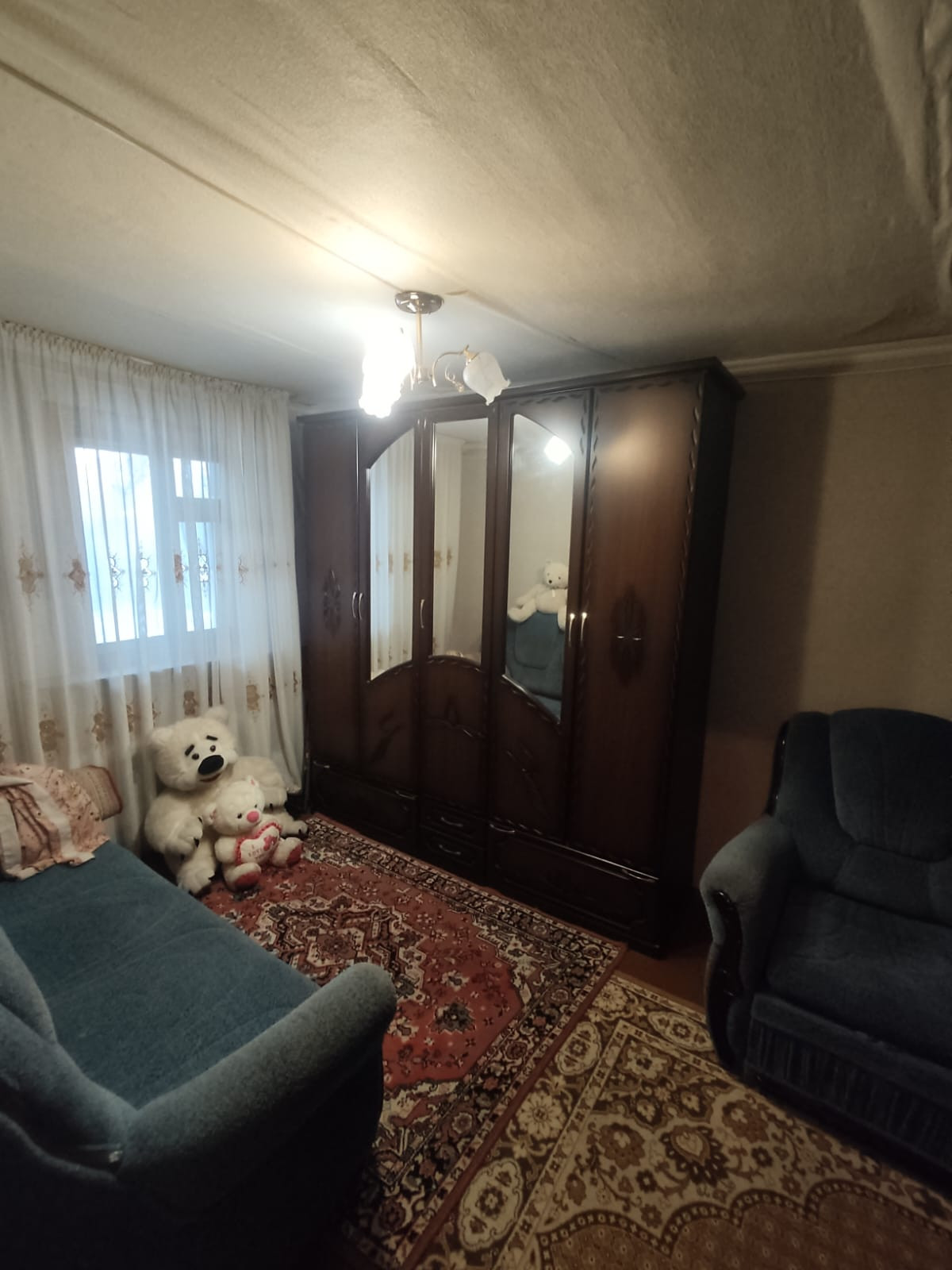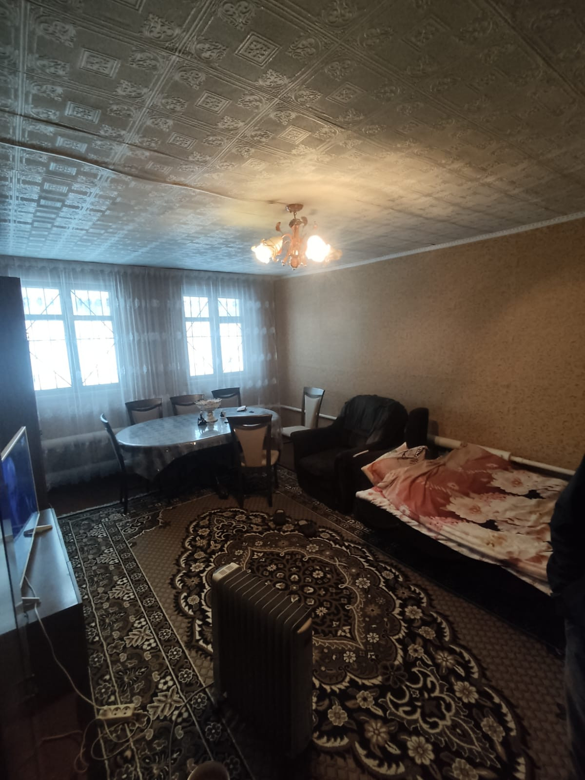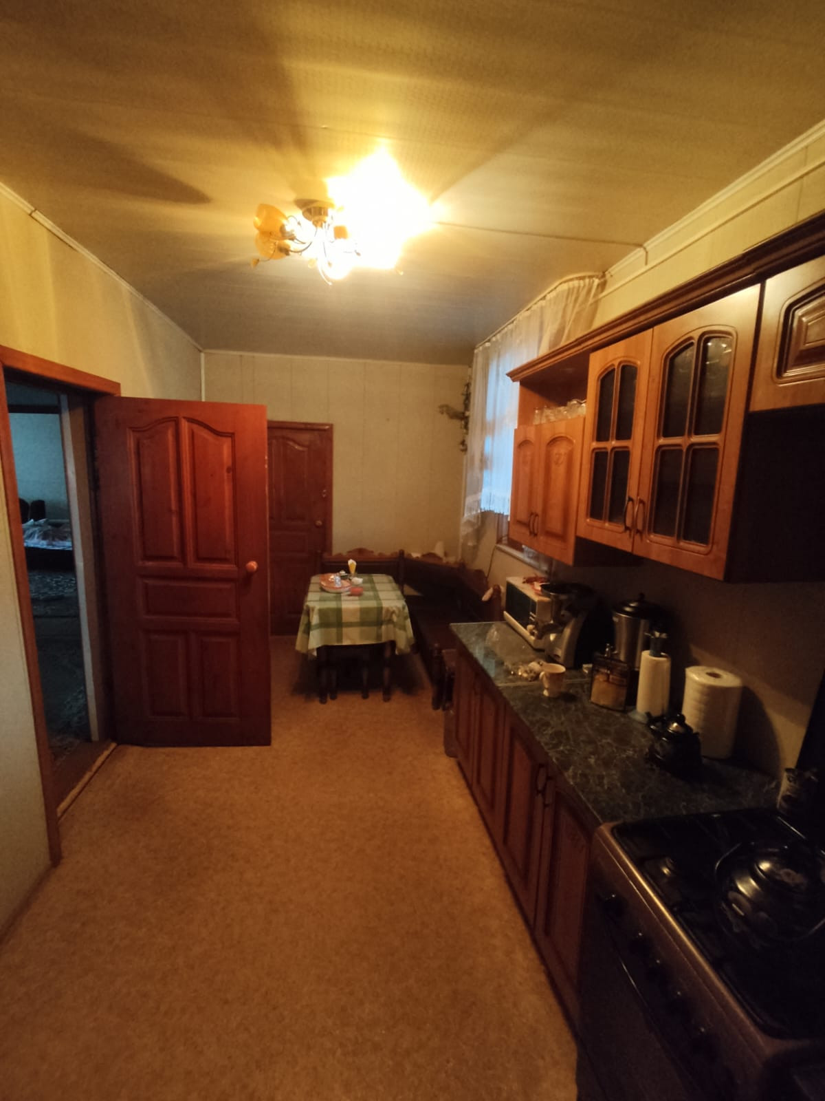 Дом хороший, бревенчатый, стоит на бетонном фундаменте, снаружи обшит сайдингом, крыша из профлиста. В доме три просторные комнаты, кухня, кладовое помещение и терраса. В доме есть электричество, холодная вода(подается насосной станцией из колодца), отопление паровое от угольного котла, природный газ обещают подвести в следующем году. Территория участка огорожена железным забором по всему периметру. На участке имеется колодец и сарай с чердаком, где раньше держали кур, коз. К дому пристроен гараж и навес. Небольшой торг при осмотре.