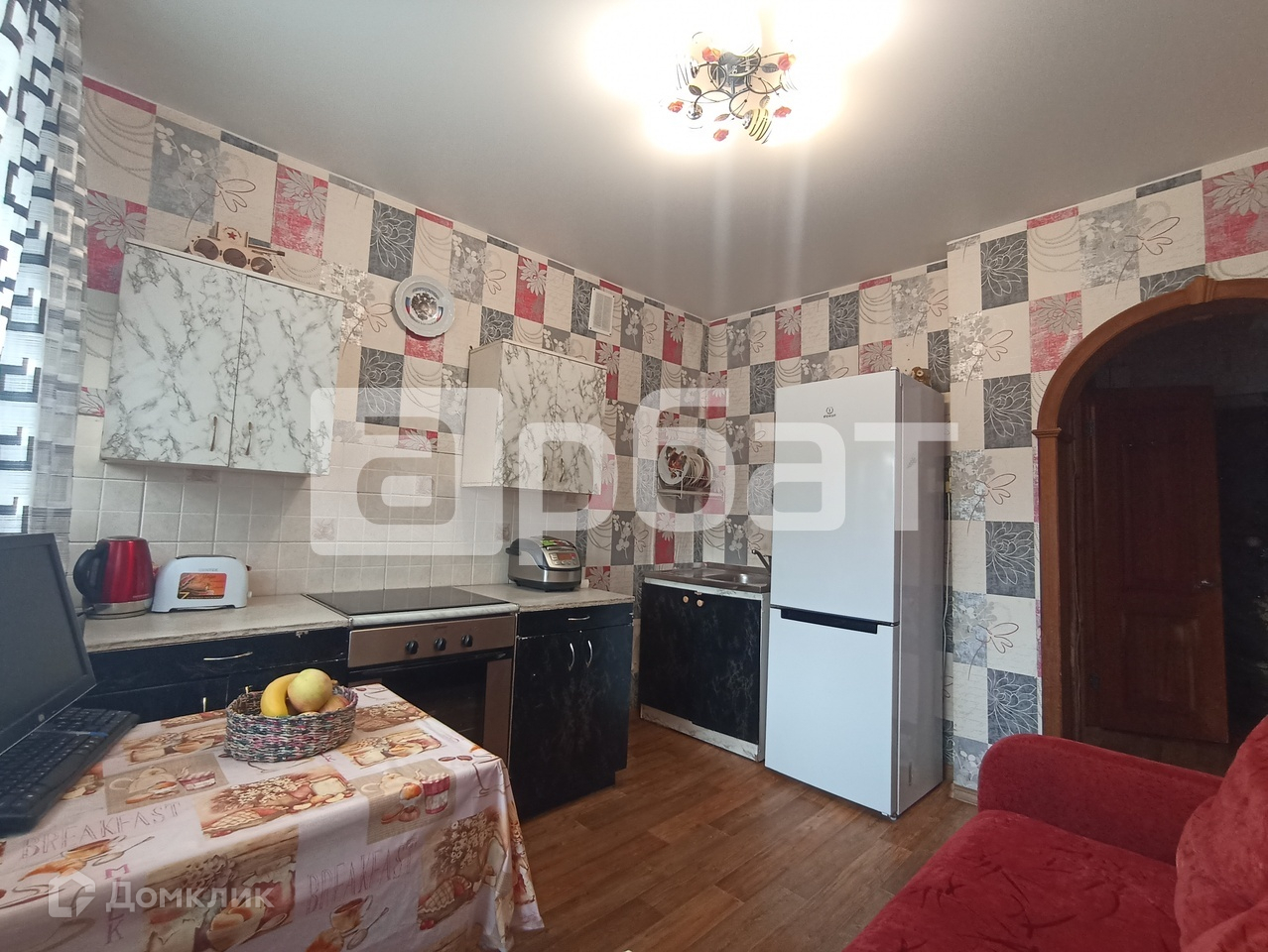 В квартире косметический ремонт. На полу линолеум, на стенах обои.  Окна ПВХ. В кухне натяжной потолок. Счетчики на воду.