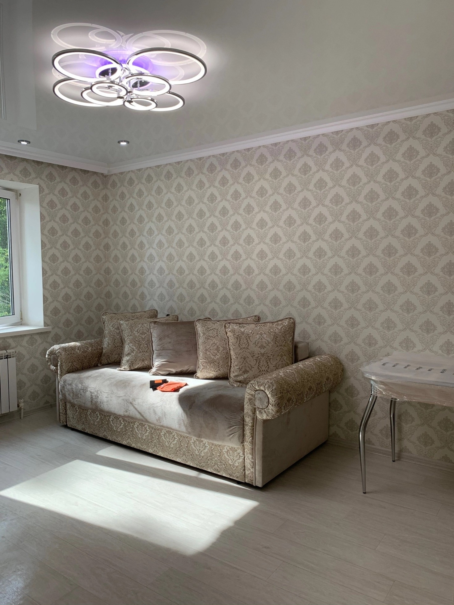 Зал с очень удобной и выгодной планировкой даже для семьи с детьми . В зале расположена ниша ( при входе в зал нишу не видно) ,там установлена кровать ,что очень удобно для 1-комнатной квартиры ( у предыдущих собственников стояли там 2 детские кровати + игровая зона ).
