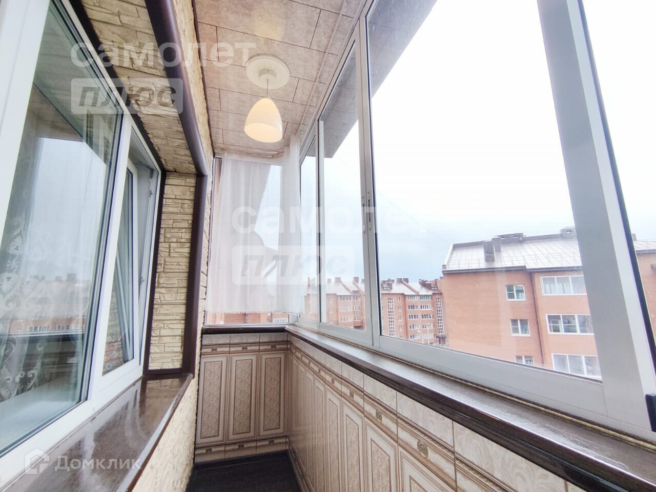 Отделан балкон декоративным камнем и оснащён светильниками.