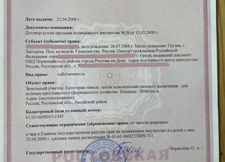 Земельный участок Кадастровый номер: 61:02:0600013:1543 Площадь уточненная: 18 000 кв. м Категория земель: Земли сельскохозяйственного назначения Разрешенное использование: Для ведения крестьянского (фермерского) хозяйства 1,5 км до х. Краснодворск. |