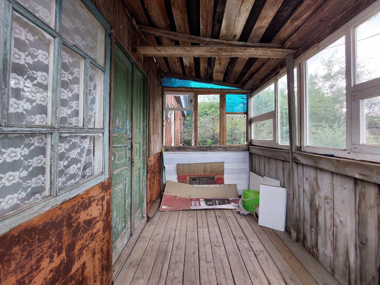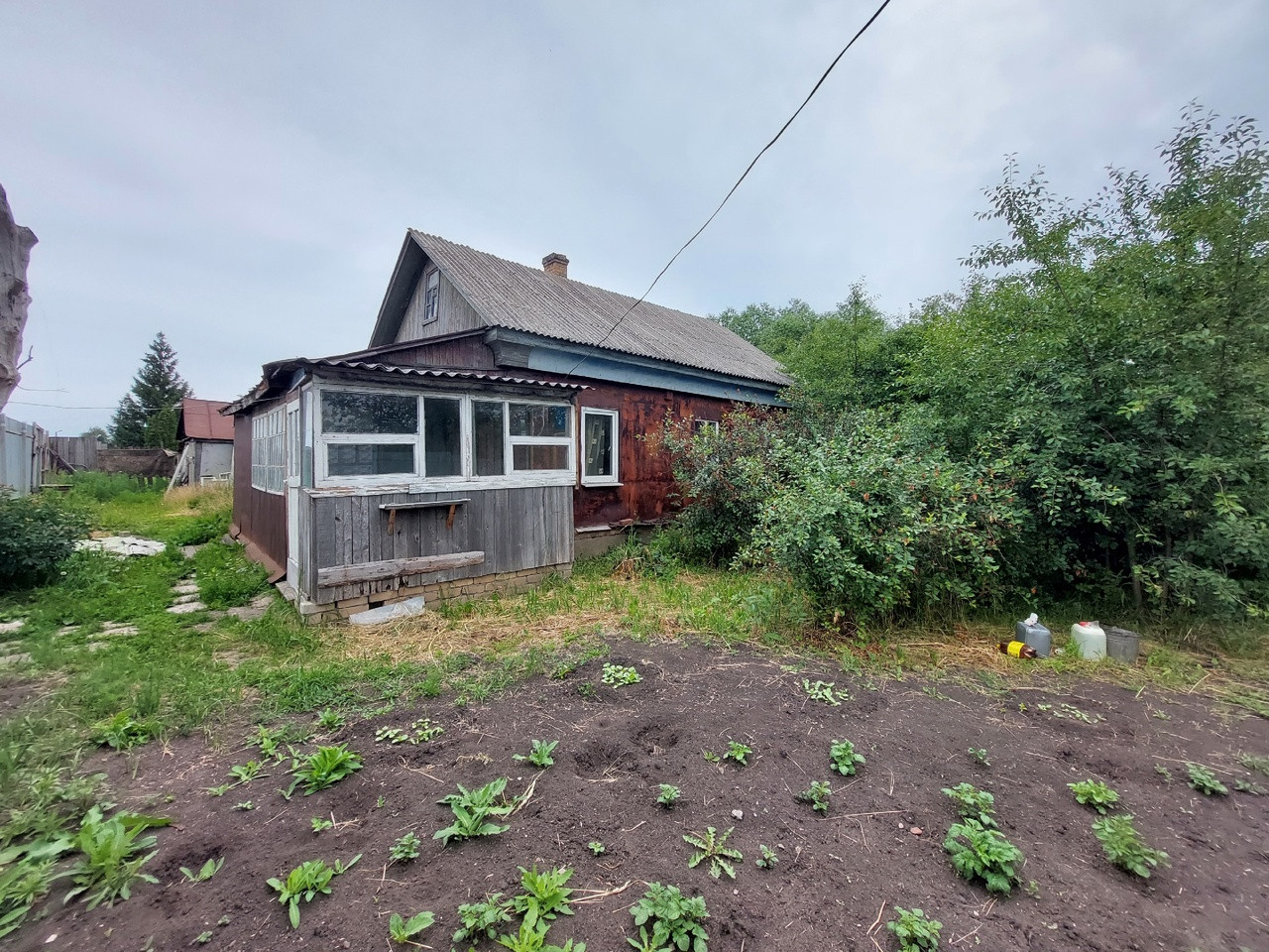 Дом шпальный, обшит железом, крыша перекрыта шифером.