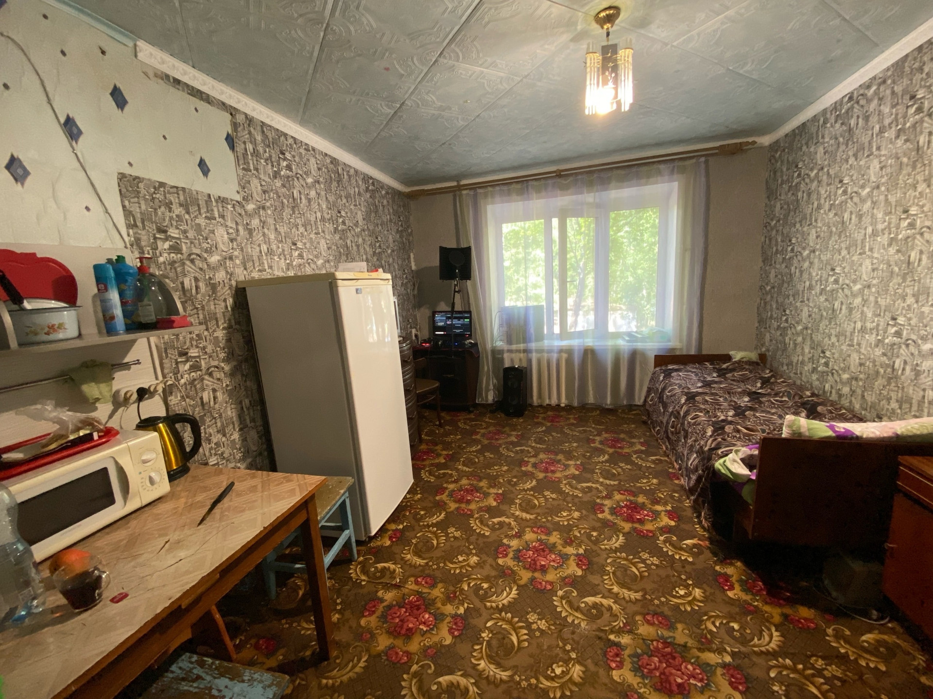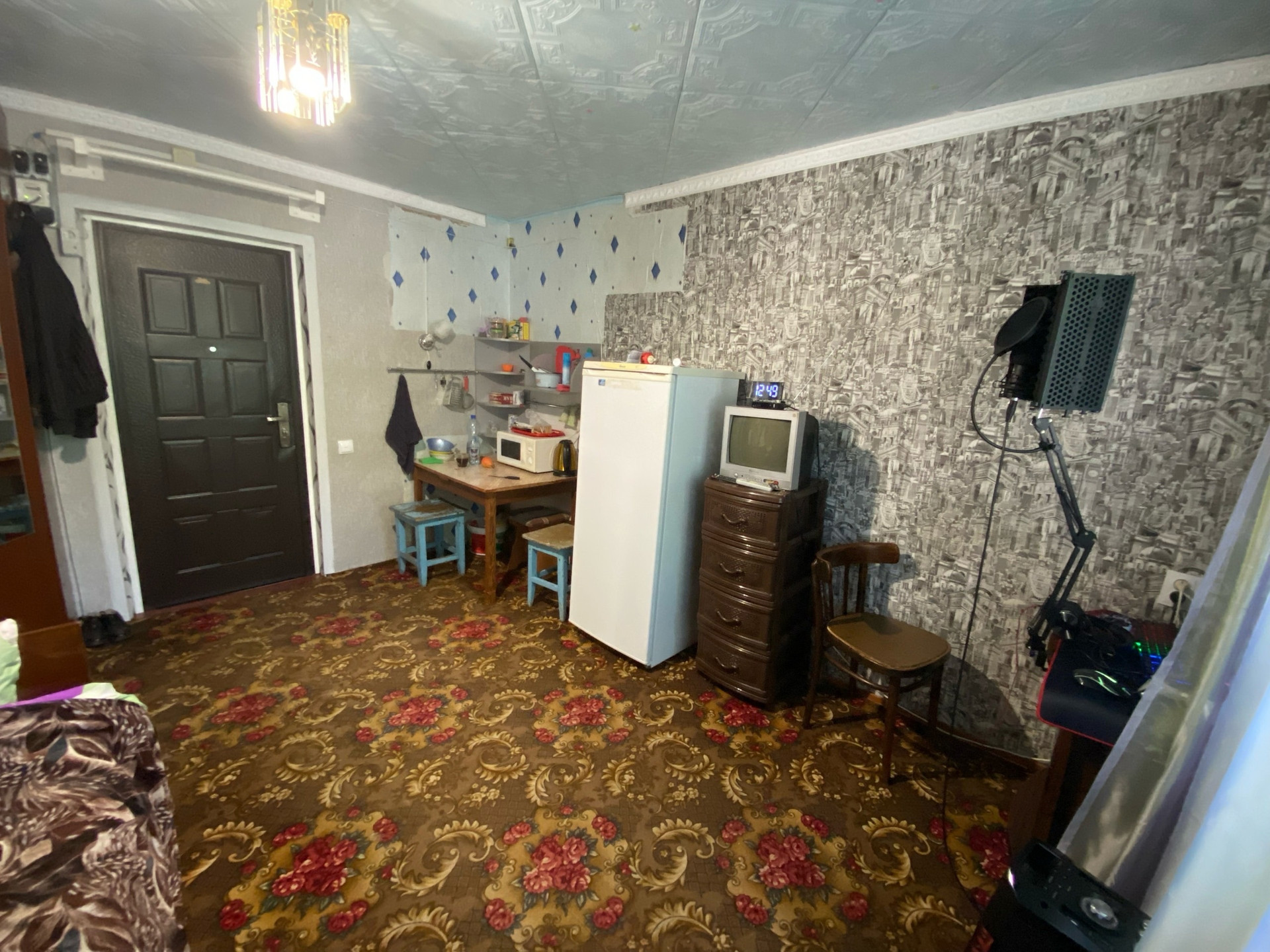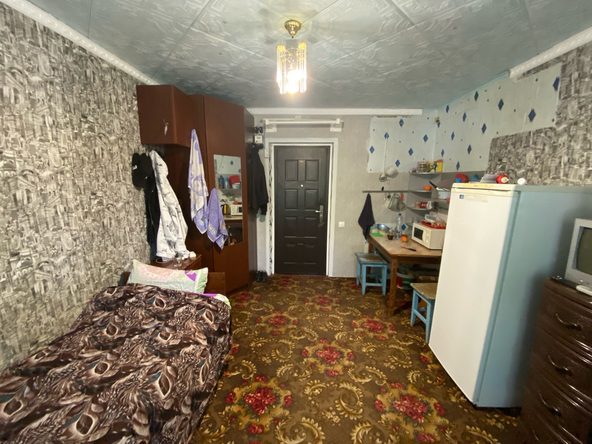 В комнате косметический ремонт: окна ПВХ, входная дверь металлическая, хорошие обои, общая площадь 13 кВ.м.