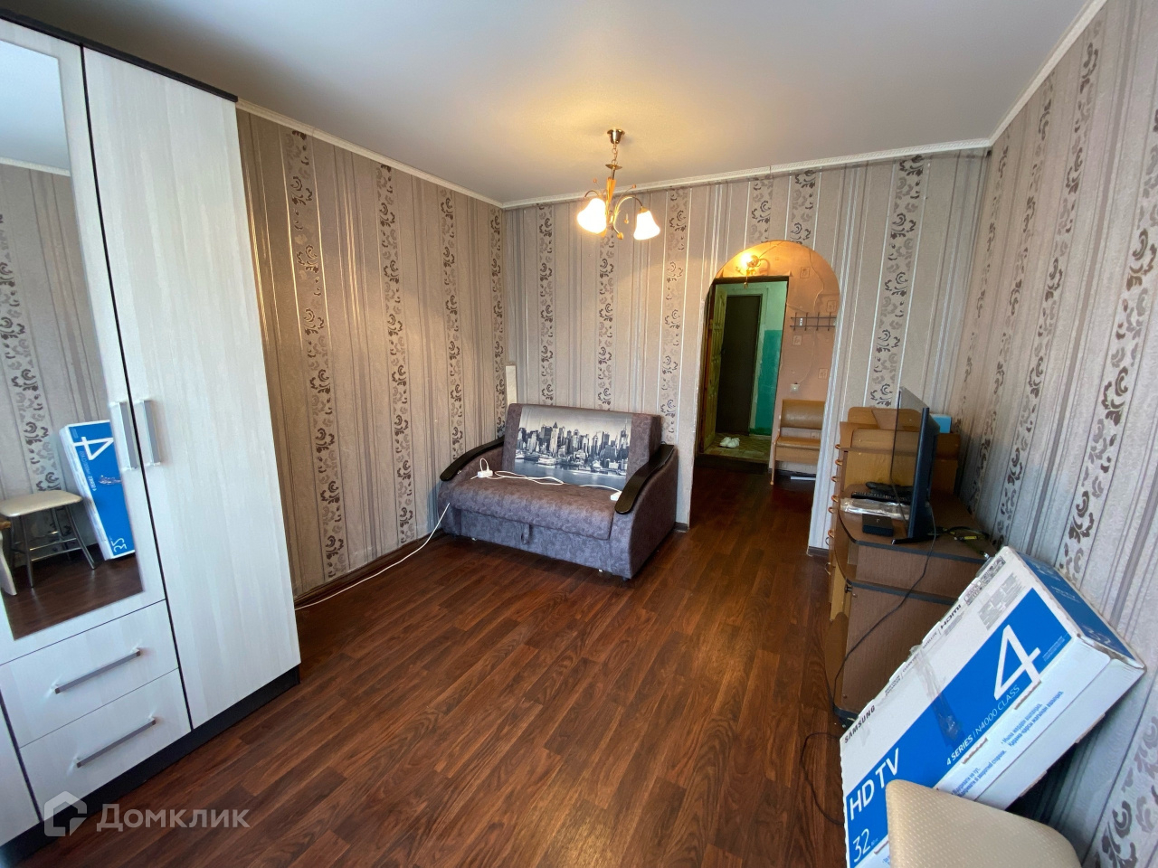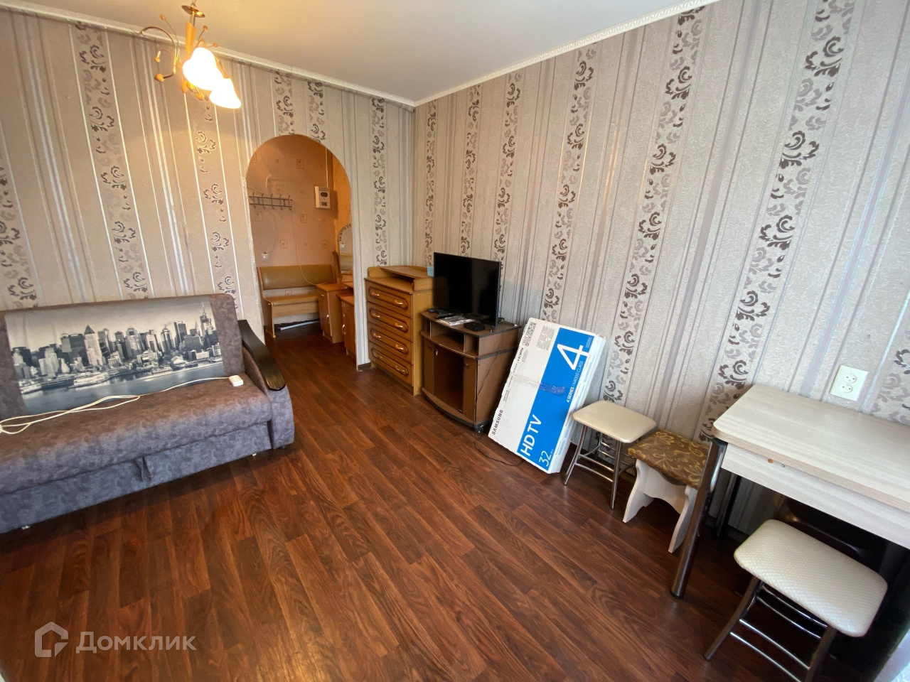 Комната светлая, уютная разделена на две зоны, между которыми установлена арка.
