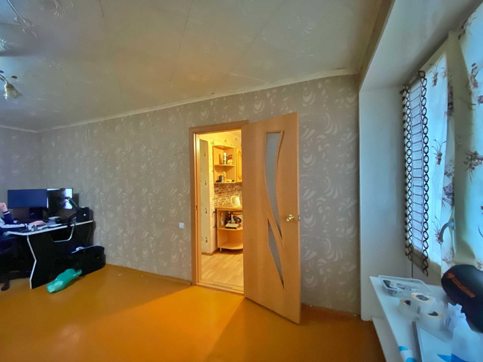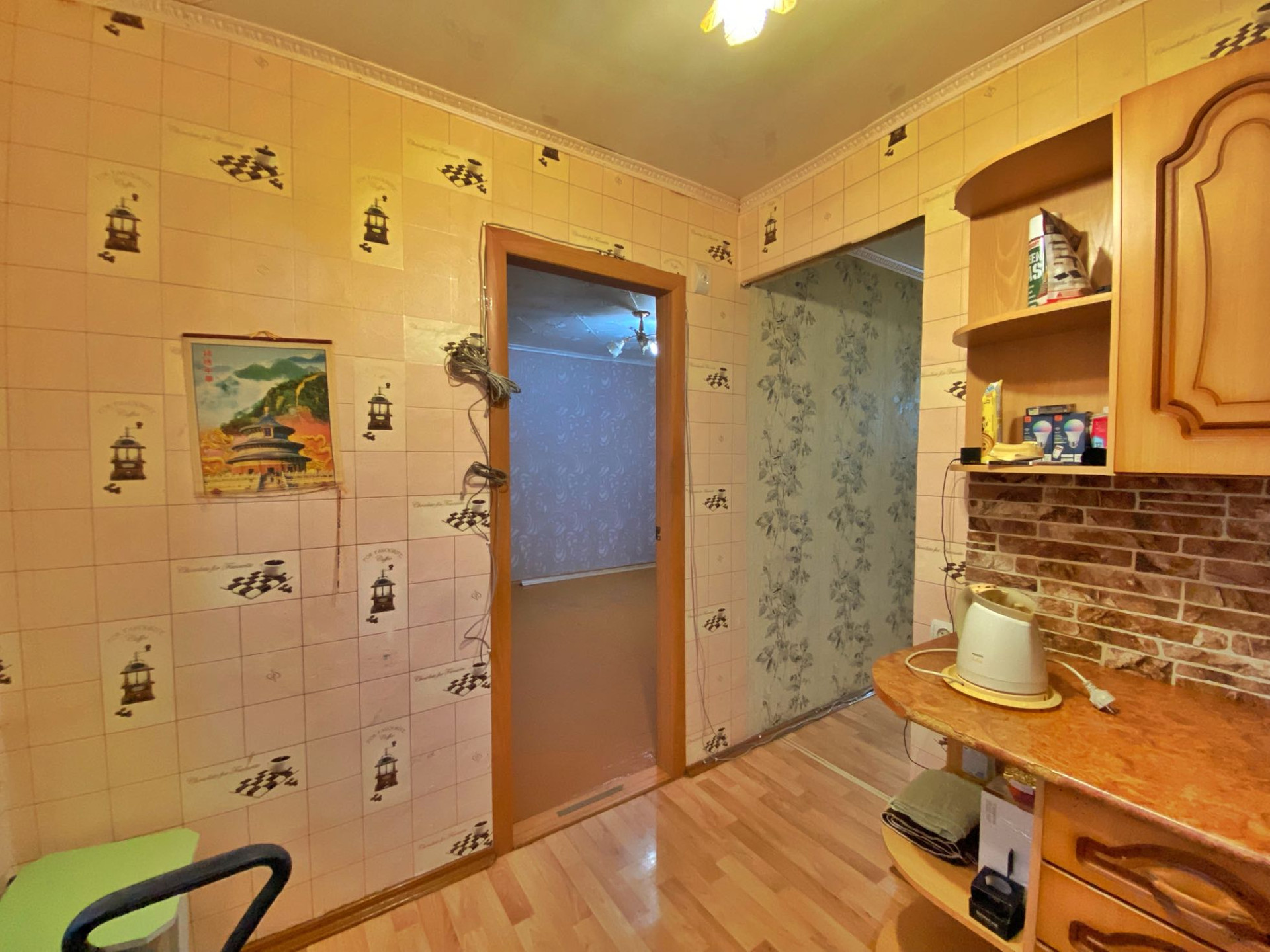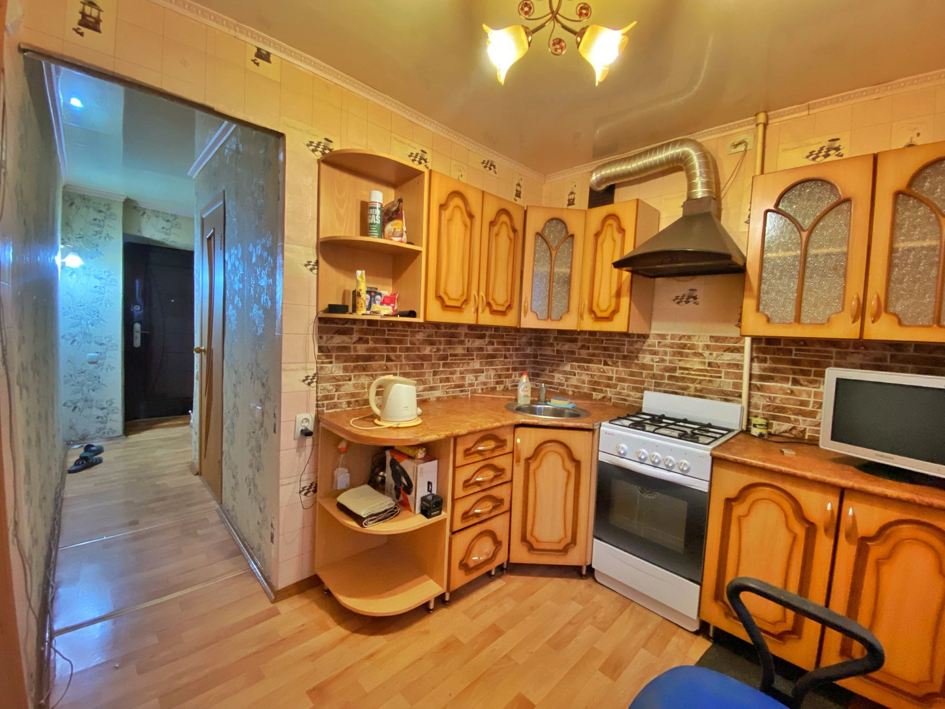 Квартира с косметическим ремонтом: окна ПВХ. На кухне и коридоре-напольное покрытие линолеум, потолок из пластиковых панелей. В комнате потолок обложен плиткой. Ухоженные обои. Балкон застекленный пластиком, отделан пластиковыми панелями .