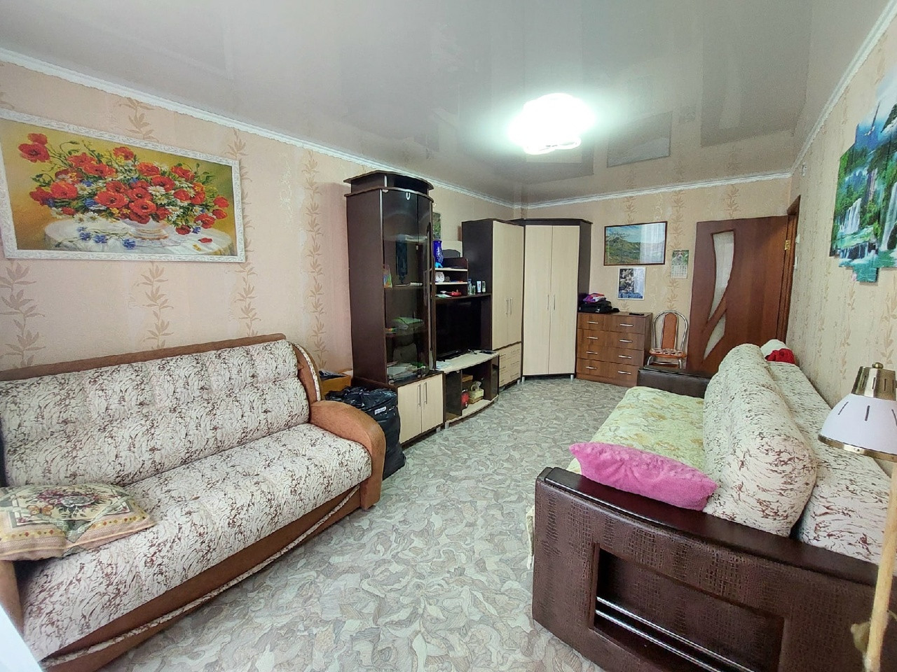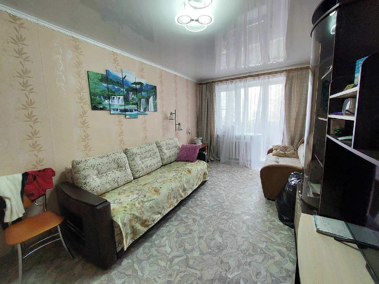 Квартира в отличном состоянии, сделан хороший ремонт, натяжной потолок, поклеены свежие обои, постелен линолеум, санузел обложен кафелем, заменена сантехника, все окна ПВХ, металлическая входная дверь.