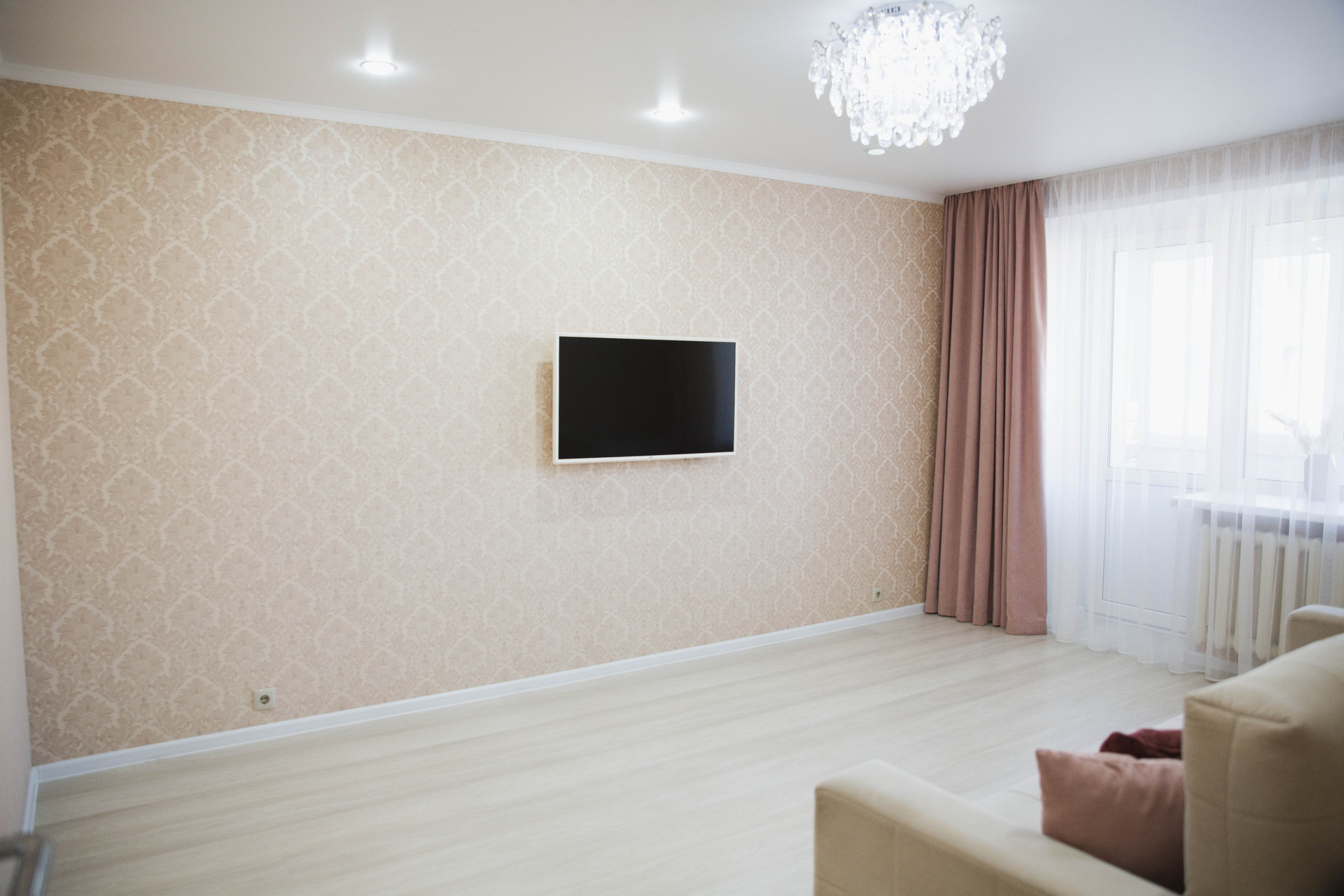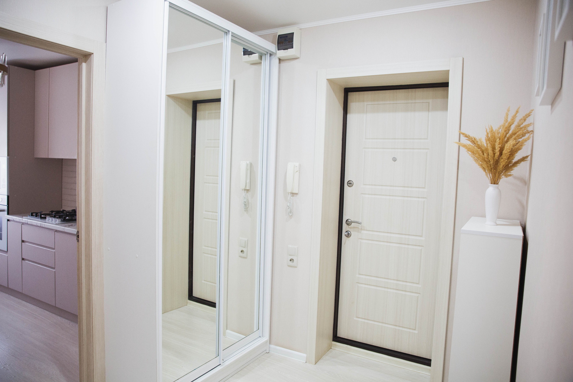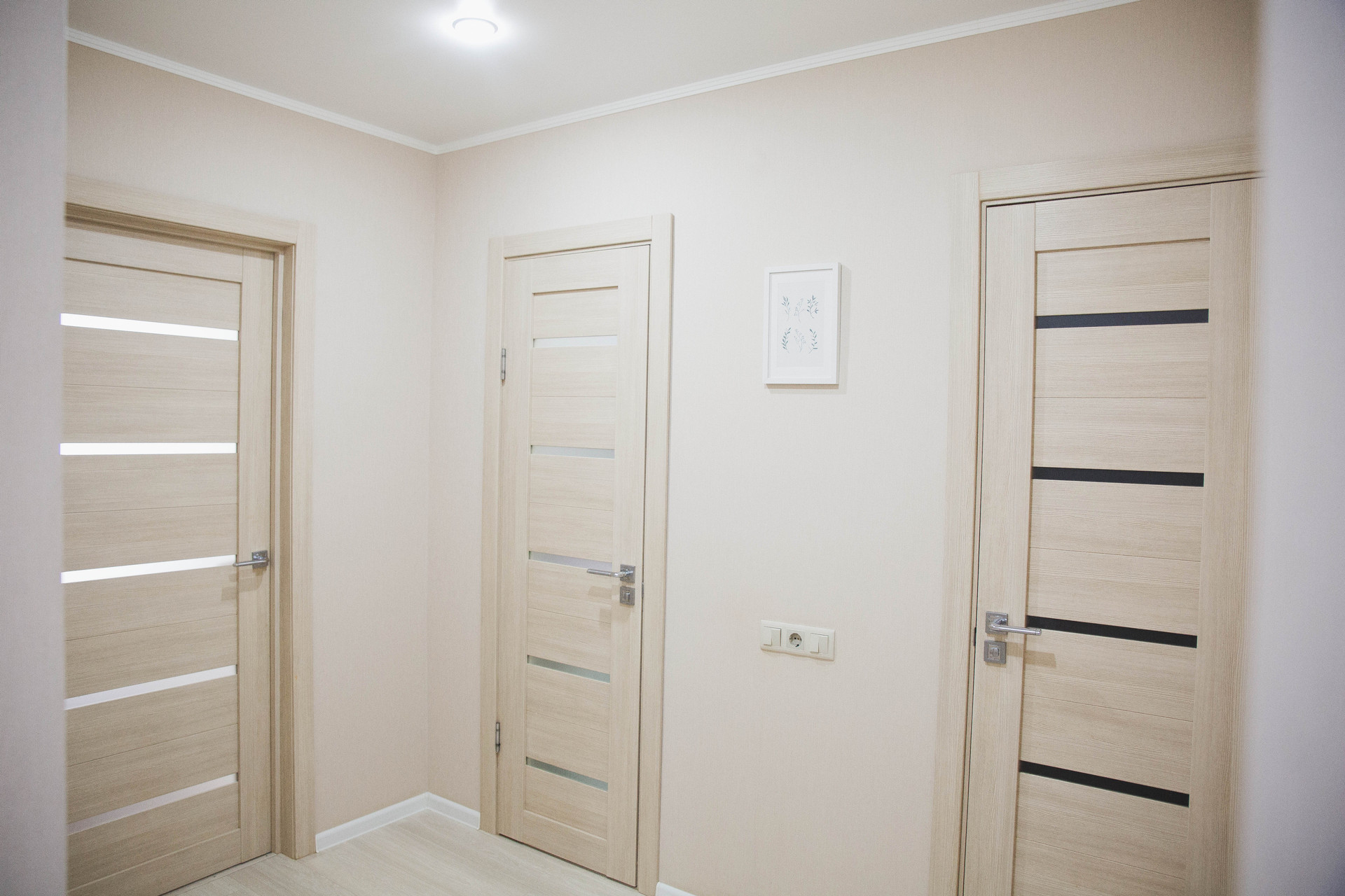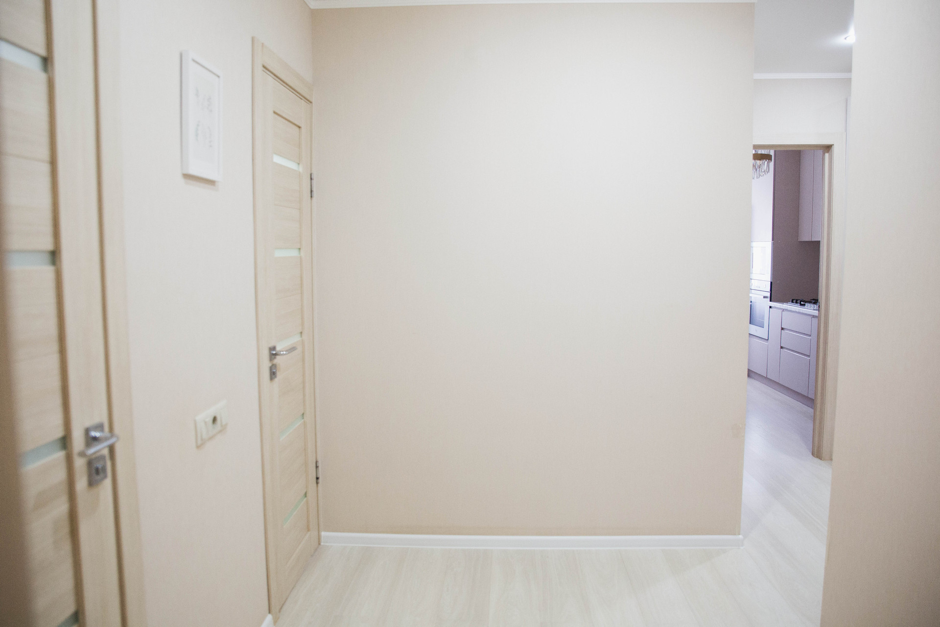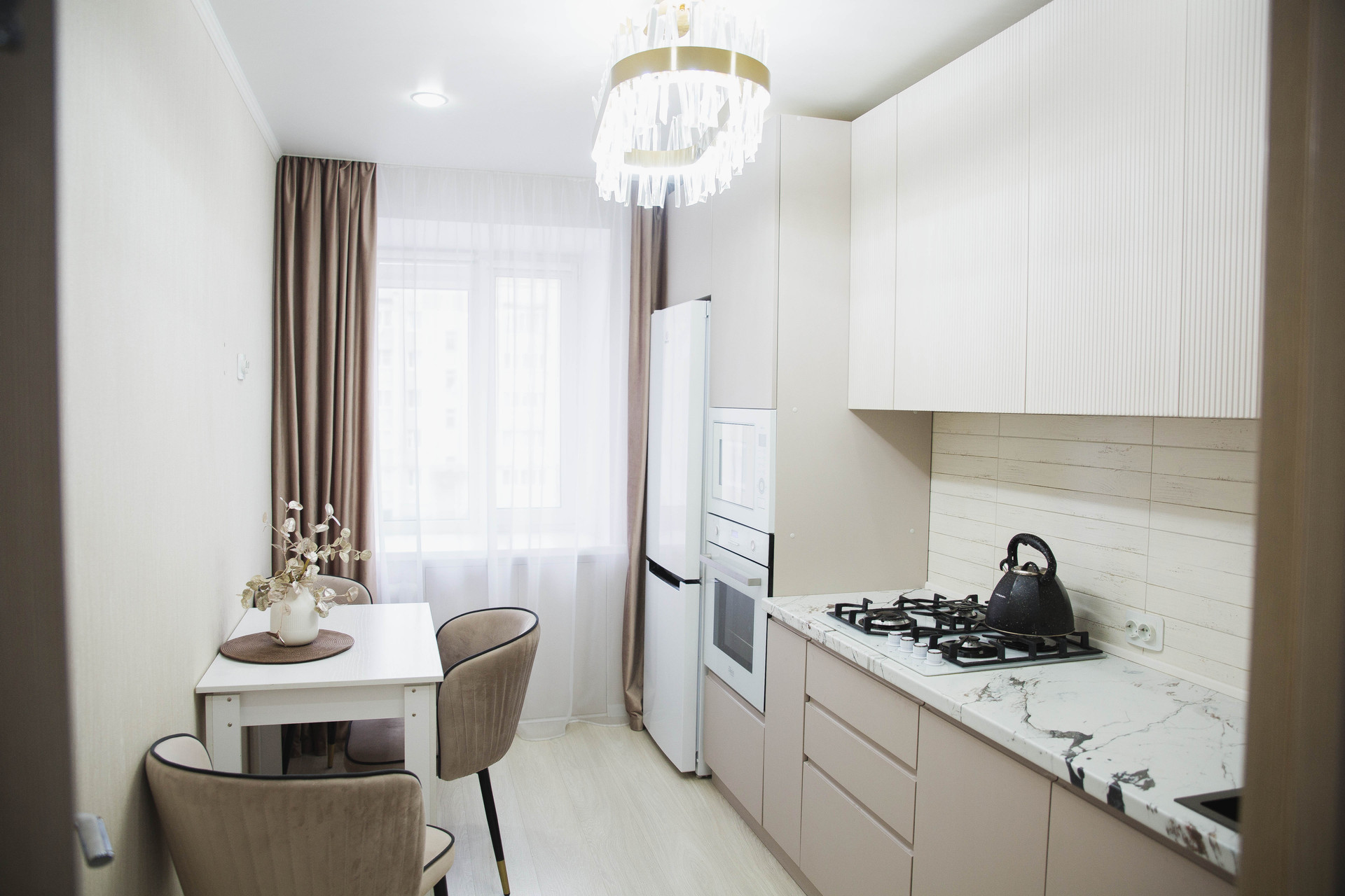Качественный ремонт в современном стиле. Кухня с гарнитуром. Большой коридор, разделяющий комнаты. Раздельный санузел.