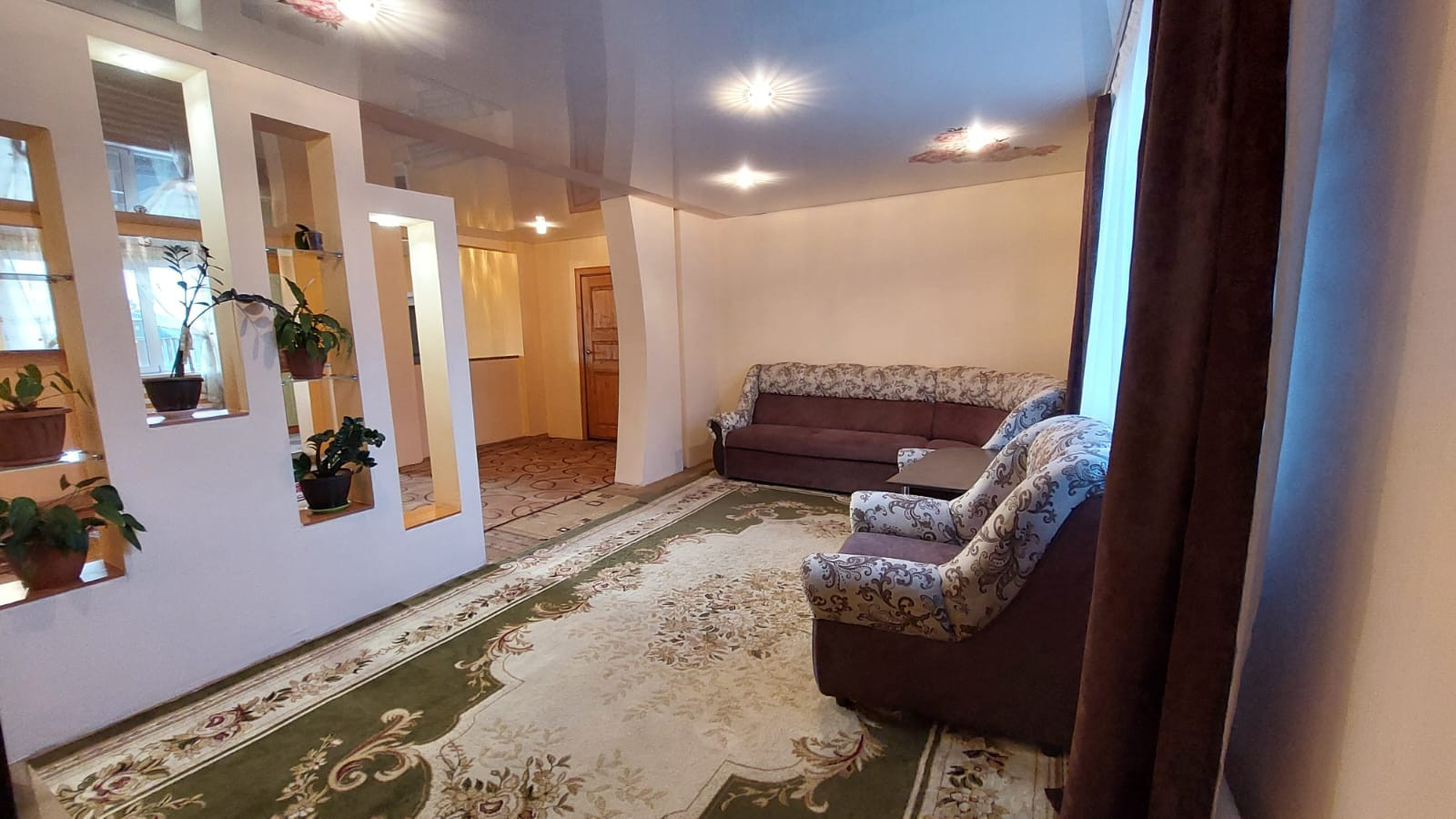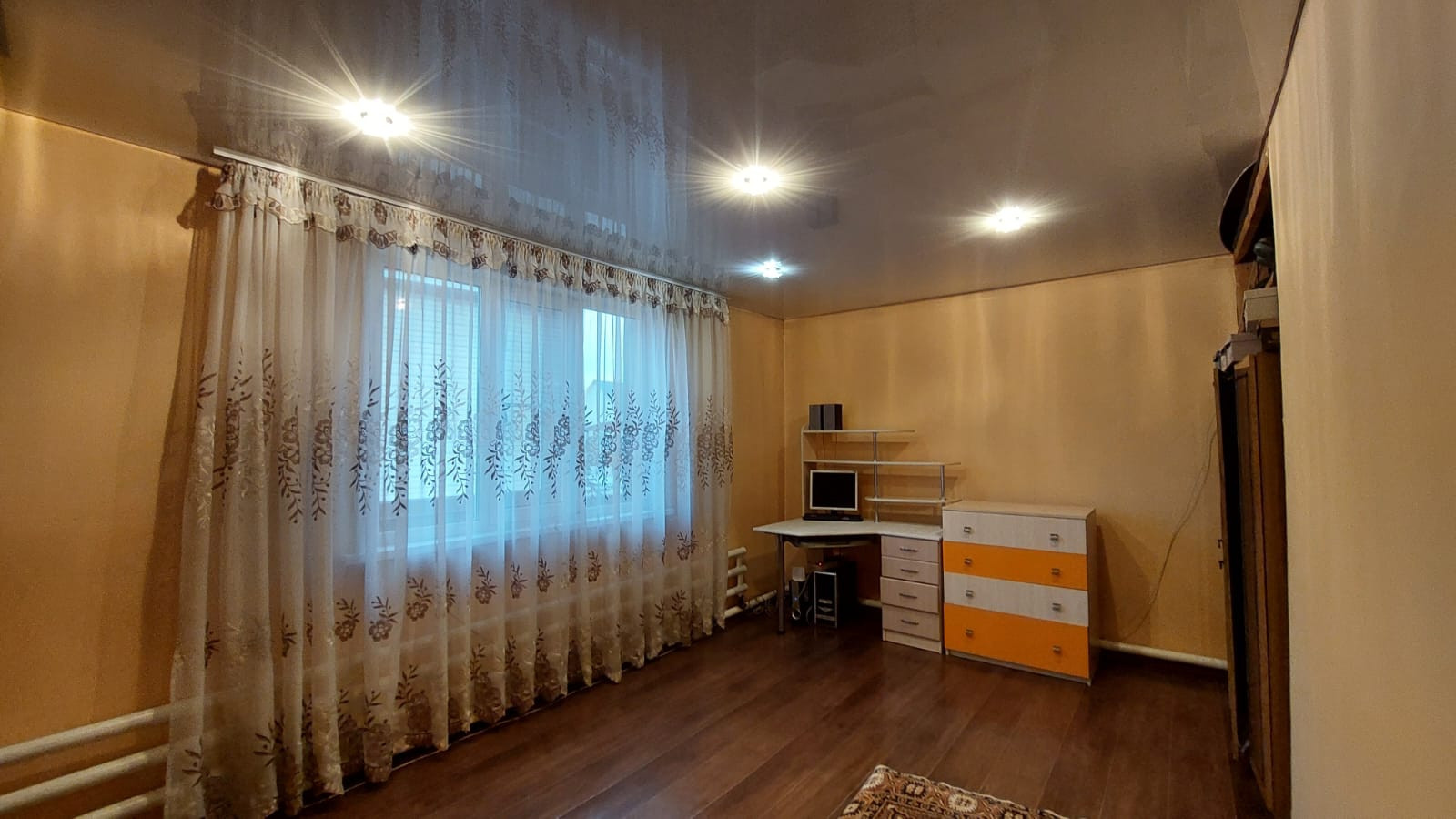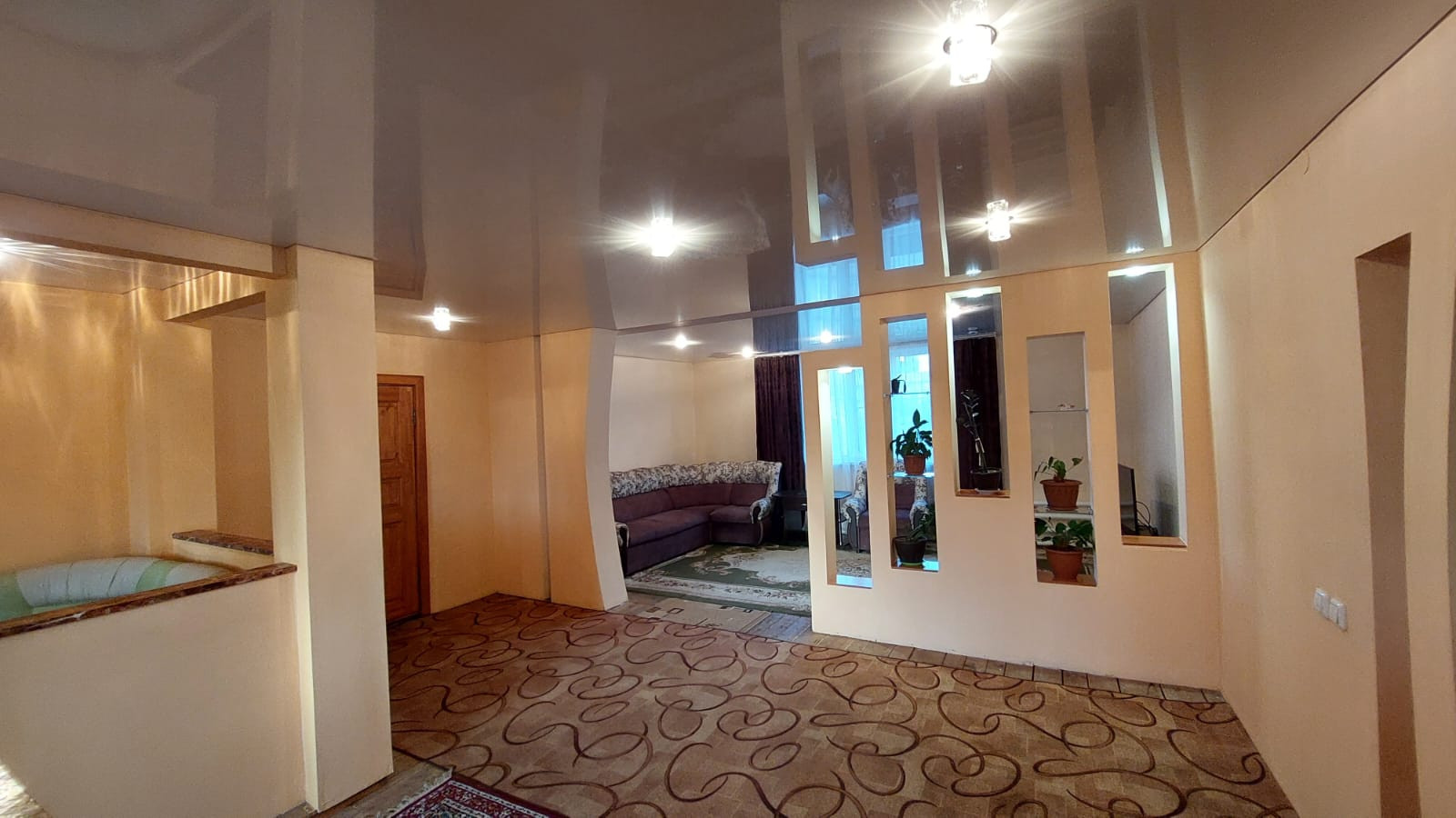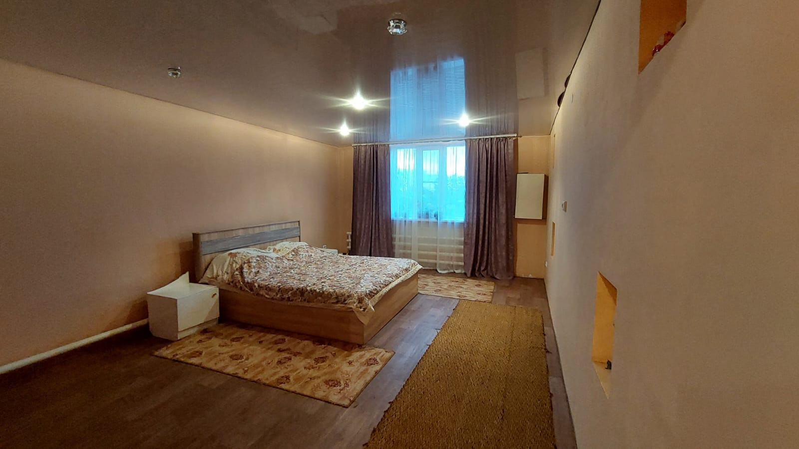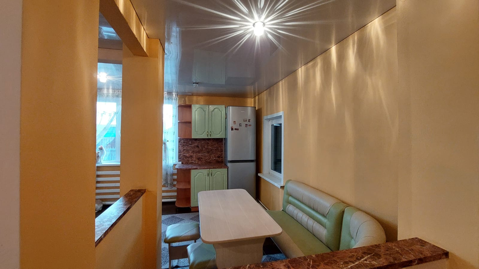 На первом этаже находиться кухня - гостиная, большая комната, санузел, большая прихожая с лестничным маршем на второй этаж,где расположены ещё три просторных, светлых спальни, изолированных между собой.Стены зашиты гипсокартона и выровнены под покраску. Потолки натяжные.На полу дорогой линолеум.