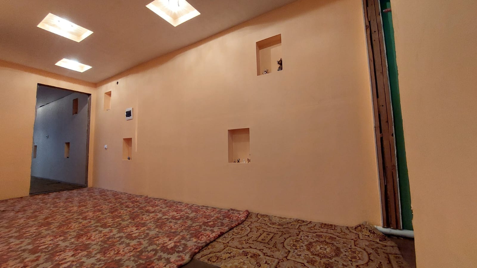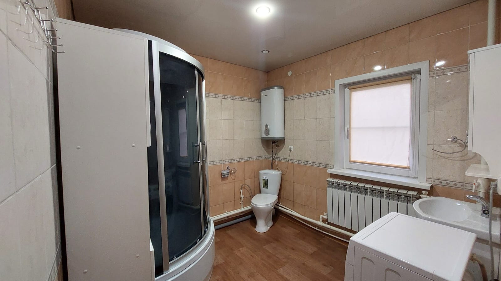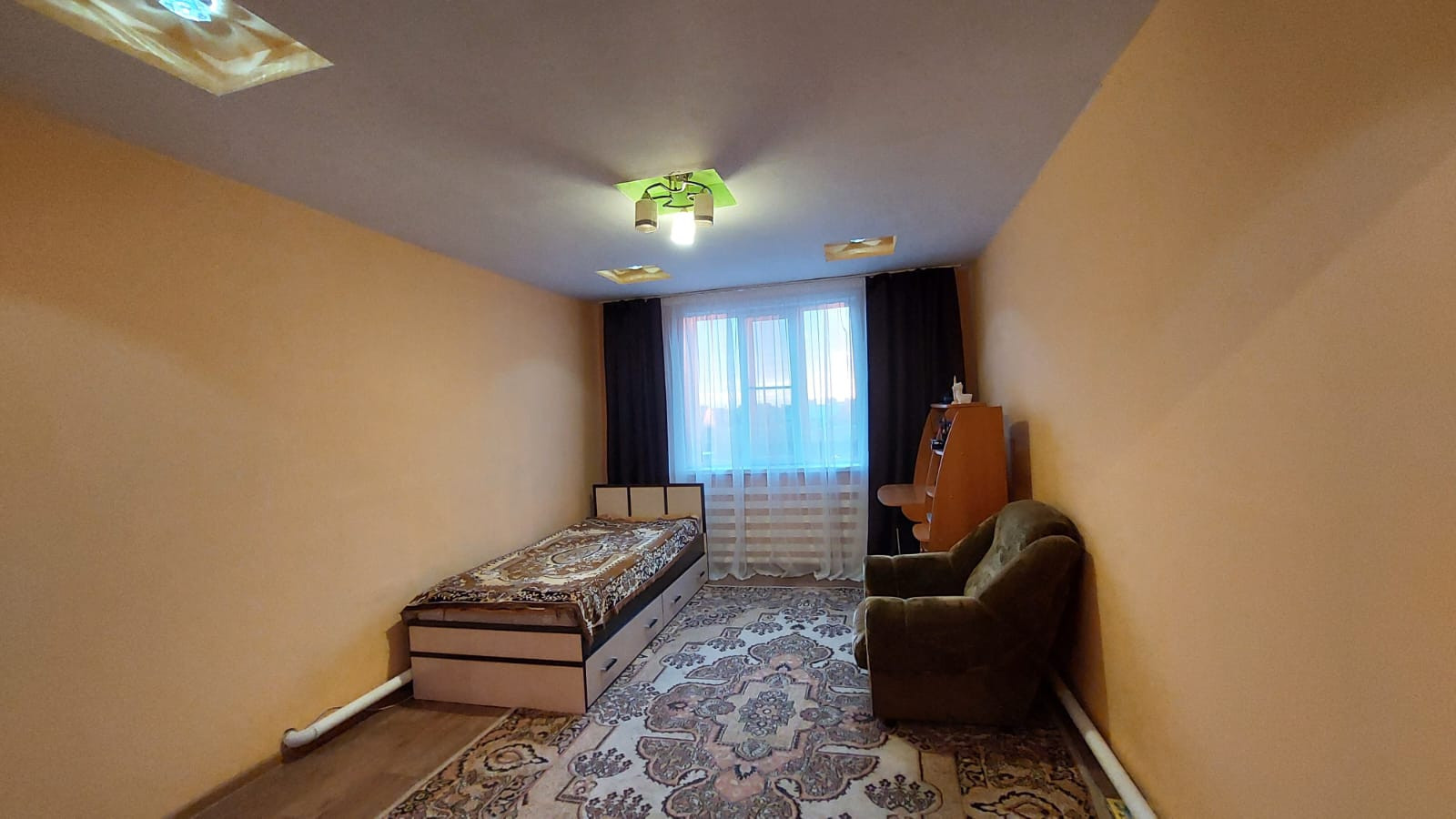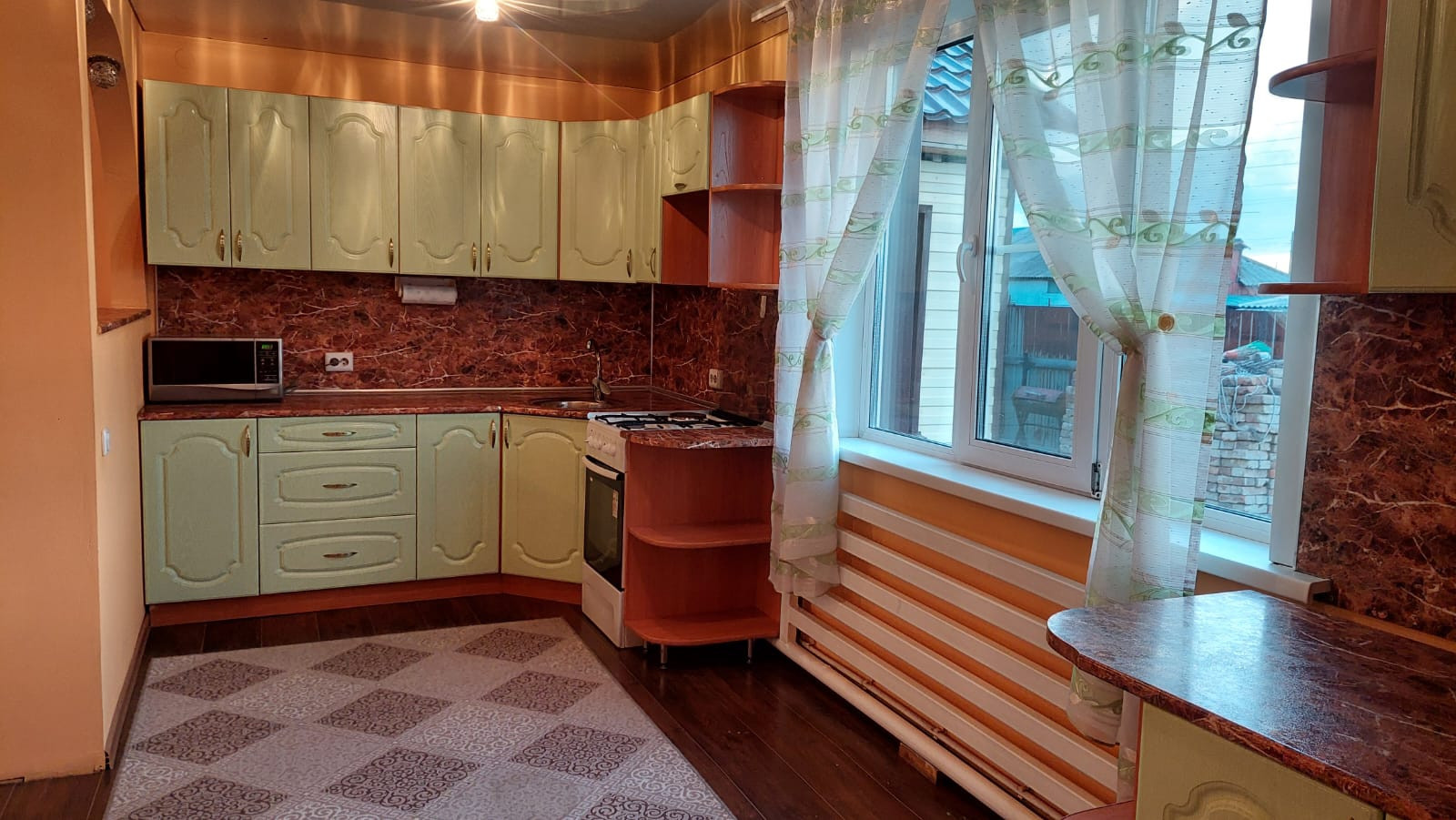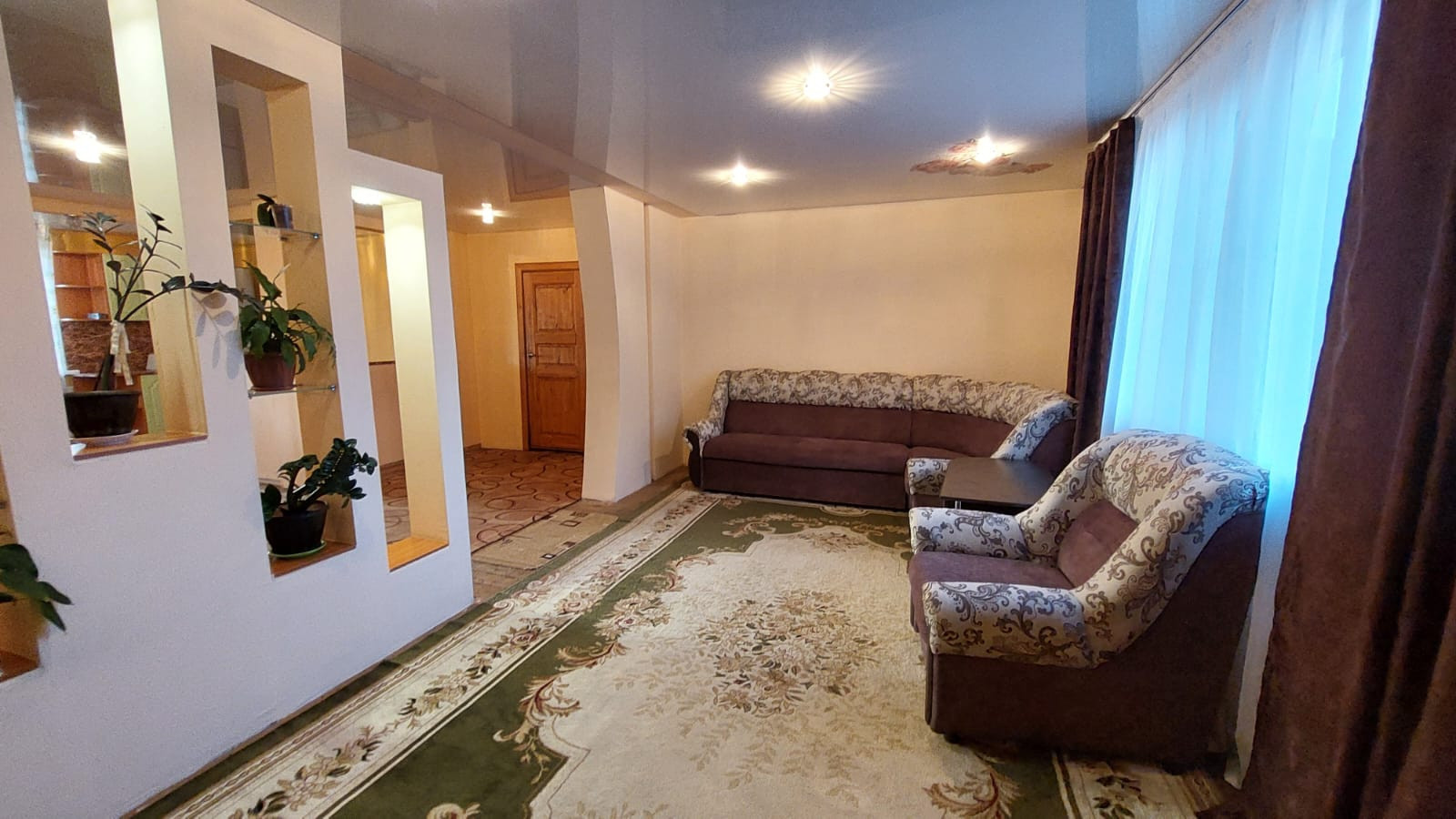 На первом этаже находиться кухня - гостиная, большая комната, санузел, большая прихожая с лестничным маршем на второй этаж,где расположены ещё три просторных, светлых спальни, изолированных между собой.Стены зашиты гипсокартона и выровнены под покраску. Потолки натяжные.На полу дорогой линолеум.