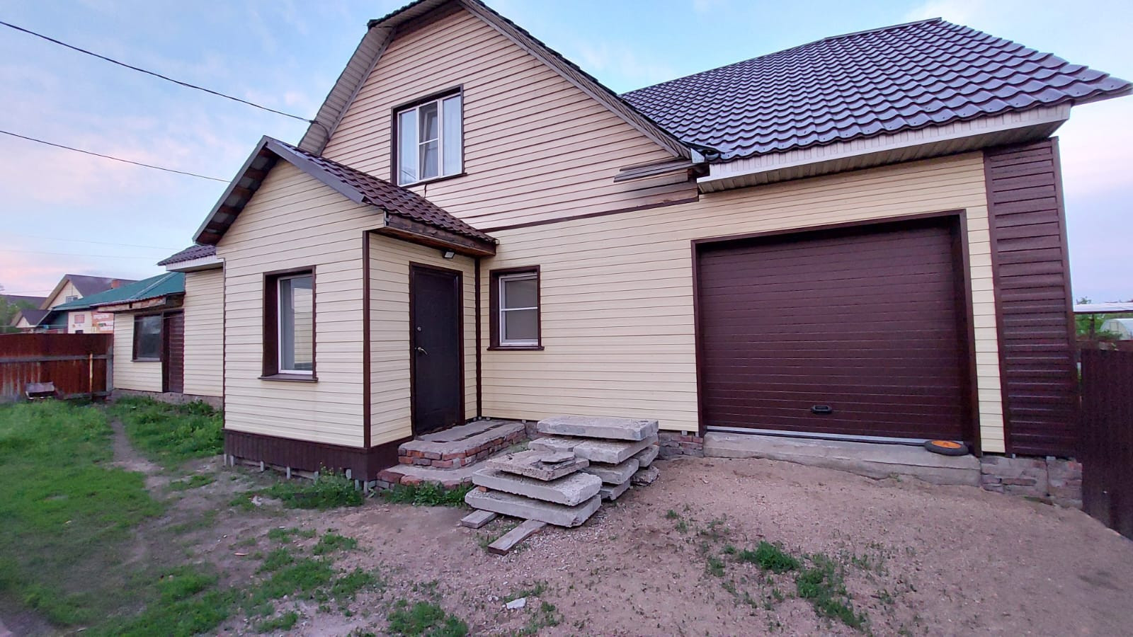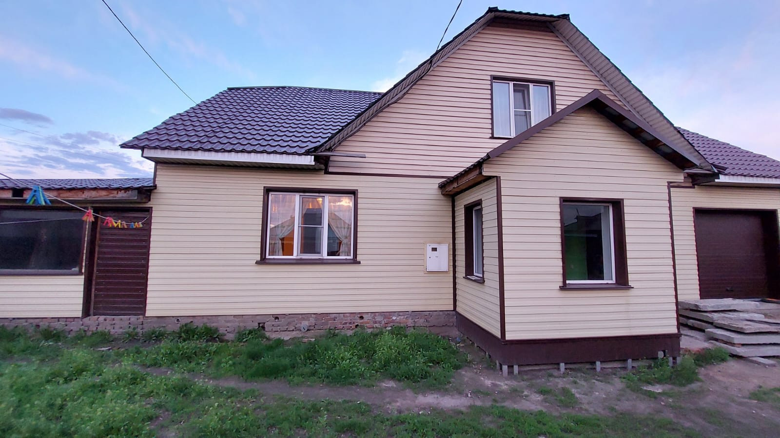 Дом выполнен из бруса, обшит металлическим сайдингом, крыша покрыта металлочерепицей.
