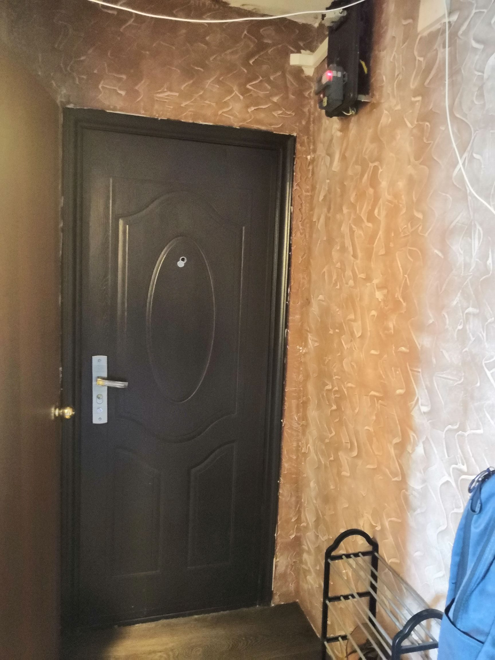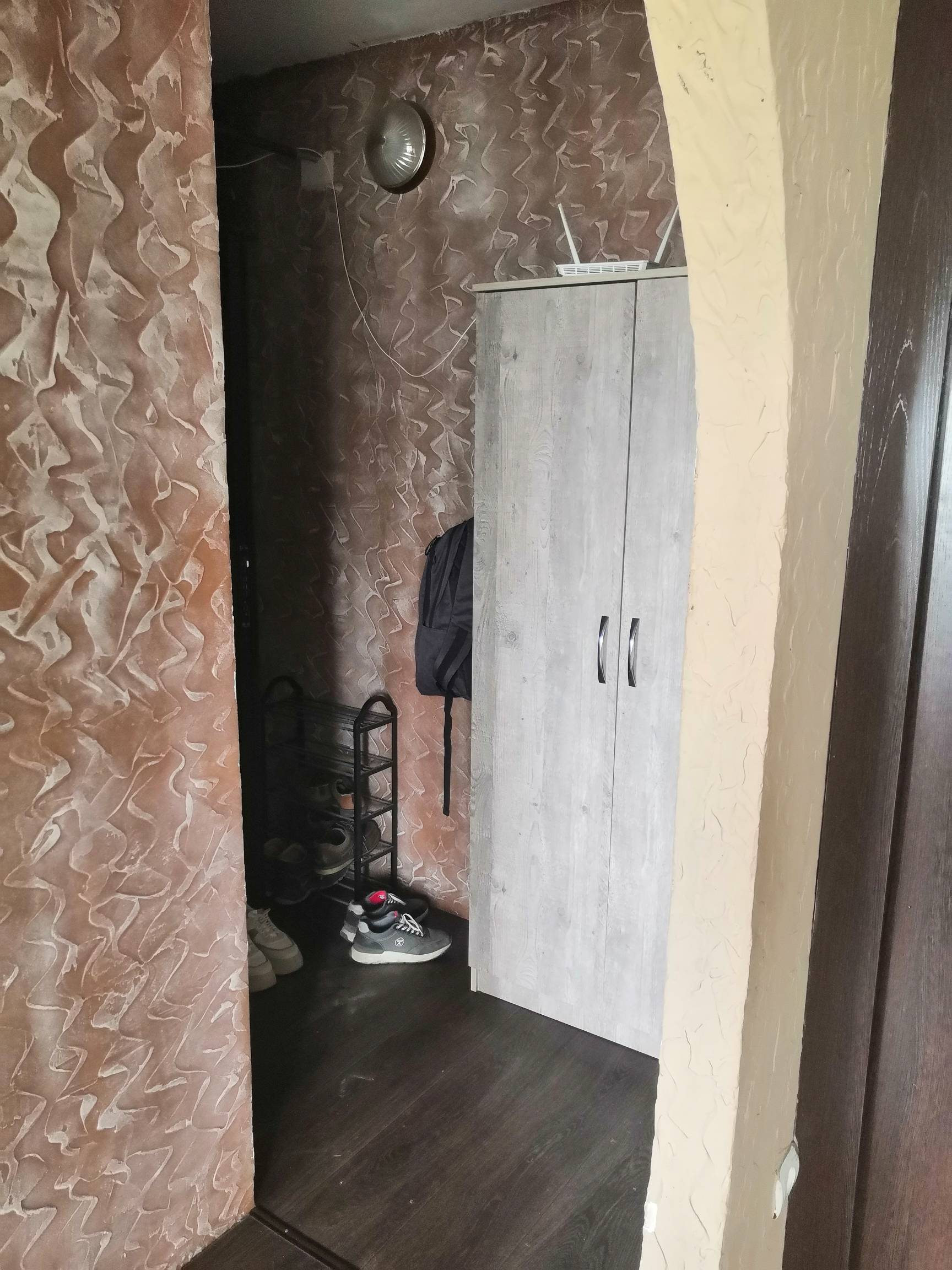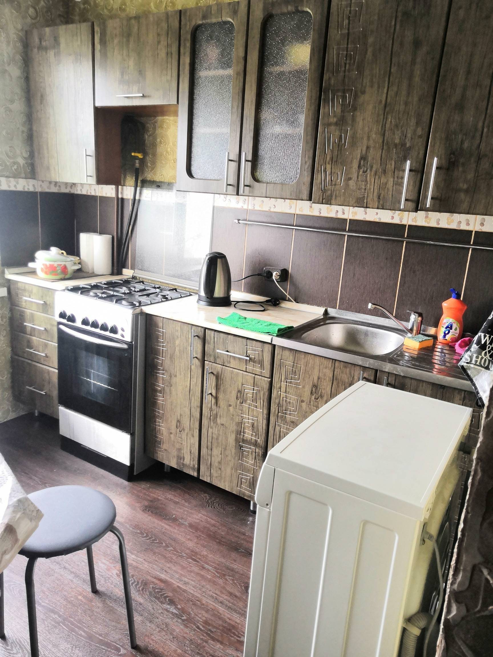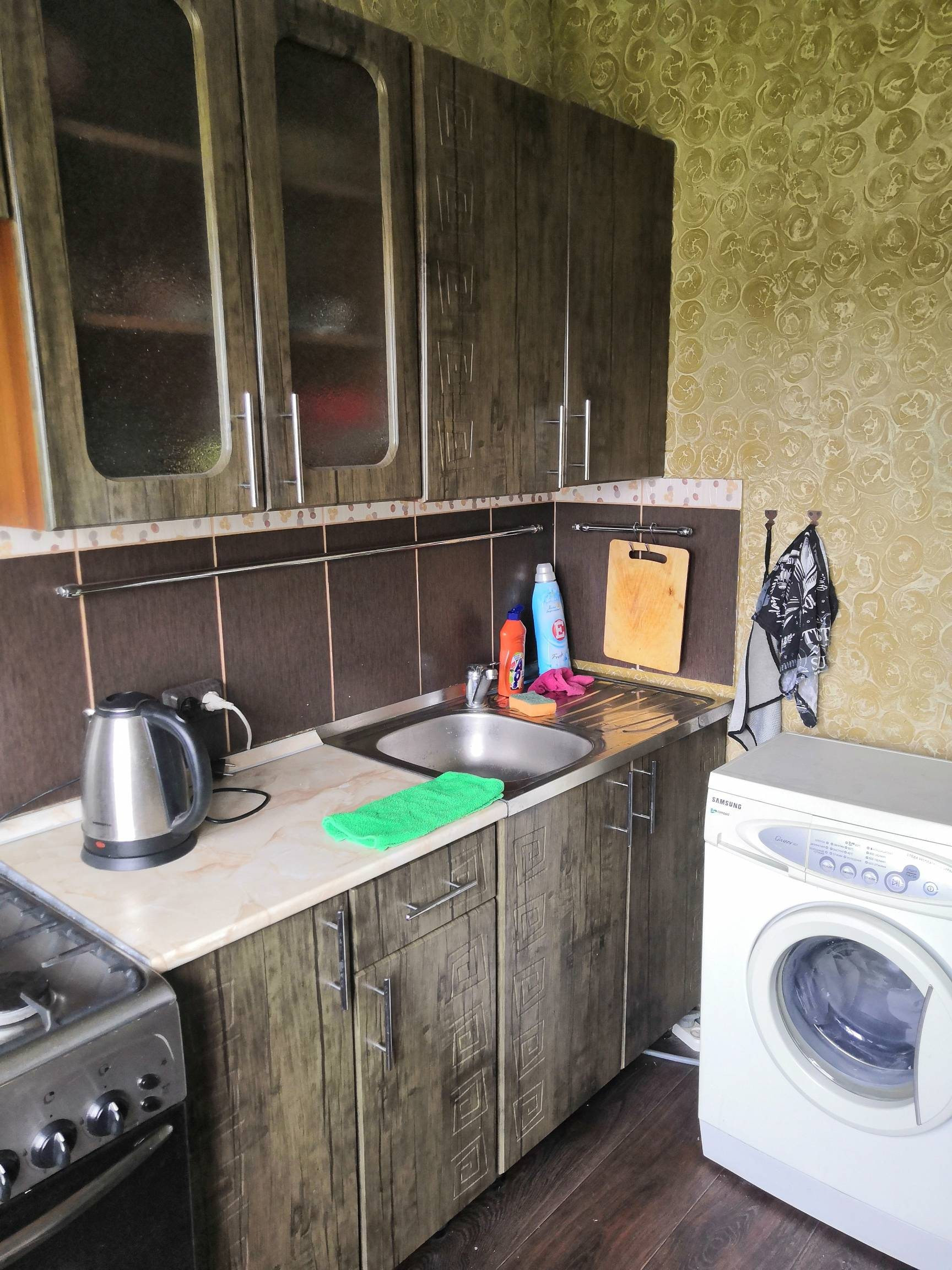 В ванной кафель, в кухне линолеум, на стенах декоративная штукатурка (можно перекрасить в любой другой цвет).