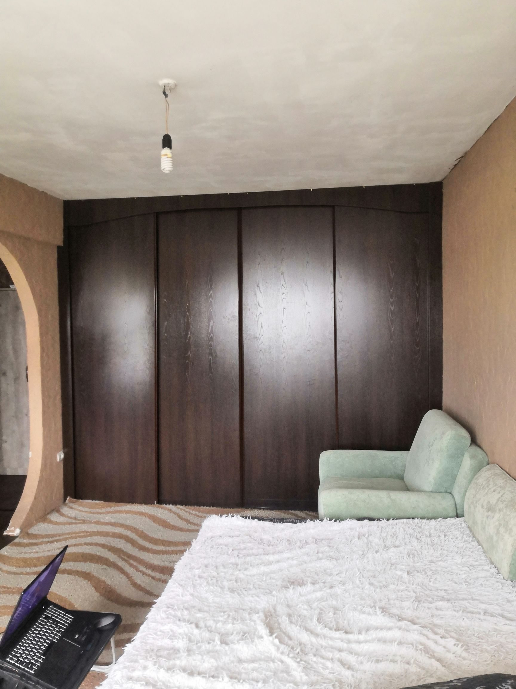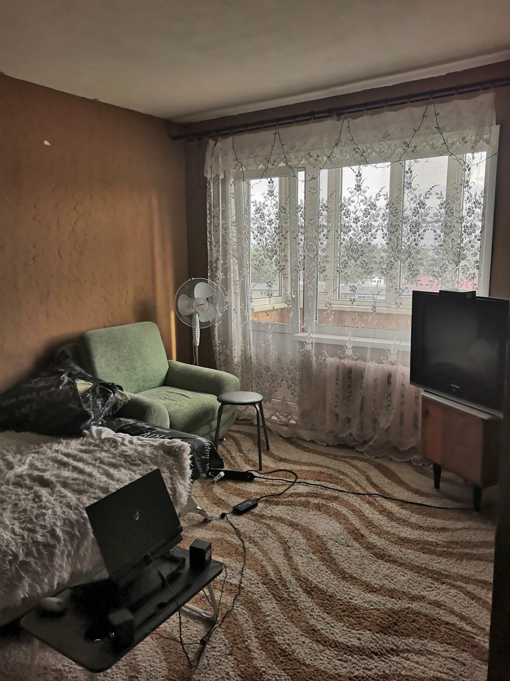 Квартира полностью мебелированная (встроенный большой шкаф купе, диван, кресло, на кухне стол, стулья, кухонный гарнитур, шкаф в прихожей), с бытовой техникой(холодильник, плита, микроволновая печь, стиральная машина, телевизор) Также остается палас, шторы, различная посуда.