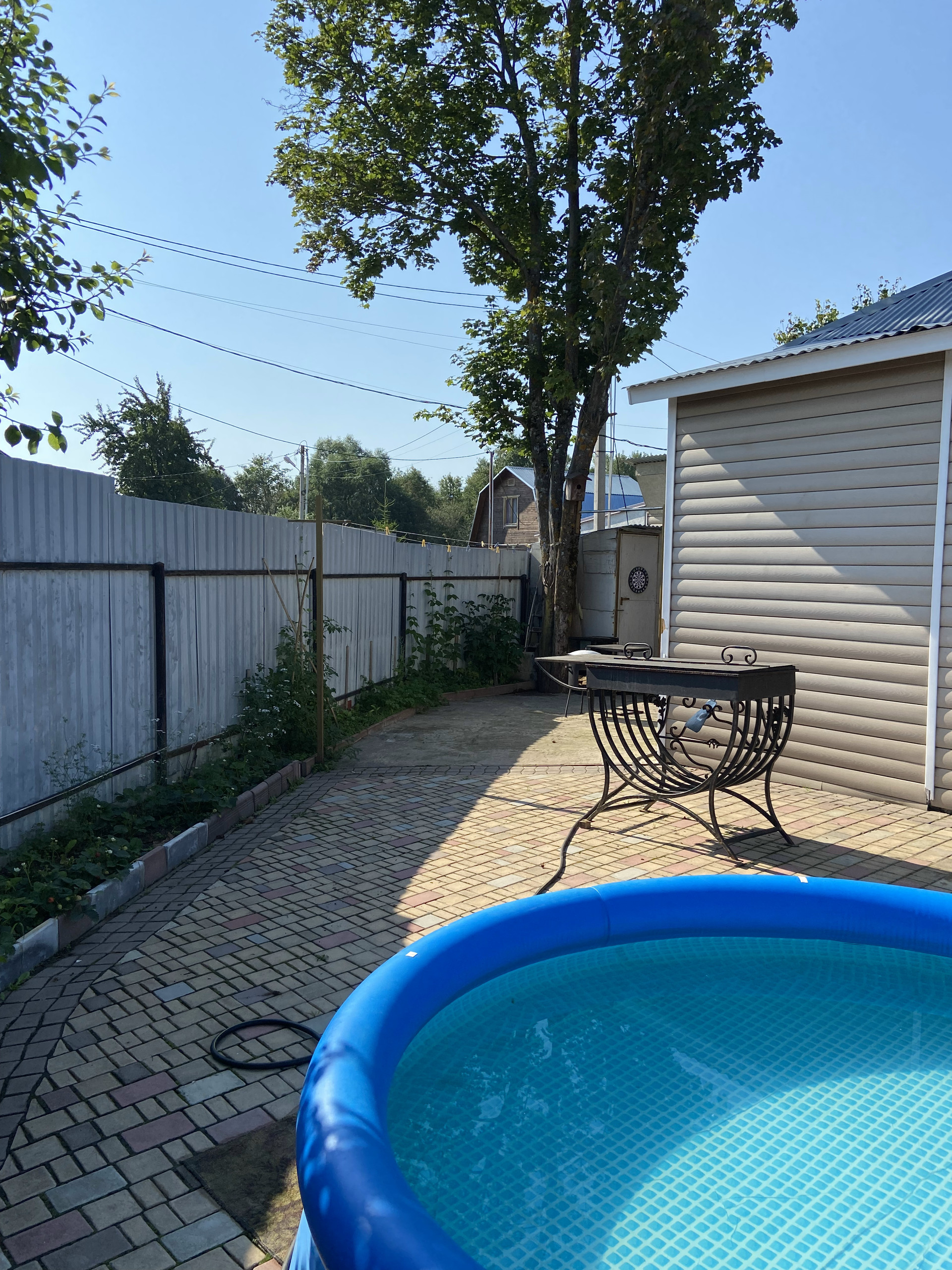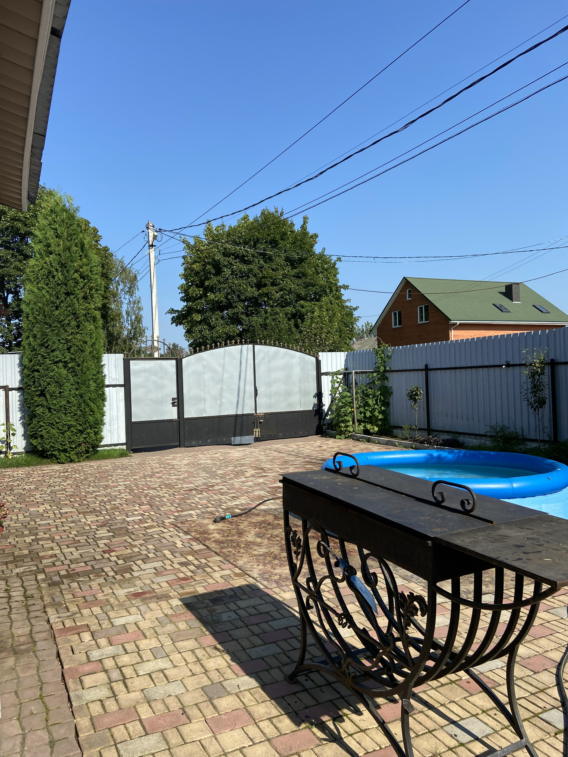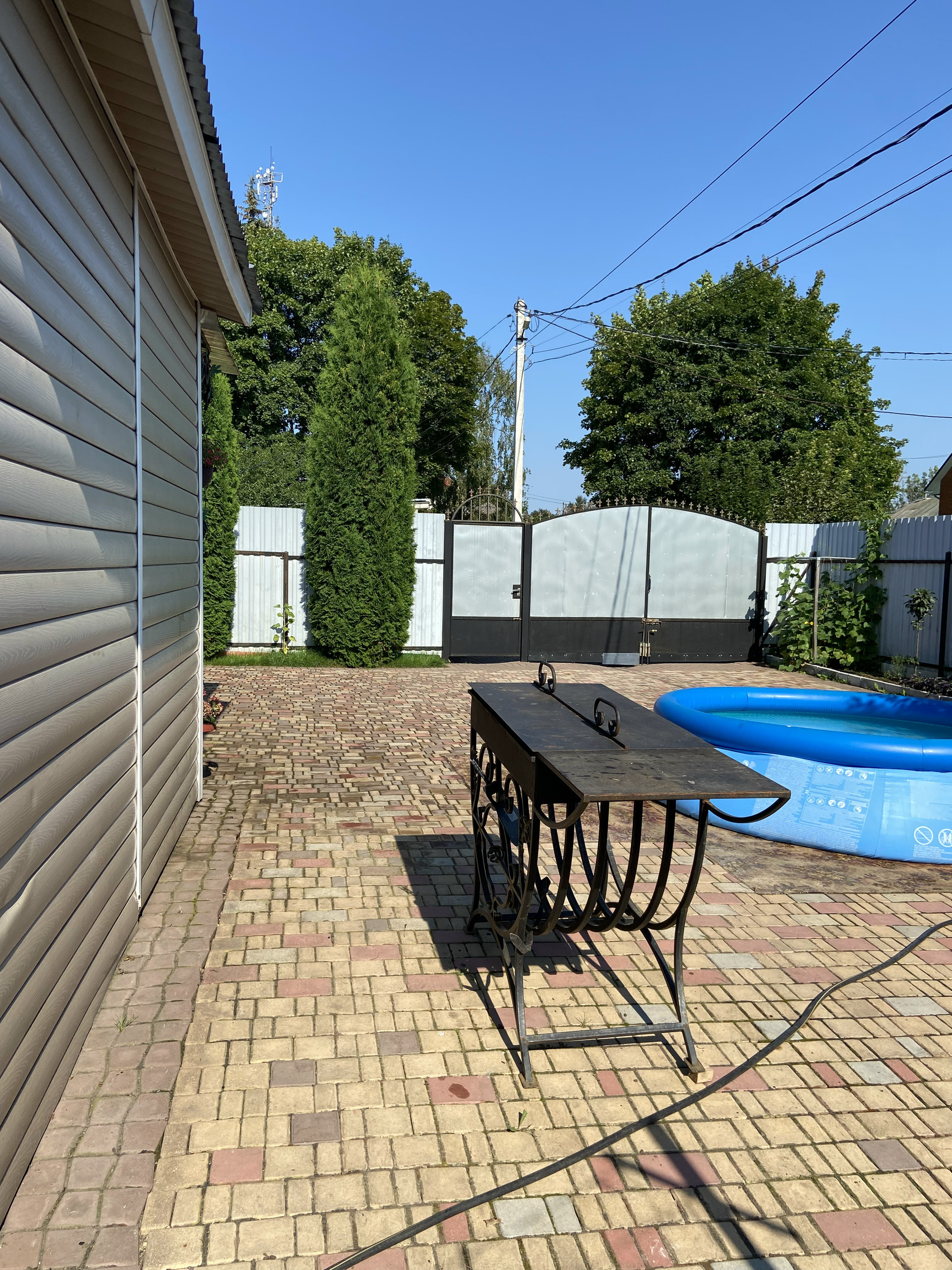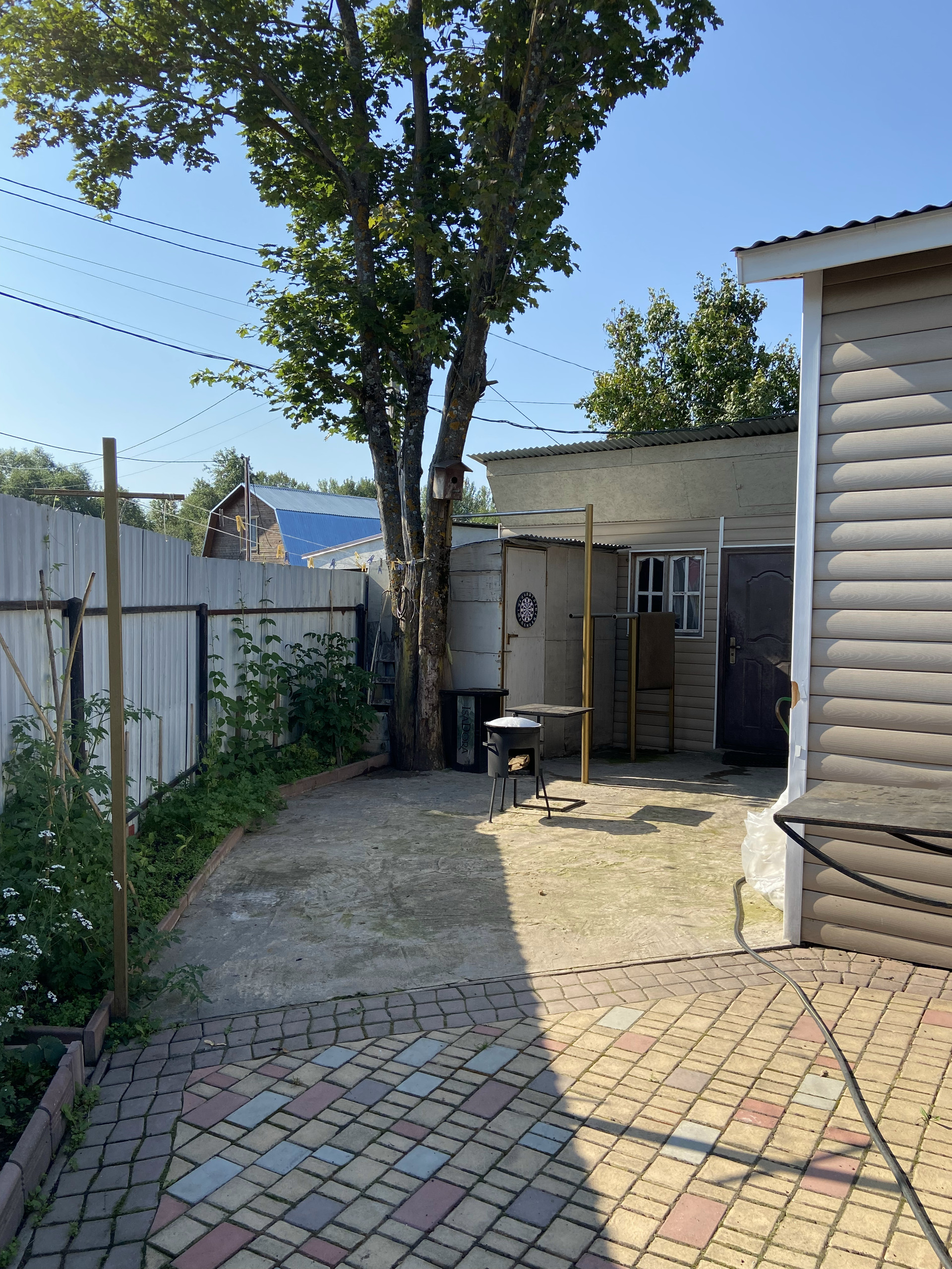 Во дворе уложен очень крепкий и надёжный английский брук с уклоном, чтобы вода стекала за забор. На улице выведен кран с водой, розетка.Сделан свет во дворе, можно включать вечером . Летом стоит бассейн. Есть коптильня, мангал, казан, брусья и турник. За домом стоит дровяник, и большая мастерская.