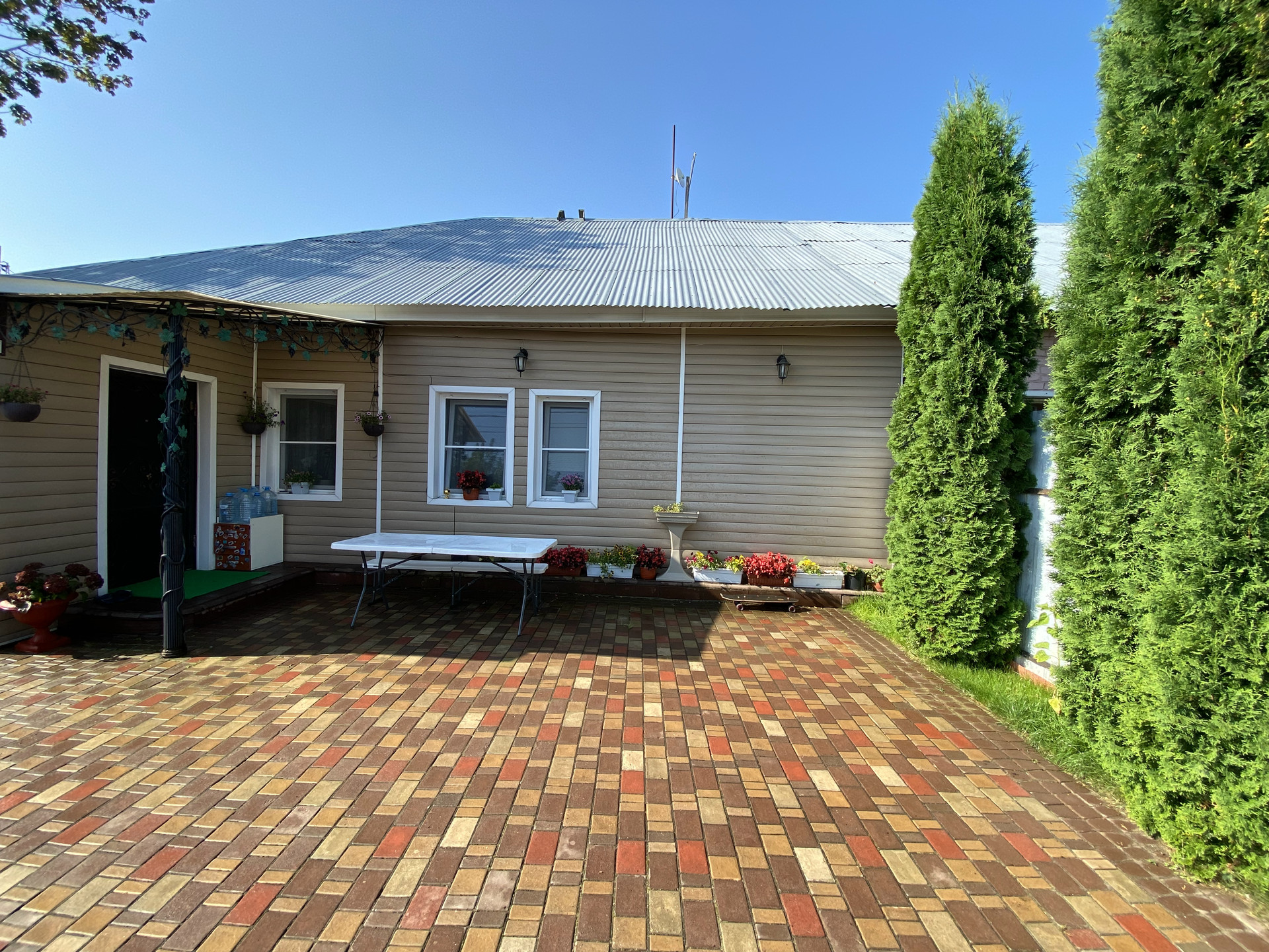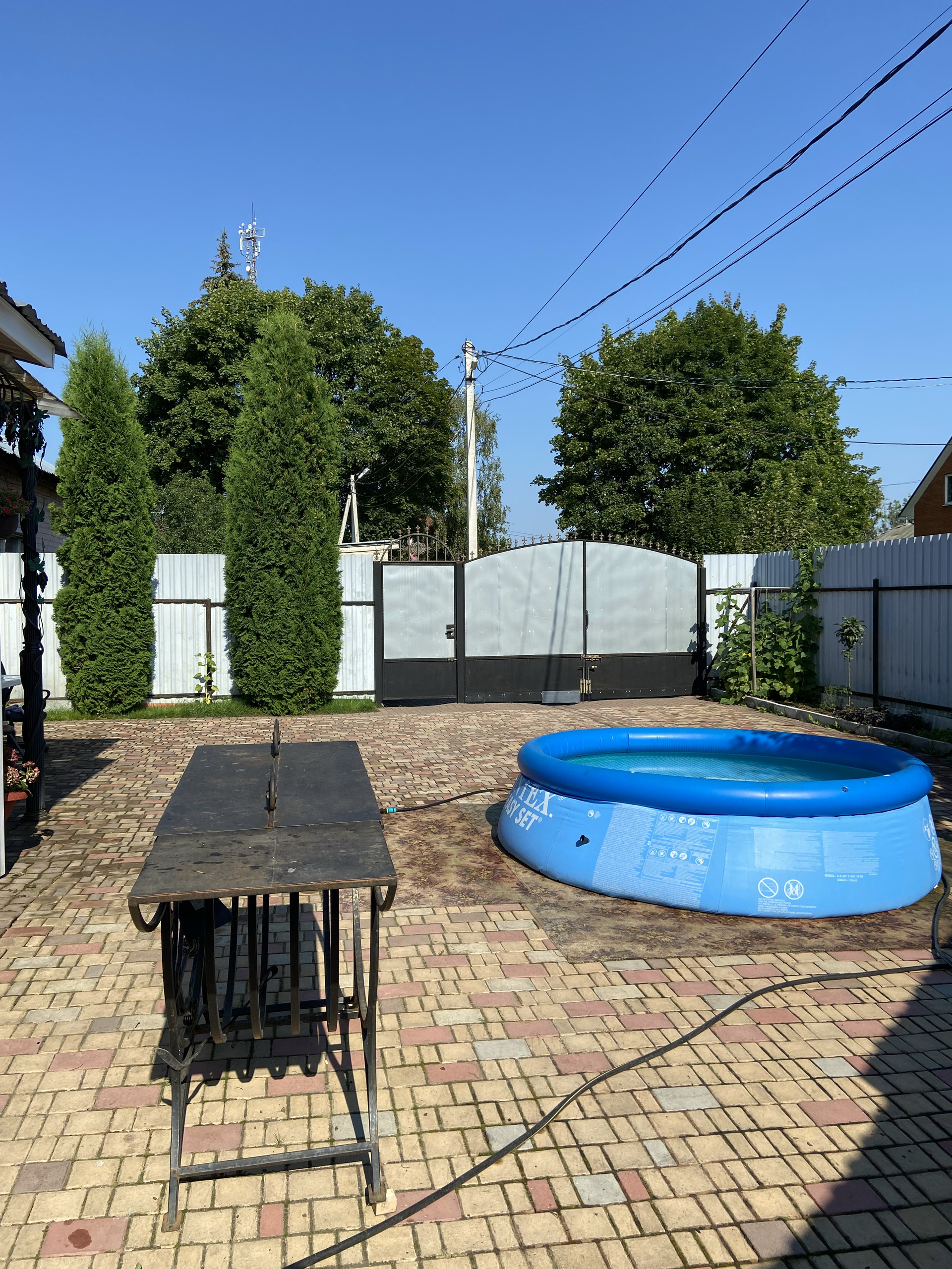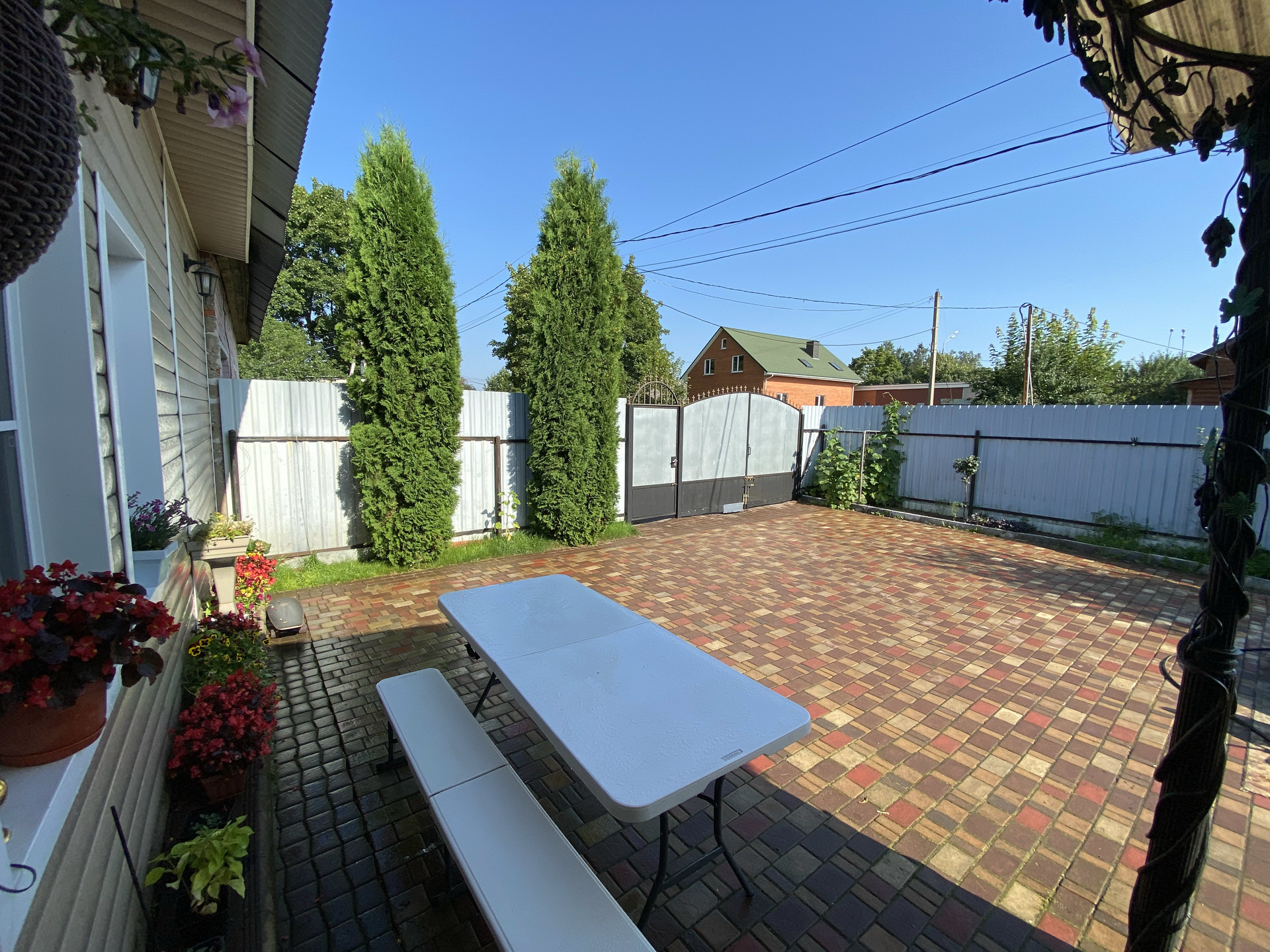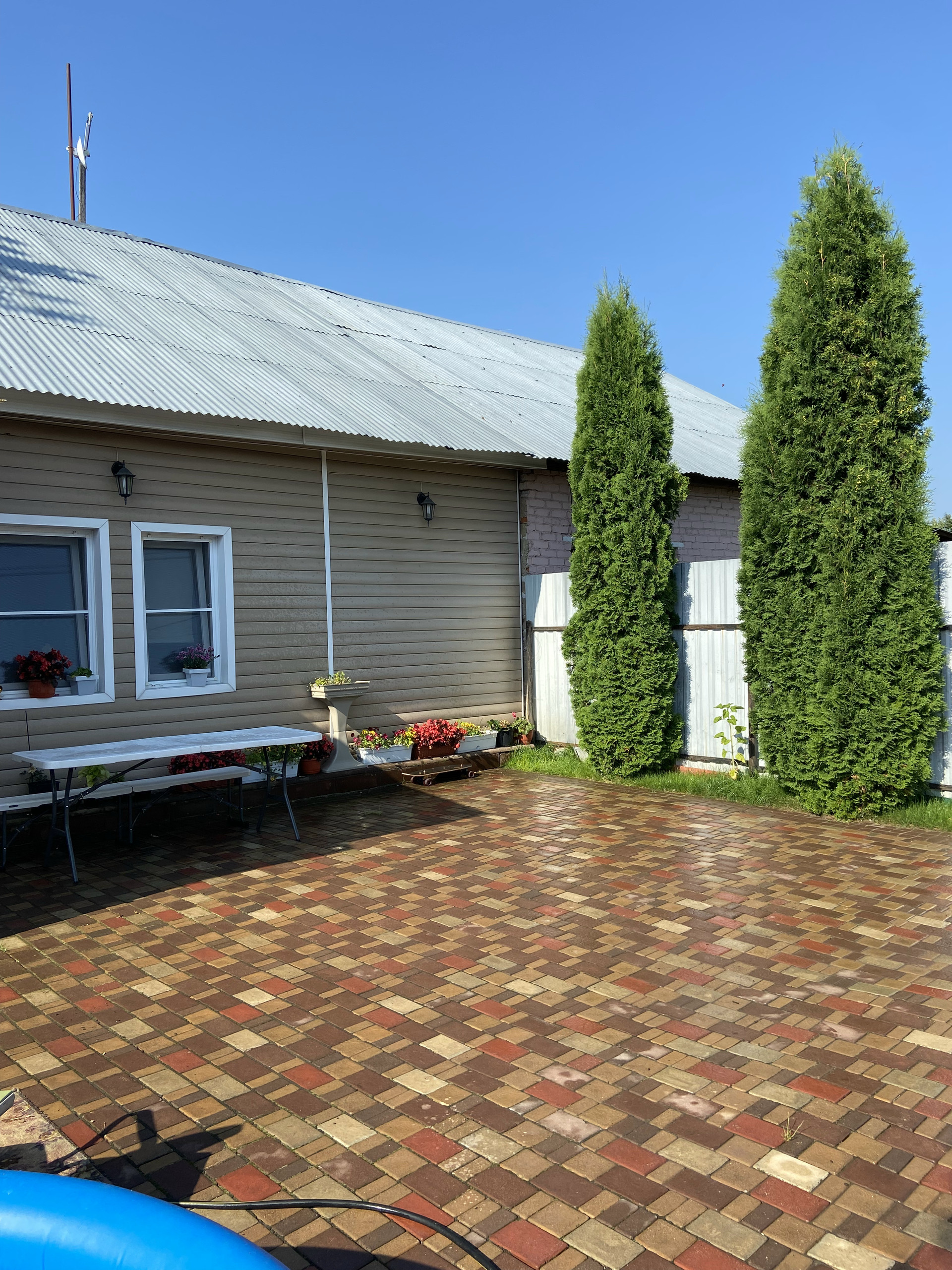 Во дворе уложен очень крепкий и надёжный английский брук с уклоном, чтобы вода стекала за забор. На улице выведен кран с водой, розетка.Сделан свет во дворе, можно включать вечером . Летом стоит бассейн. Есть коптильня, мангал, казан, брусья и турник. За домом стоит дровяник, и большая мастерская.