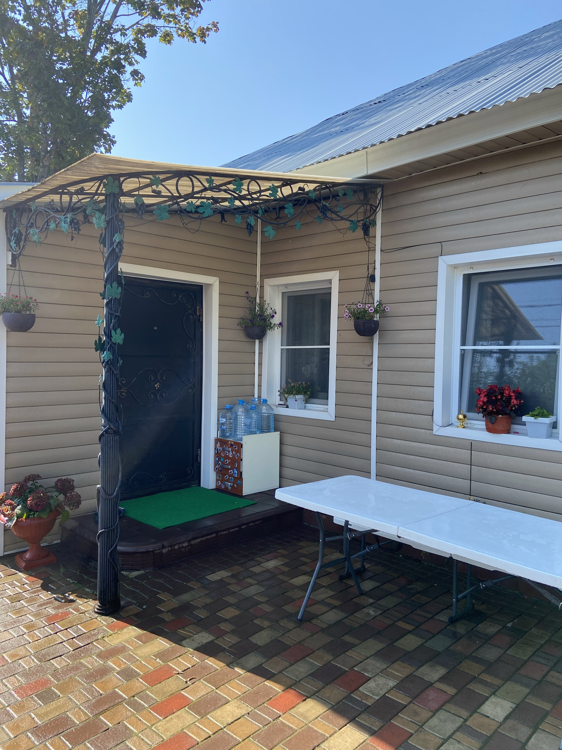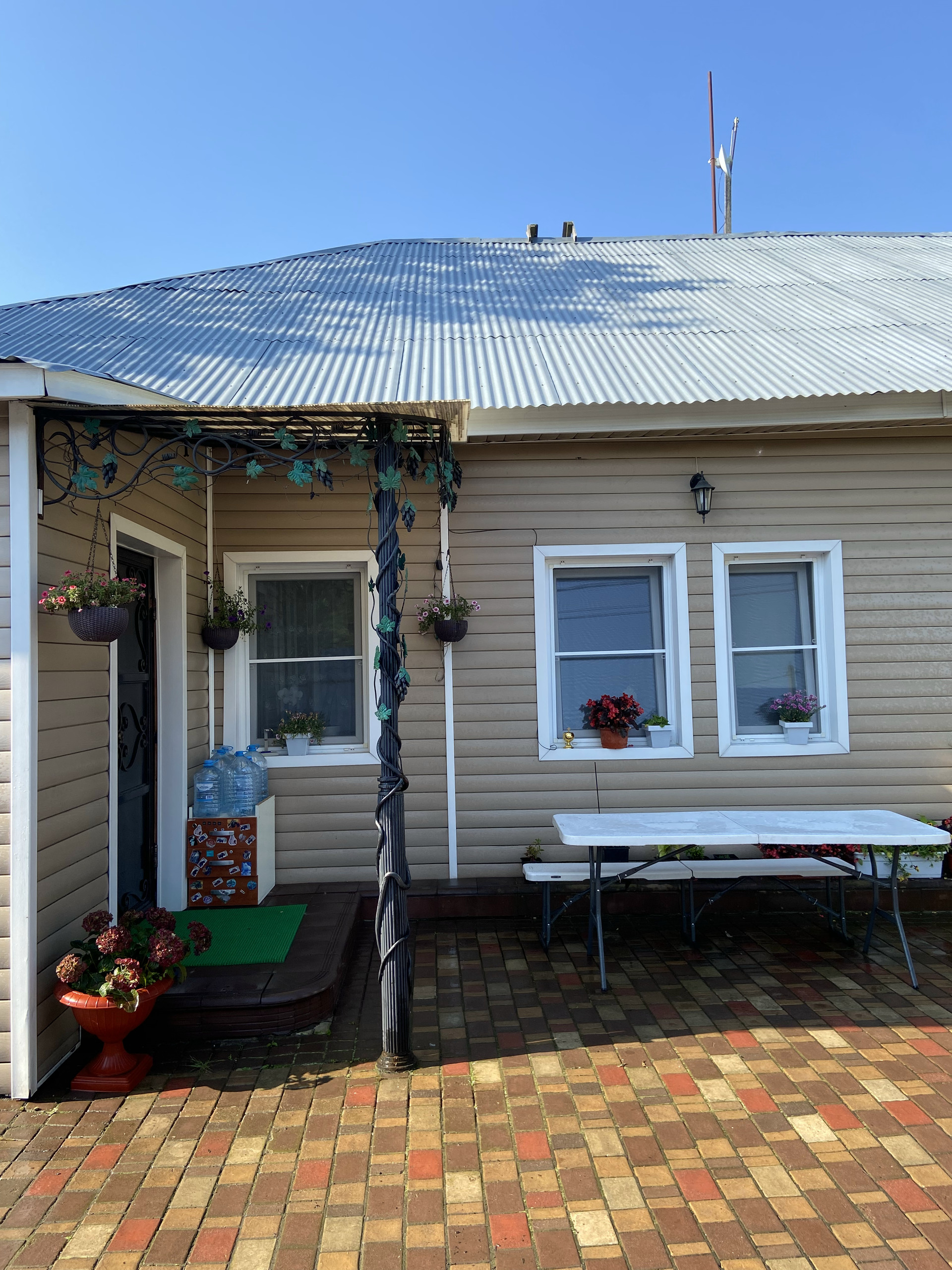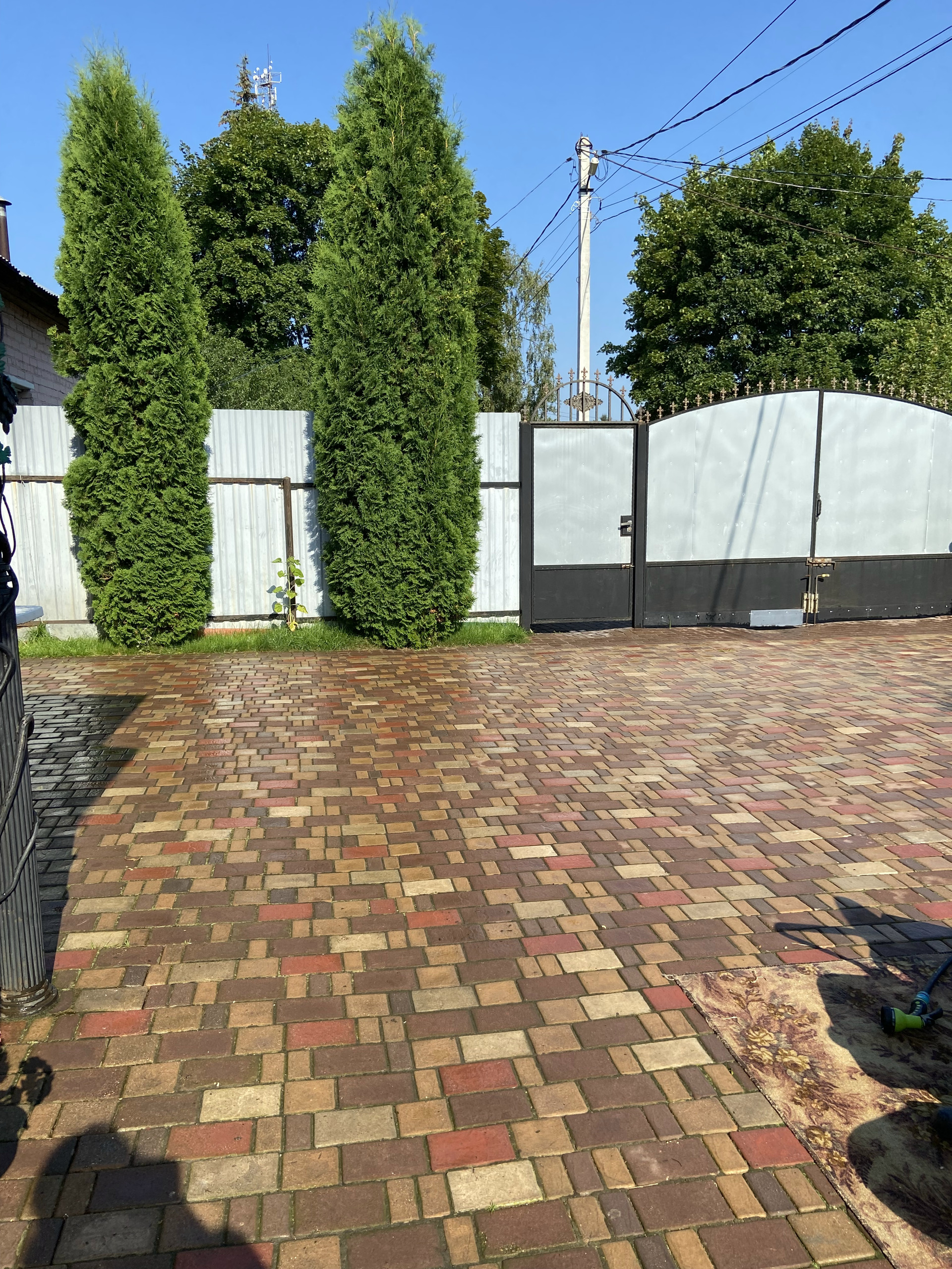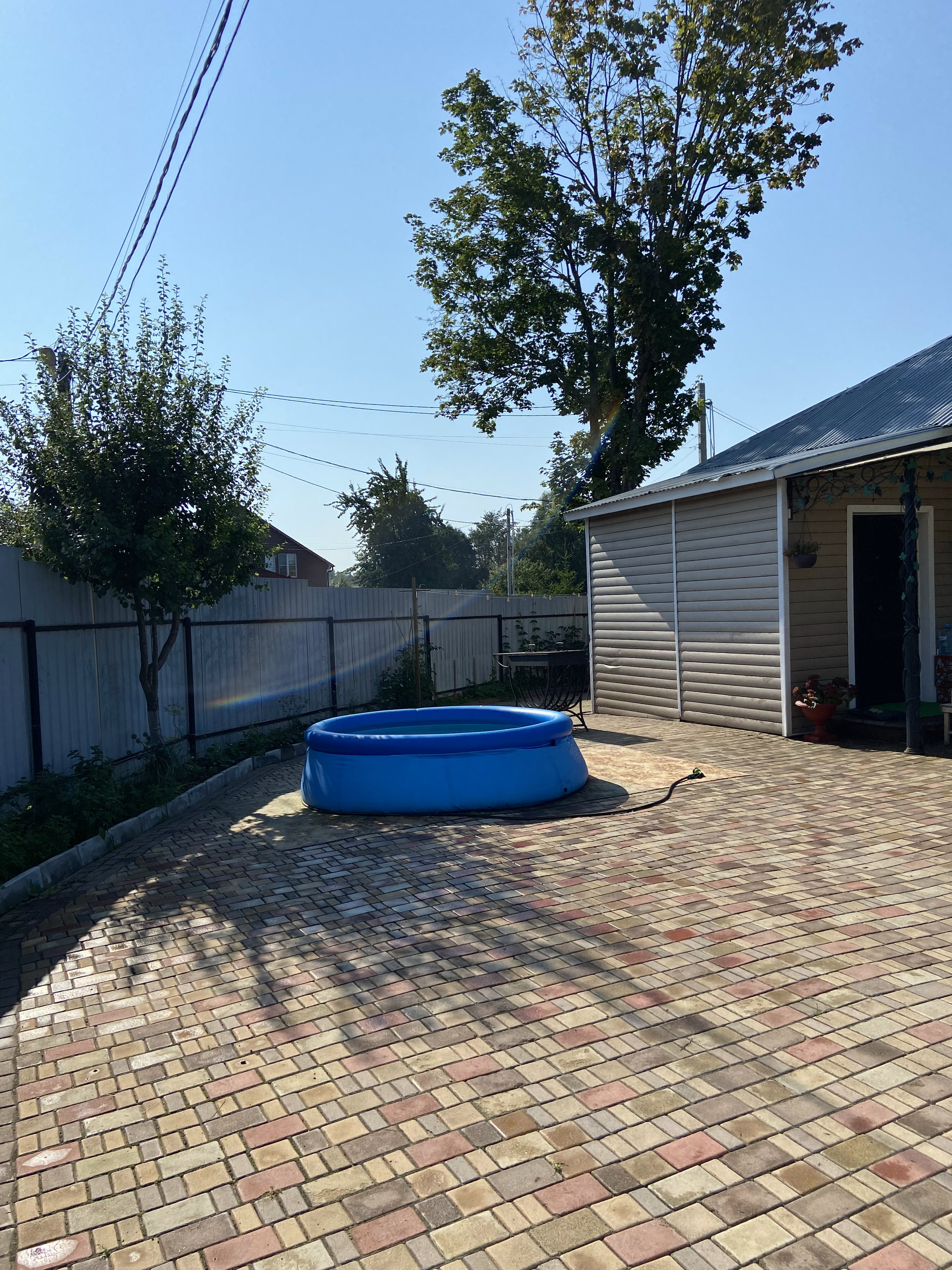 Во дворе уложен очень крепкий и надёжный английский брук с уклоном, чтобы вода стекала за забор. На улице выведен кран с водой, розетка.Сделан свет во дворе, можно включать вечером . Летом стоит бассейн. Есть коптильня, мангал, казан, брусья и турник. За домом стоит дровяник, и большая мастерская.