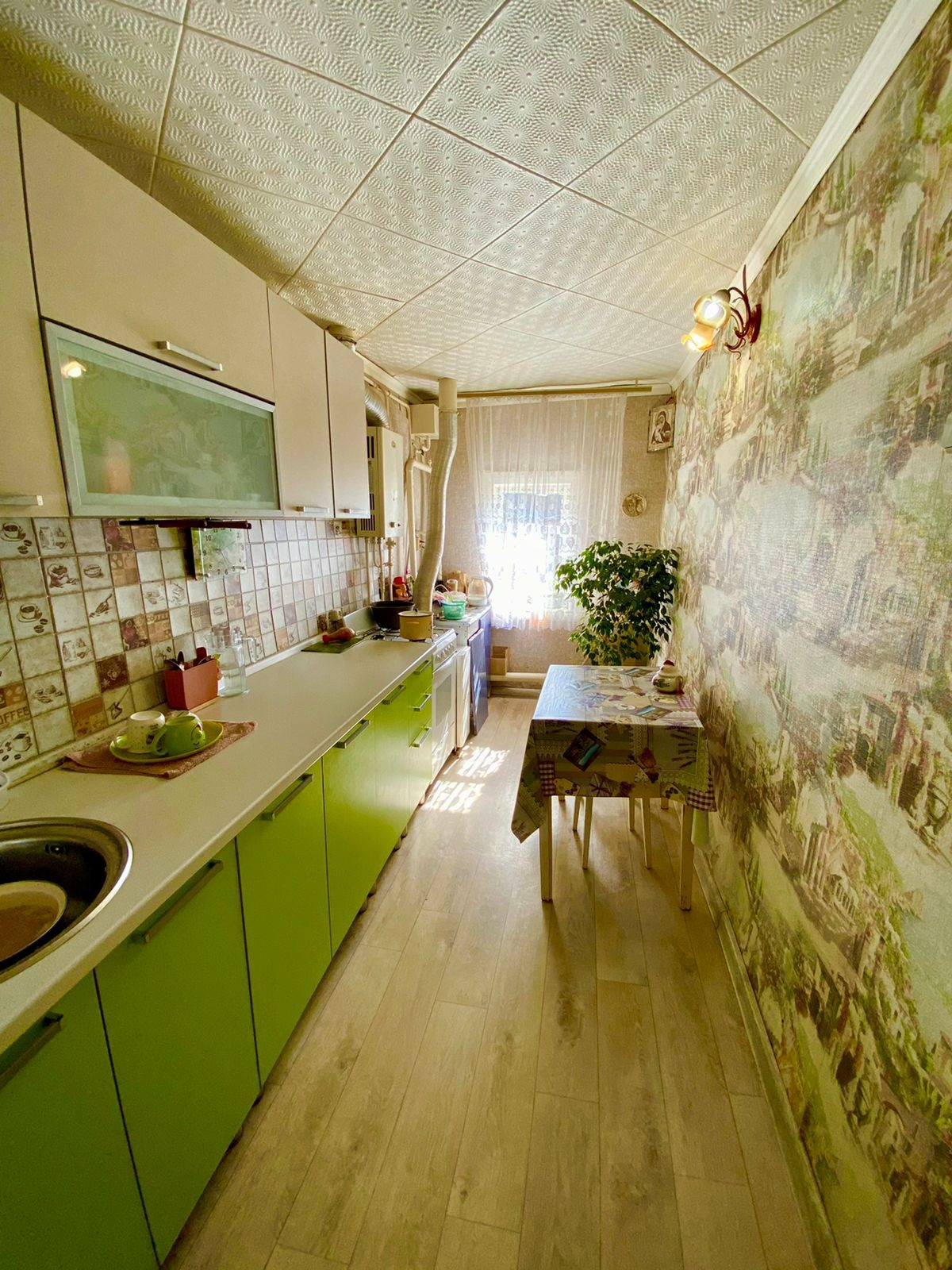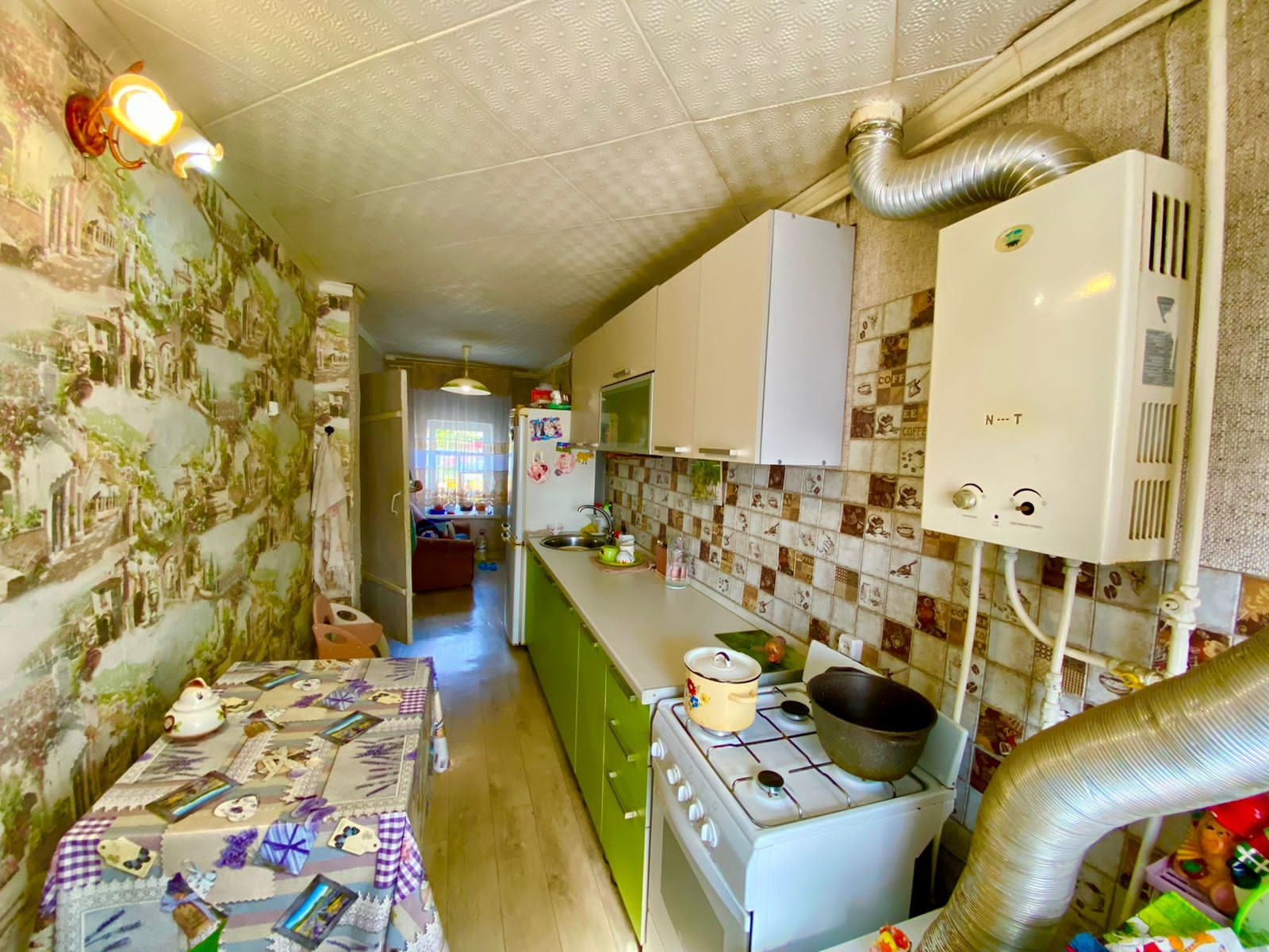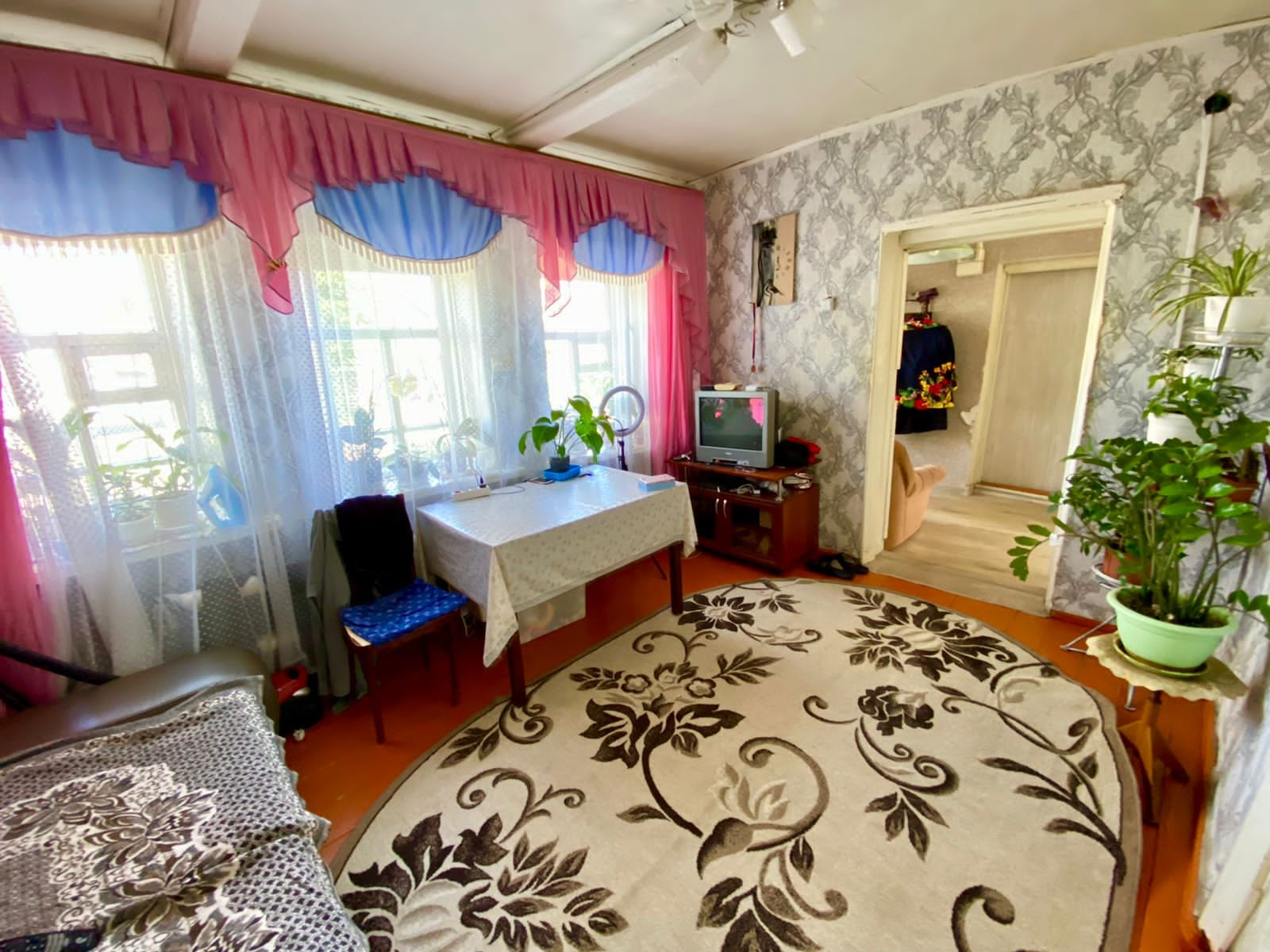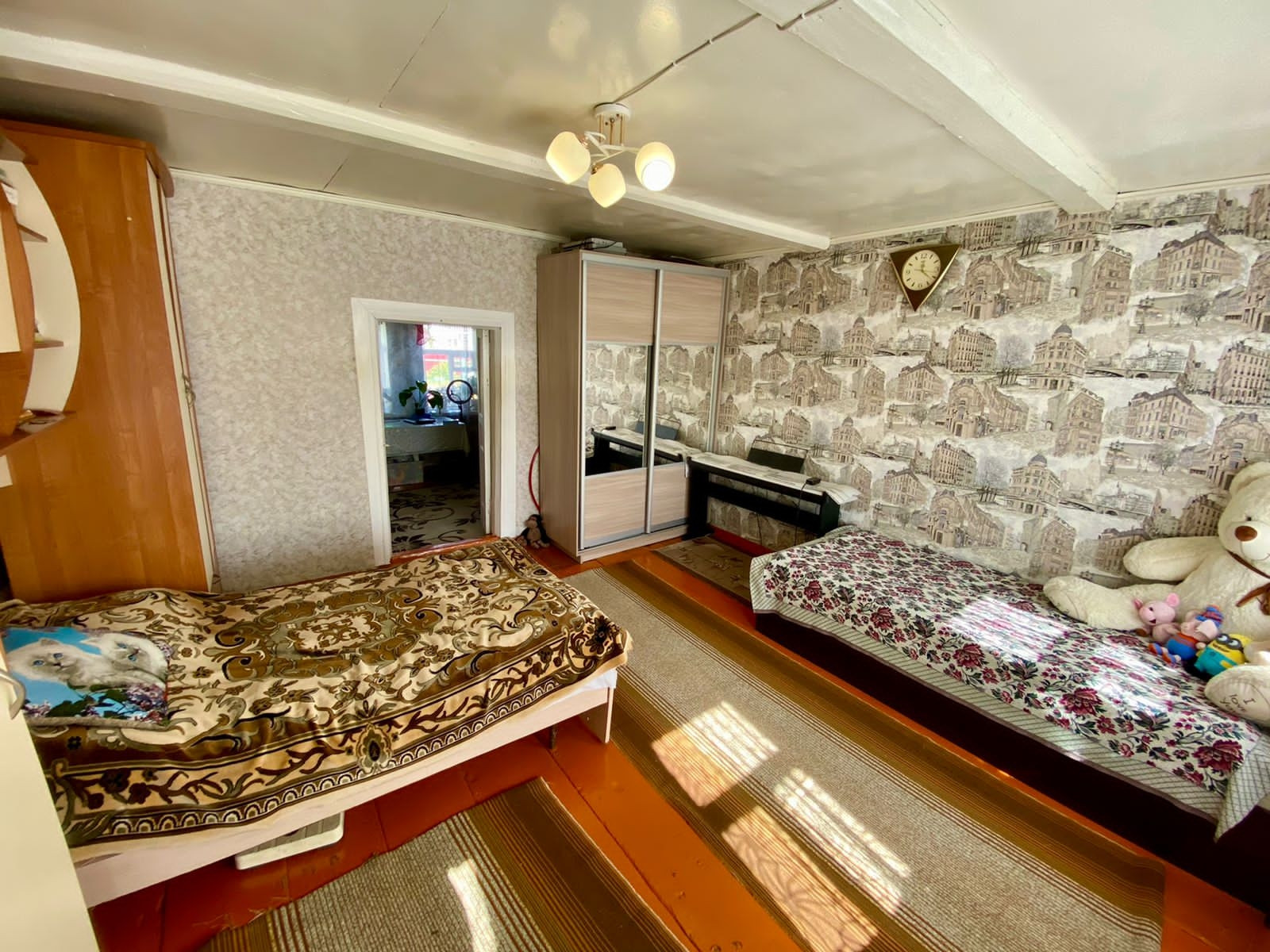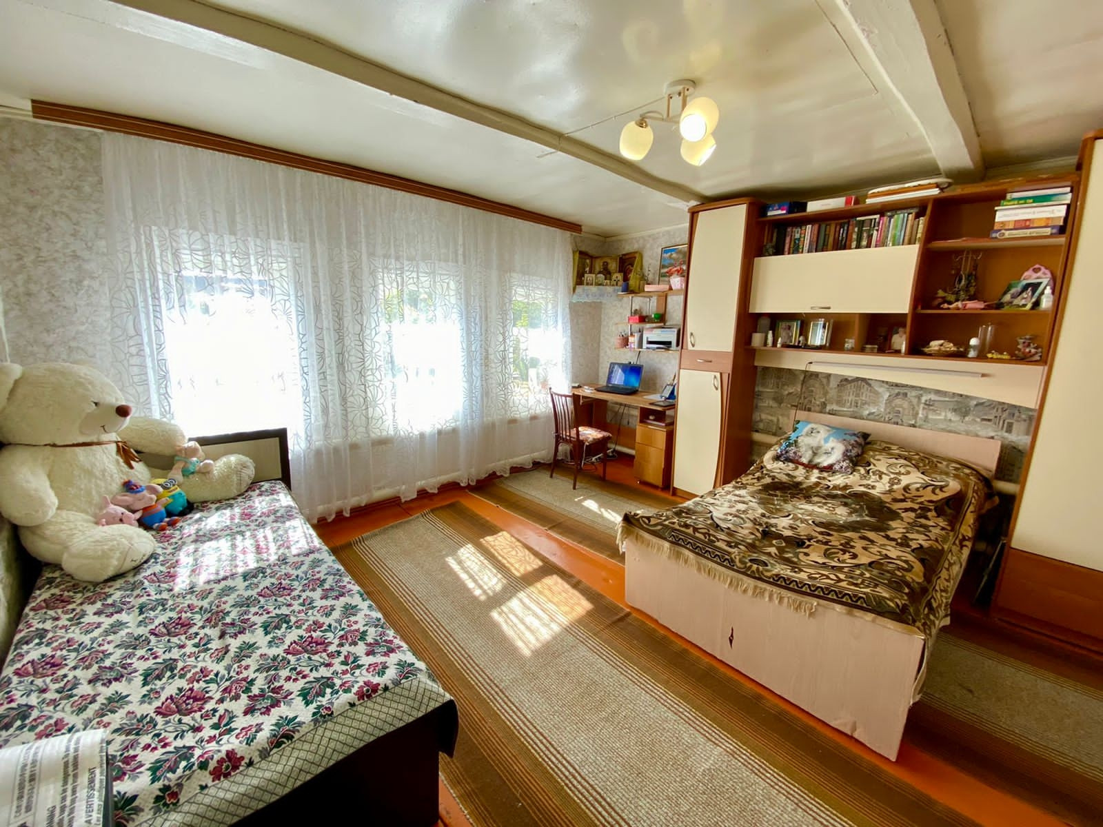 Общая площадь - 46 кв.м., две комнаты и кухня. Комнаты светлые и уютные. Очень теплый дом, материал стен: бревно. В дом подведен центральный водопровод, канализация центральная, на отопление установлен котел "газовик", на горячую воду газовая колонка и бойлер.