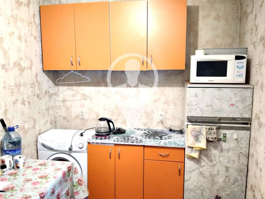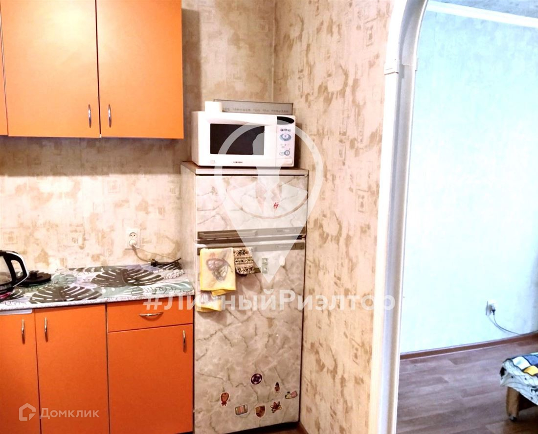Комната разделена аркой на две части. (в первой части установлен кухонный гарнитур, холодильник, стиральная машина, вместительный шкаф, вторая часть используется как спальня.