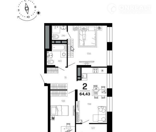 Общая площадь 64.4 м2