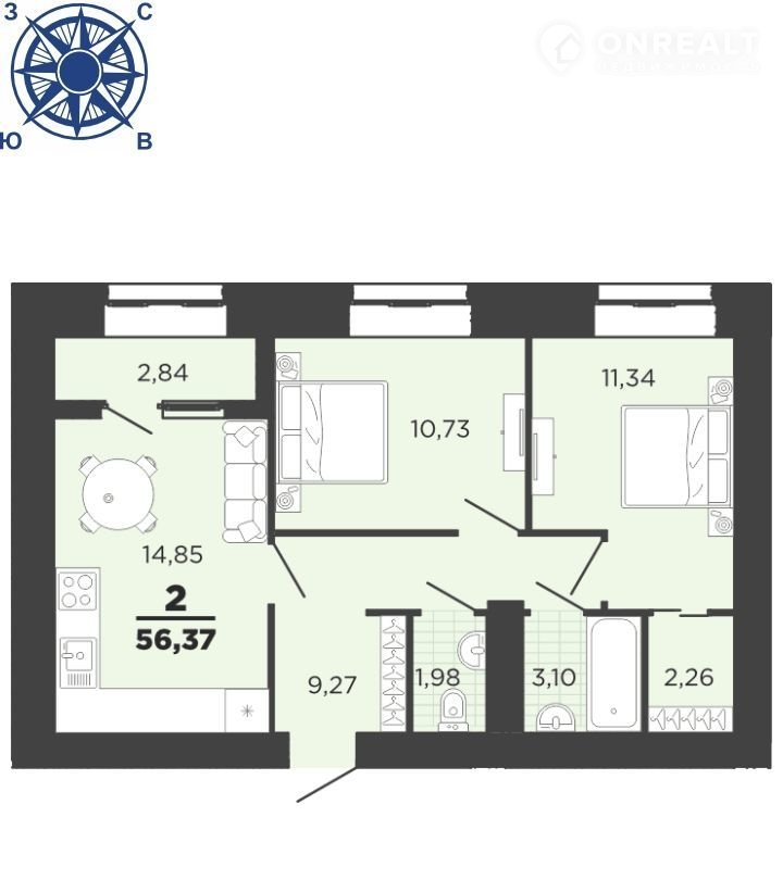 Общая площадь 56.4 м2