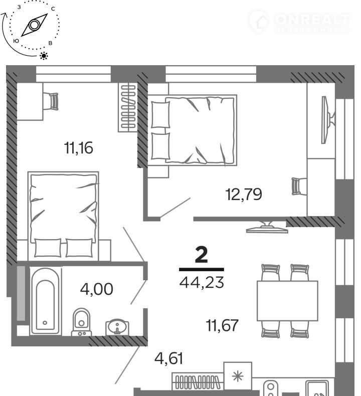 Общая площадь 44.2 м2