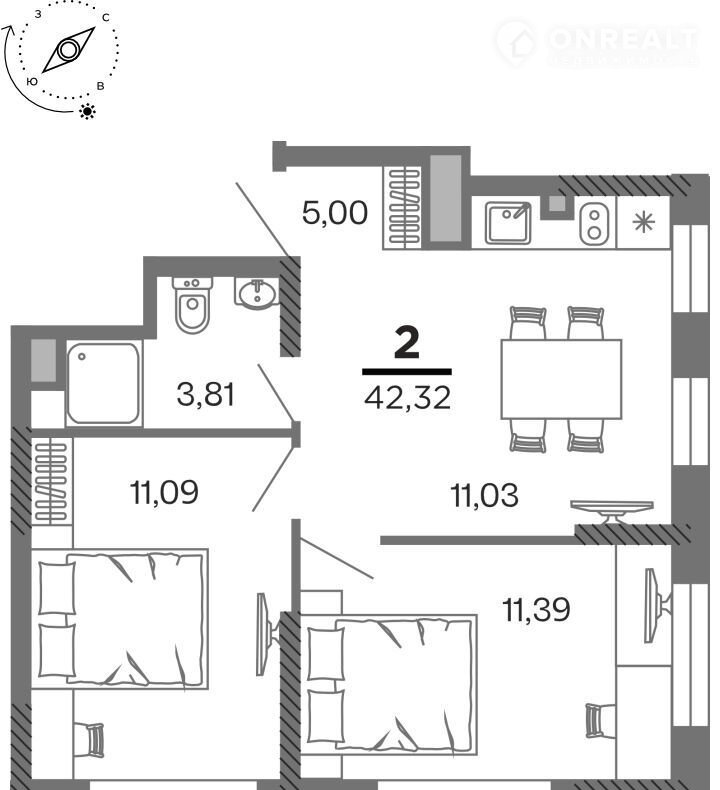 Общая площадь 42.3 м2