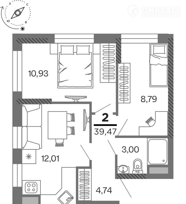 Общая площадь 39.5 м2