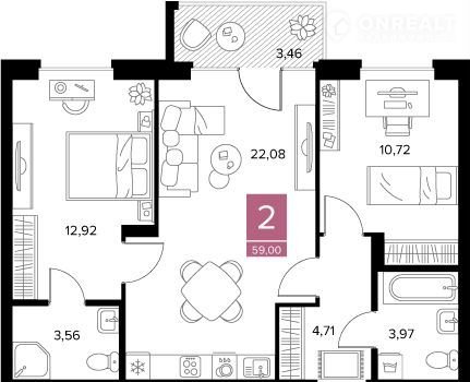 Общая площадь 59 м2