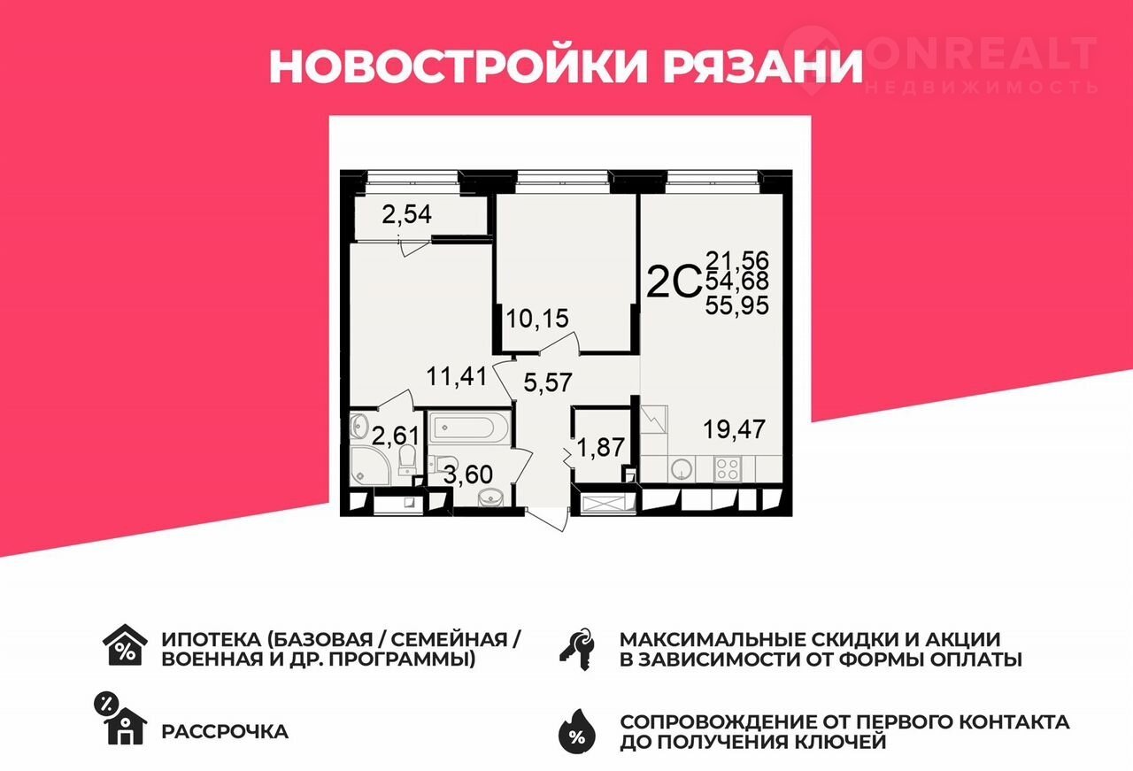 ЖK «Нoвое измерeние» - 2-к квартирa - 55.95 м²