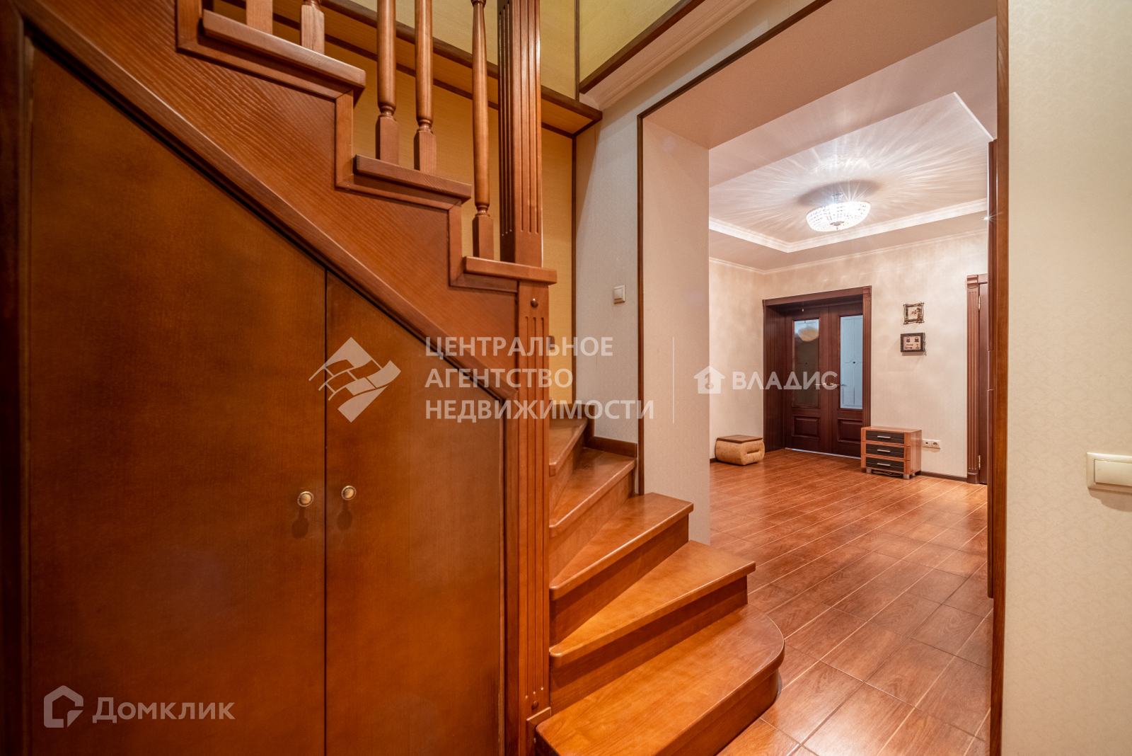 Лестница на второй этаж расположена в коридоре, на металлическом каркасе, дерево - итальянский ясень. Это гарантия долговечности, подчеркивает солидность и статусность квартиры. Лестница освещается проходными выключателями - удобно и безопасно! Под ней размещена зона стирки.