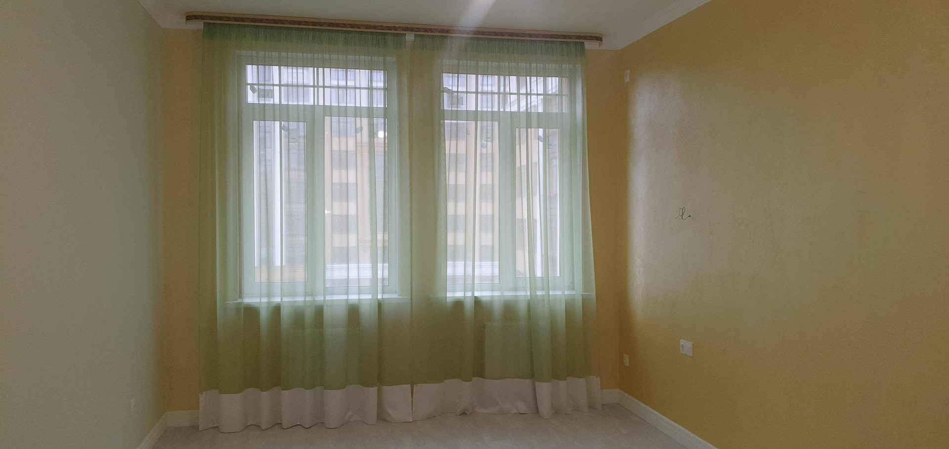 В гостиной два больших окна с видом во двор .
