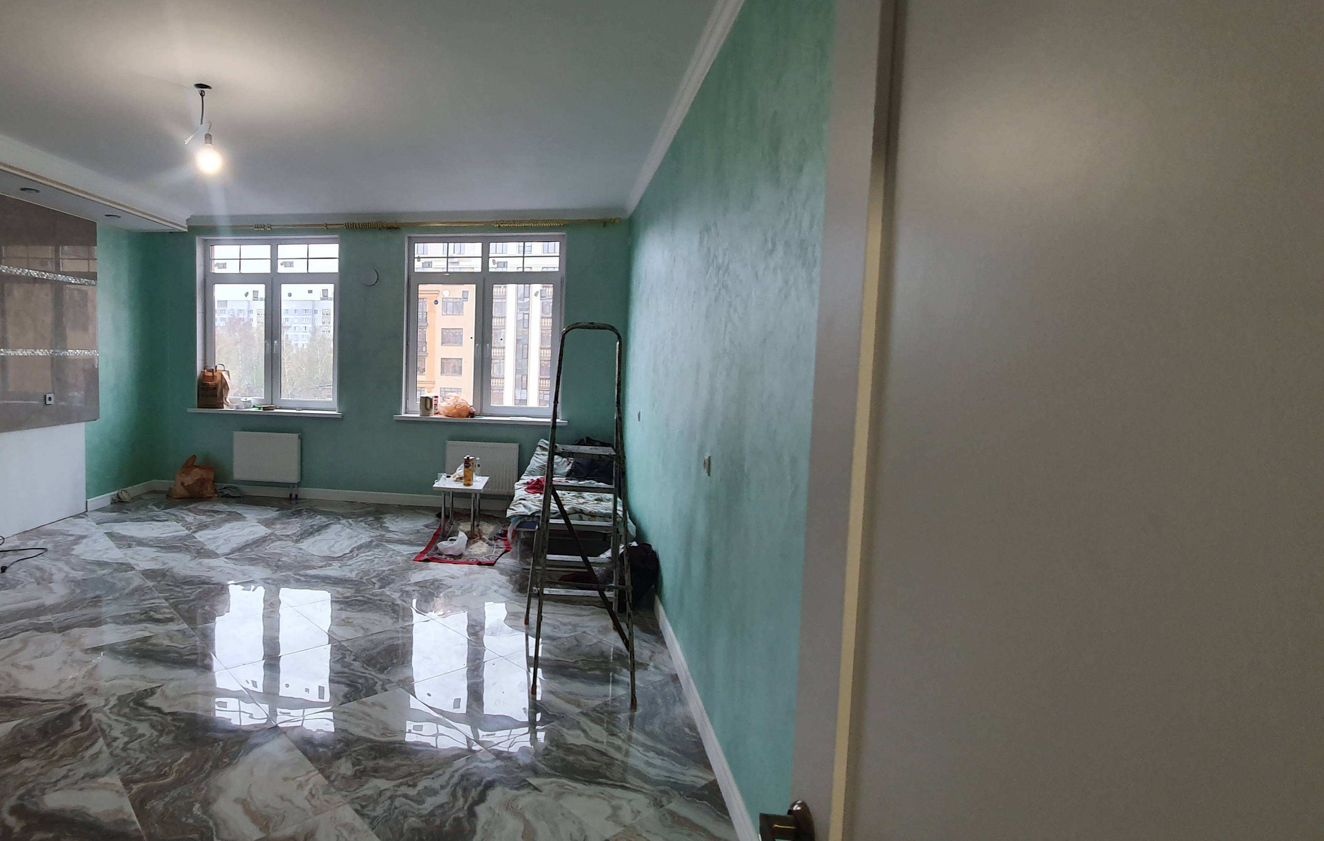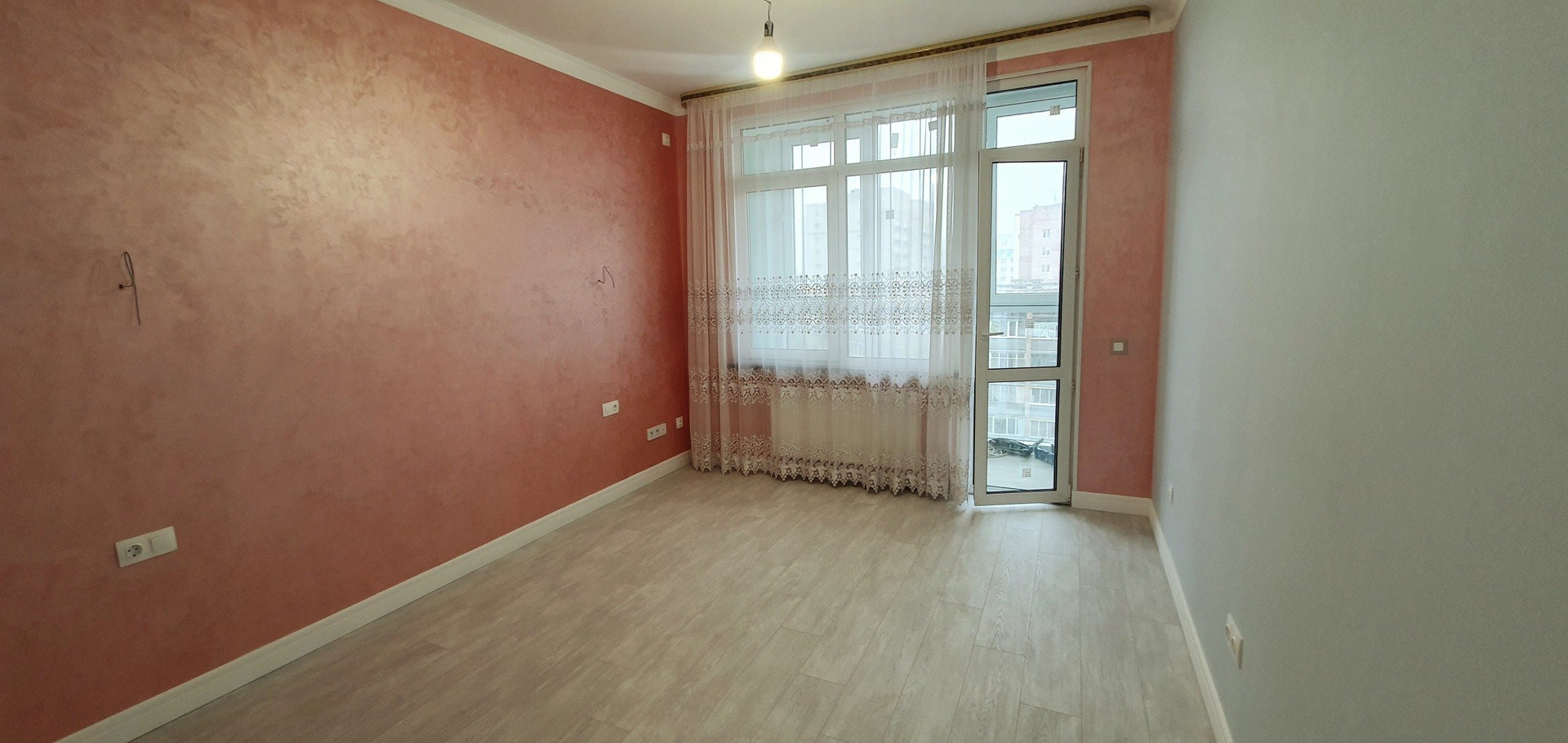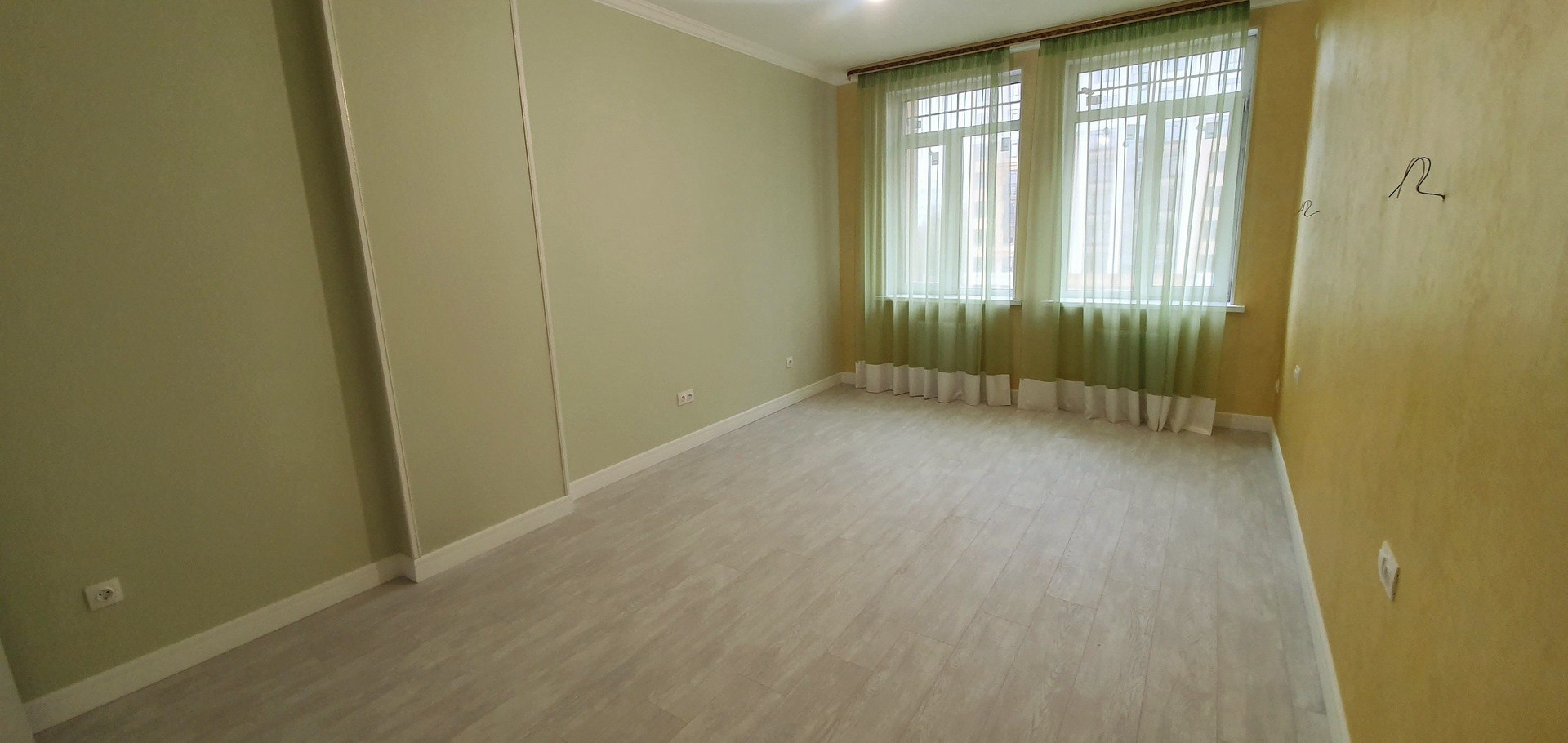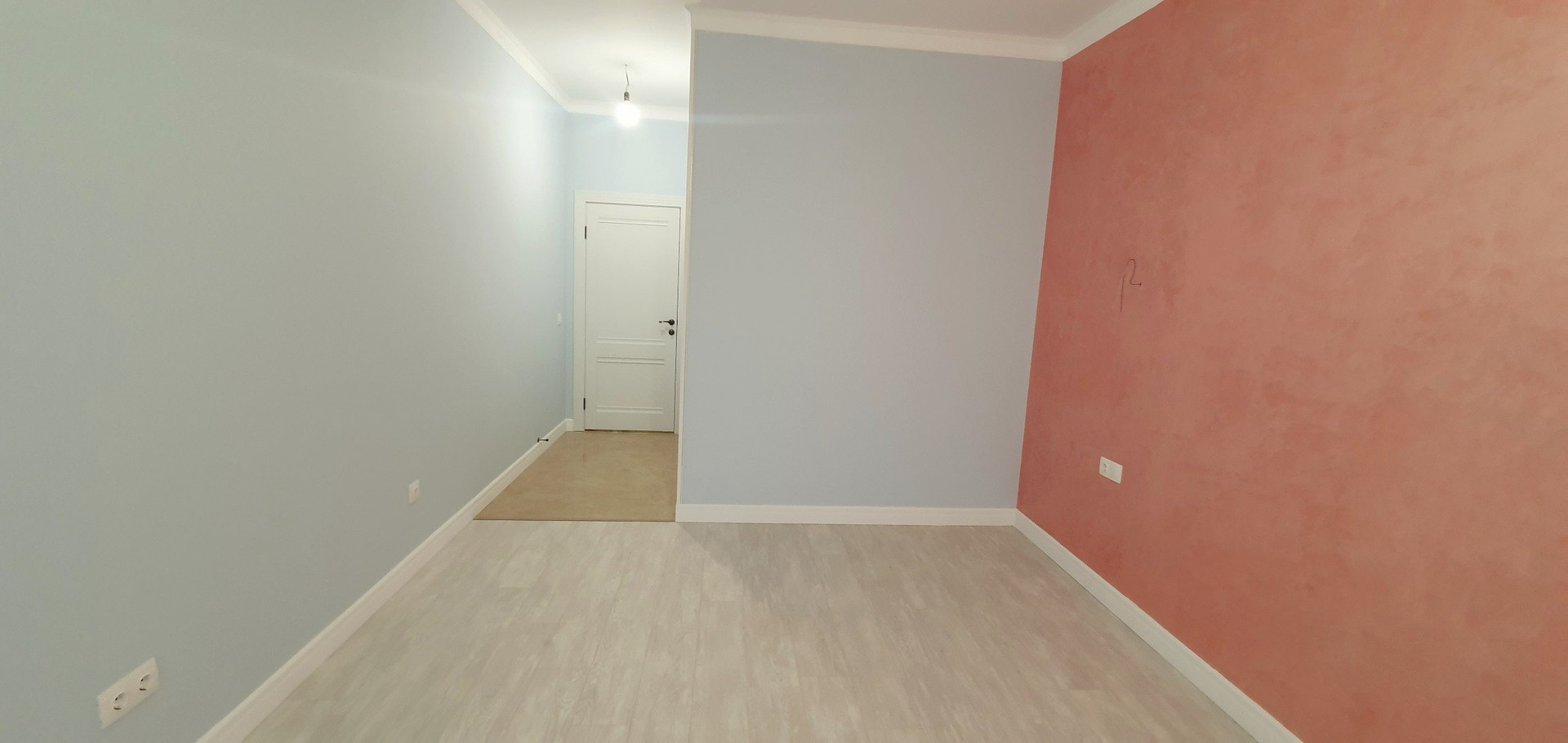 Стены качественно отшпаклеваны и покрыты краской мокрого Шелка с перламутром.Цвет стен от нежной мяты до нежного персика. Замечу ,что в комнате без обоев дышится гораздо легче .
