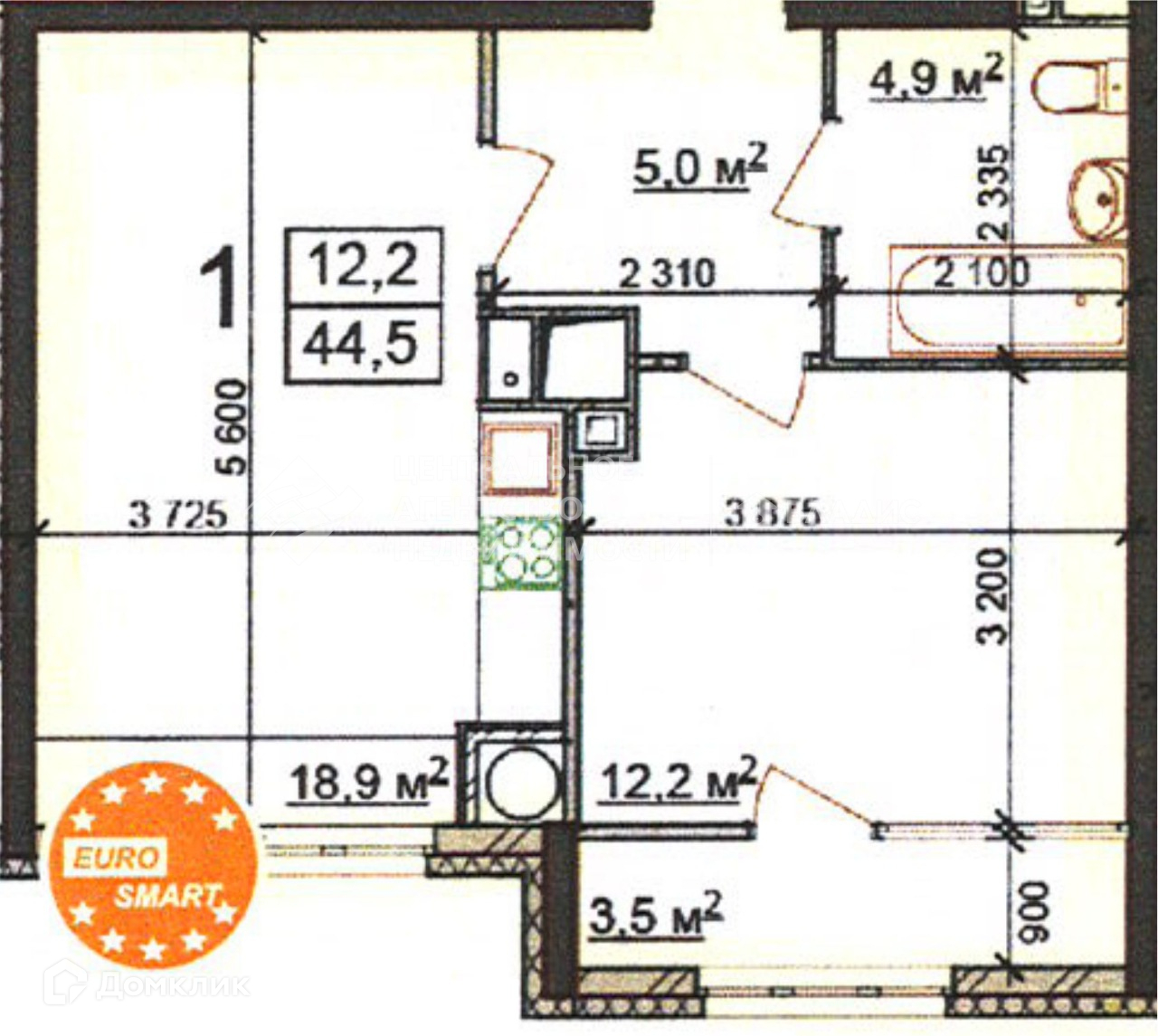 Площадь квартиры 44,5 кв.м.