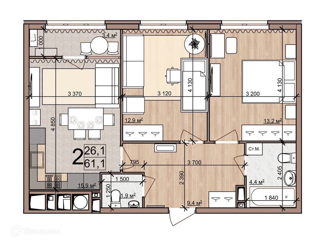 Общая площадь 61.1 м2