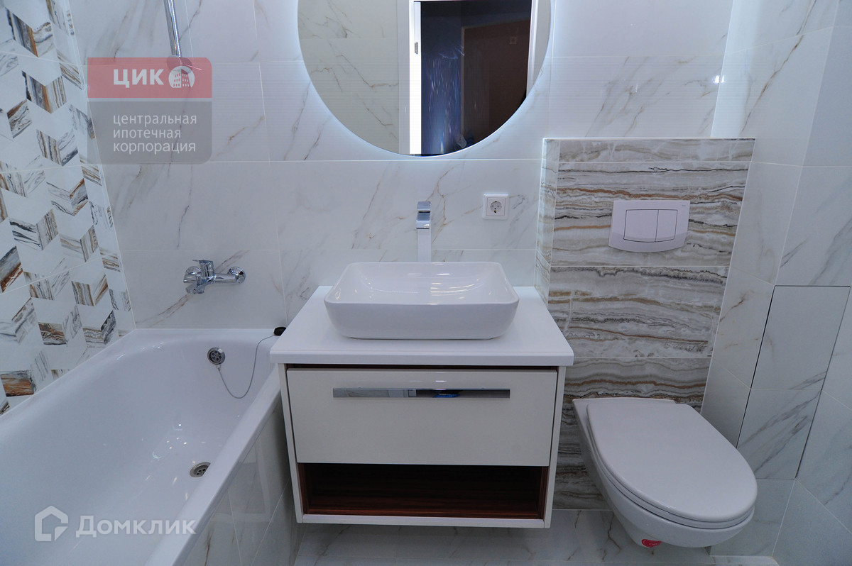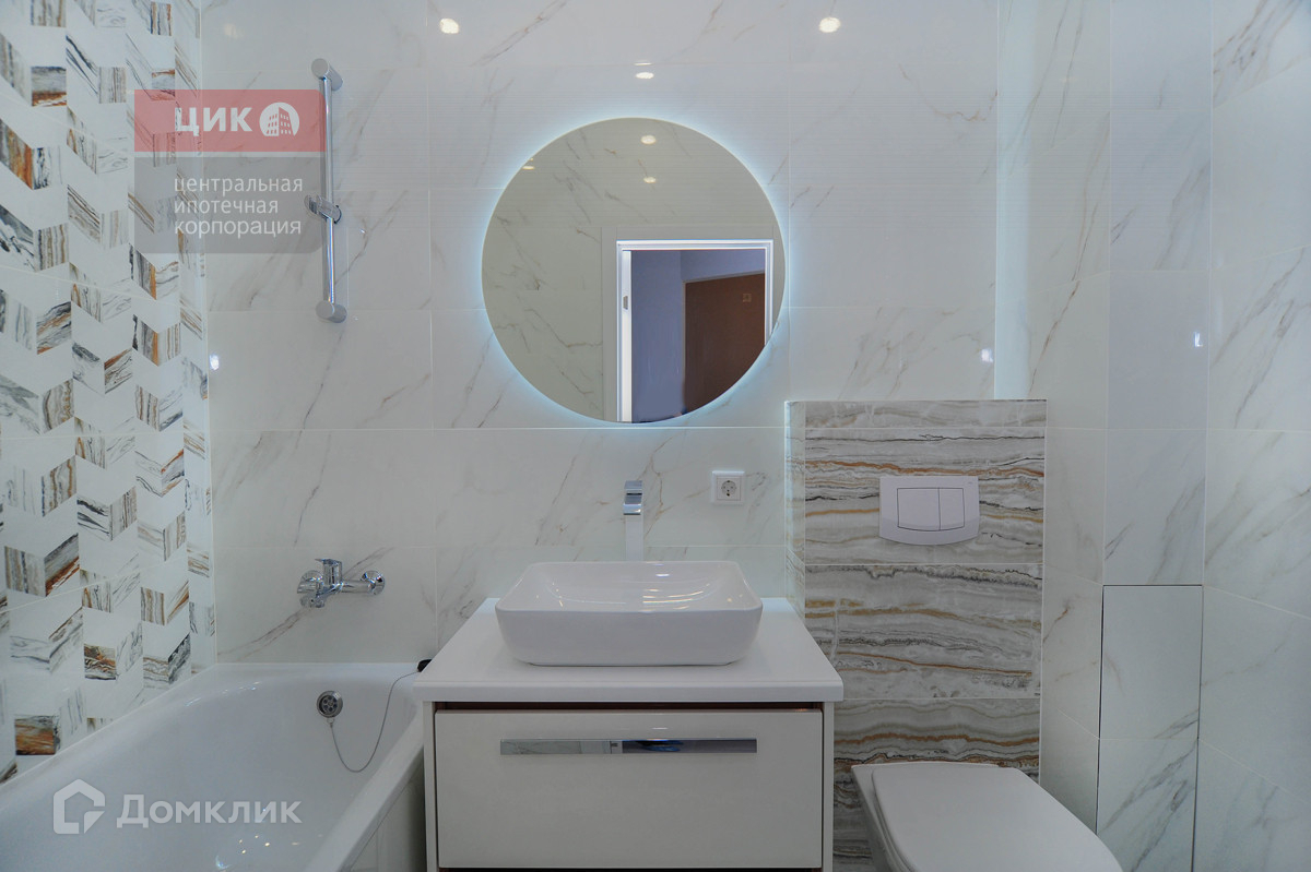 Ванная комната выполнена в светлых тонах с  современным зеркалом с парящей  подсветкой,(что  создаст романтичную атмосферу).