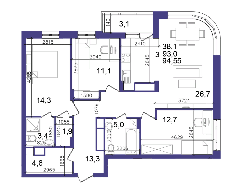 - Квартира удобной и продуманной планировки: три комнаты (11,1 12,7 , 14,3 кв.м), кухня-гостиная 26 кв.м с эркерным остеклением и видом на ПОЙМУ, 1 балкон, 2 санузла, 2 гардеробные комнаты.