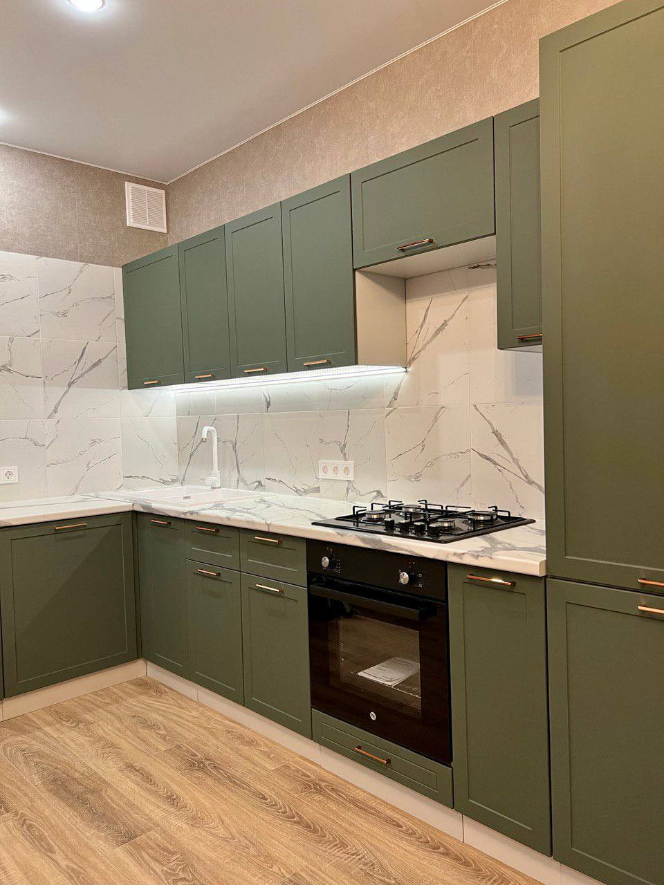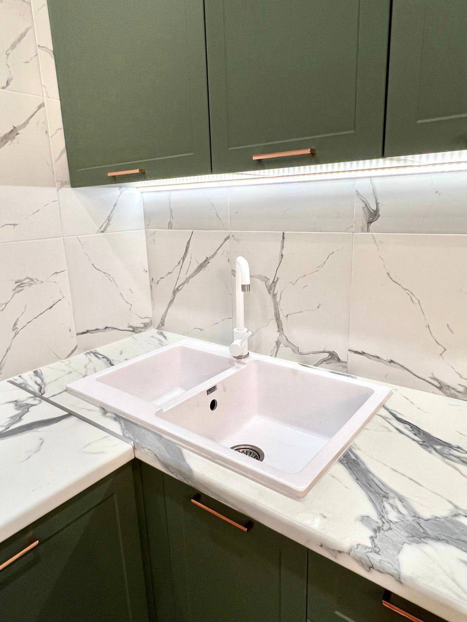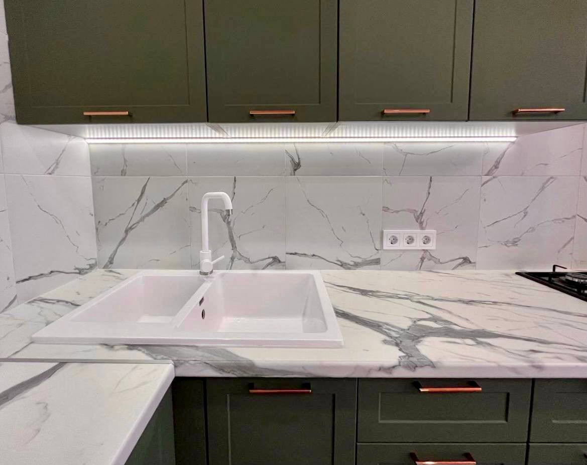 10. КУХНЯ. Кухонный гарнитур делали по индивидуальному проекту. Все подогнано до мм: шкафы, освещение, подключение бытовая техники и тд. Варочная панель не соприкасается ни с чем, кроме фартука из керамогранита. Удалена от воды. Раковина в кухне из камня, большая, двойная. Много рабочей поверхности для готовки.