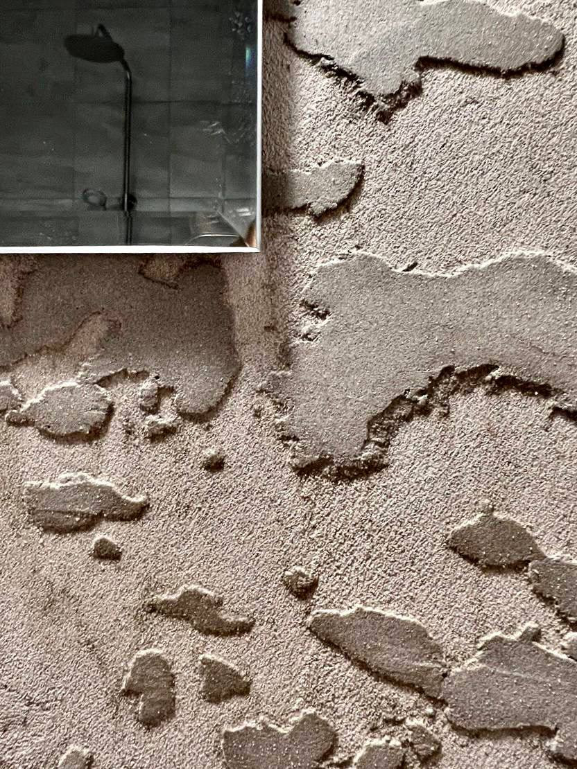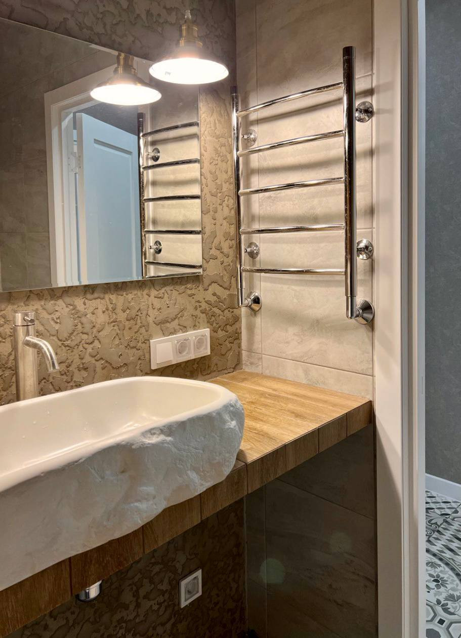 В ванной декоративная штукатурка «арт бетон». Фотообои имитируют фрагмент знаменитого барельефа. Ручки дверей минималистичные, белые в цвет крана и раковины в кухне. Столешница и фартук в кухне из разных материалов, но цвет и рисунок одинаковые. Это создаёт монолитное пространство. Все шторы мягкие, не мнутся, высокого качества.