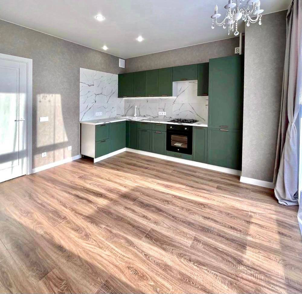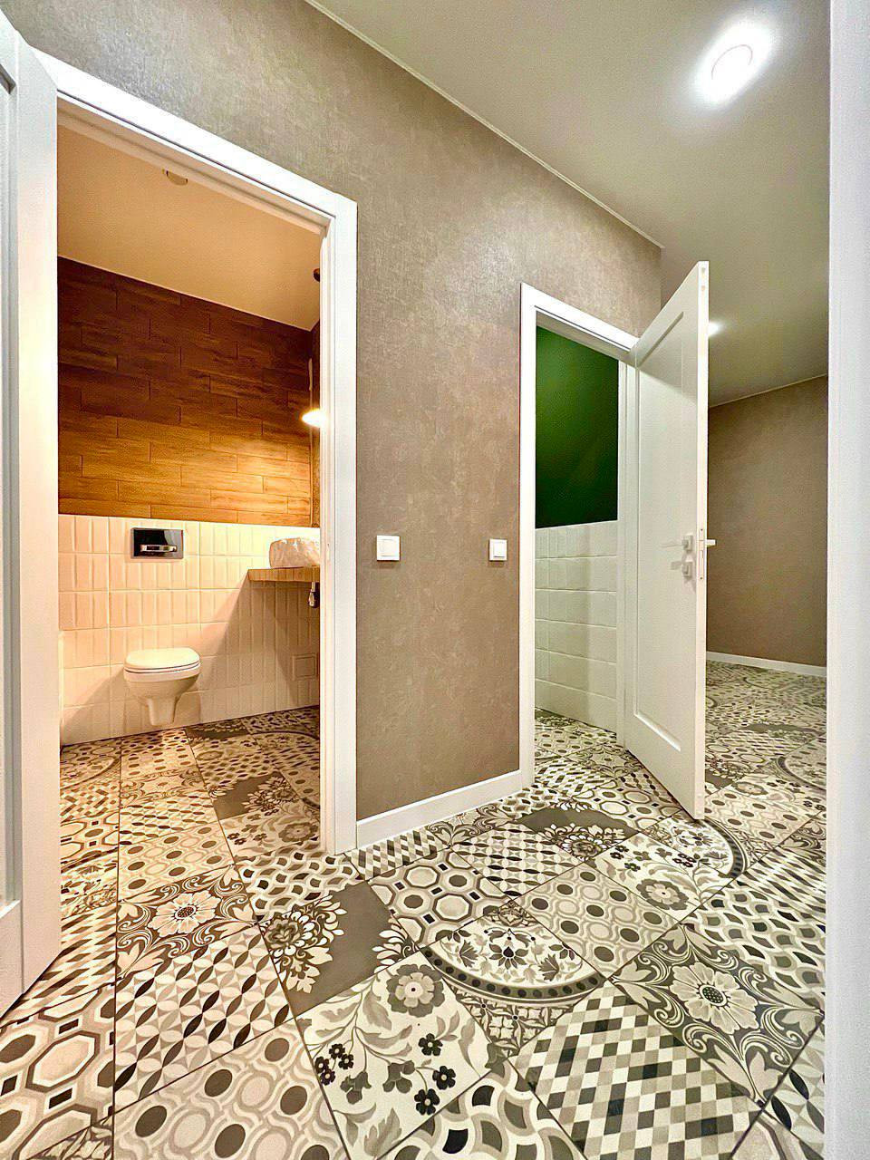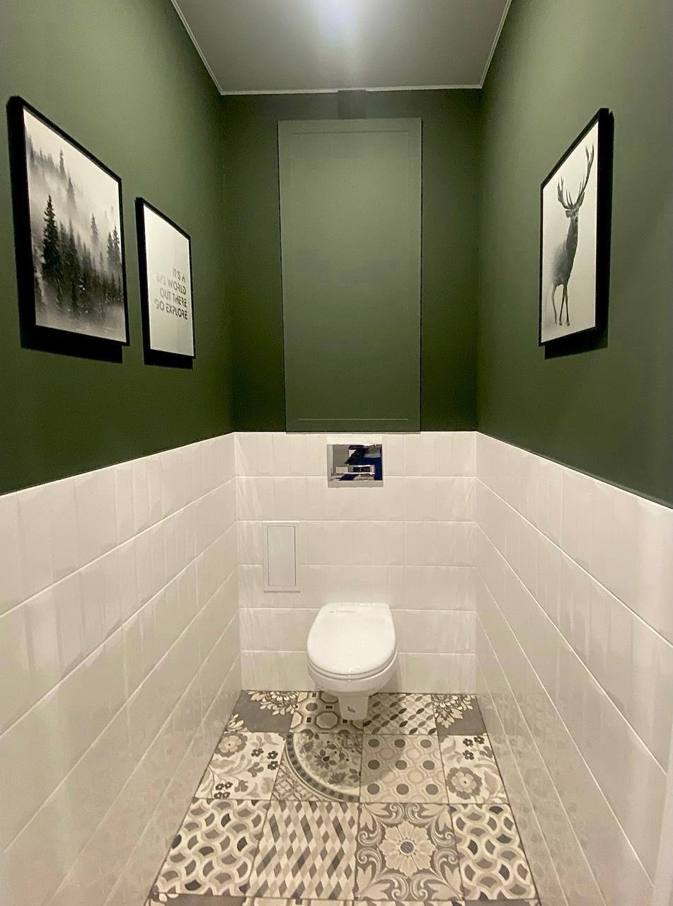 14. ФИШКИ ДИЗАЙНА И ОТДЕЛКИ. Керамо/гранит на полу обединяет пространство коридор/ванная, туалет. Нет порогов, стыков. Все гладко. Зелёный акцентный цвет подбирали один в один по всей квартире. Например дверца шкафа в туалете изготовлена там же где и кухня. Даже решетка вентиляции покрашена в цвет стен вручную. Этот прием объединяет пространство. Такой цвет по ВАСТУ и фен -шуй помогает процветанию, устойчивости, росту и сохранению.